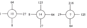और 8, 27, 64, 125 का घनमूल जो कि 2, 3, 4, 5 है, का योग [2+3+4+5=(14)]