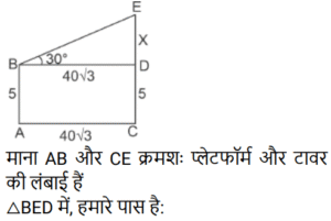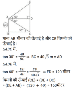 ऊँचाई और दूरी Part – 2Total Questions: 71. एक टावर के शीर्ष से चिमनी के शीर्ष का उद्र्वयन कोण 60° है और टावर के शीर्ष से चिमनी के पाद बिंदु का अवनमन कोण 30° है। यदि टावर की ऊँचाई 40 मीटर है, तो चिमनी की ऊँचाई ज्ञात करें। [RRB JE 02/06/2019 (Evening)](a) 160 मीटर (b) 175 मीटर(c) 192 मीटर (d) 220 मीटरCorrect Answer: (a) 160 मीटर Solution:2. एक सीढ़ी दीवार के सहारे इस प्रकार रखी गयी है की इसका आधार दीवार से 5m की दूरी पर है और इसका शीर्ष जमीन से 12m की ऊँचाई पर स्थित खिड़की को स्पर्श करता है। सीढ़ी की लम्बाई क्या होगी ? [ALP Tier II 21/01/2019 (Afternoon)](a) 16m (b) 15m (c) 24m (d) 13mCorrect Answer: (d) 13mSolution:3. जब किसी वृक्ष की छाया की लम्बाई वृक्ष की ऊँचाई से √3 गुनी हो, तो सूर्य का उद्र्वयन कोण क्या होगा ? [ALP Tier II 21/01/2019 (Afternoon)](a) 30° (b) 60° (c) 75° (d) 45°Correct Answer: (a) 30° Solution:4. 5 मीटर ऊँचे किसी प्लेटफार्म से किसी टावर का उद्र्वयन कोण 30° है। यदि प्लेटफार्म और टावर के बीच की दूरी 40/√3 मीटर हो तो टावर की ऊँचाई कितनी है? (मीटर में) [RRB ALP 13/08/2018 (Afternoon)](a) 40 (b) 30√3 (c) 20√3 (d) 45Correct Answer: (d) 45Solution:5. किसी प्लेटफार्म के ऊपर से, एक टावर का उद्र्वयन कोण 30° था। टावर 45 मीटर ऊँचा था और प्लेटफार्म तथा टावर के बीच क्षैतिज दूरी 40 √3 मीटर थी। प्लेटफार्म की ऊँचाई कितनी थी ? [RRB ALP 14/08/2018 (Afternoon)](a) 45√3 (b) 40 (c) 5(d) 20√3Correct Answer: (c) 5Solution:6. एक इमारत के शीर्ष से एक टावर के शीर्ष और पाद का उद्र्वयन और अवनमन कोण क्रमशः 60° और 30° हैं। यदि इमारत की ऊँचाई 5 मीटर है, तो टावर की ऊँचाई (मीटर में) ज्ञात कीजिए। [RRB ALP 14/08/2018 (Evening)](a) 10√3 (b) 20(c) 5√3 (d) 15Correct Answer: (b) 20Solution:7. जमीन पर खड़ी एक महिला की प्रारंभिक स्थिति से, 36 मीटर लम्बे टावर के ऊपर का उद्र्वयन कोण 60° था। वह इस तरह से दूर चली गई कि टावर का आधार, उसकी प्रारंभिक स्थिति और अंतिम स्थान एक सीधी रेखा में थे। टावर के शिखर से उसकी अंतिम स्थिति का उद्र्वयन कोण 30° था। वह अपनी प्रारंभिक स्थिति से कितनी दूर (मीटर में) चली गई? [RRB ALP 21/08/2018 (Afternoon)](a) 24 (b) 12√3 (c) 36√3 (d) 24√3Correct Answer: (d) 24√3Solution:चलती है|Submit Quiz