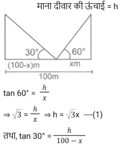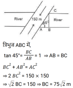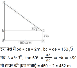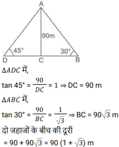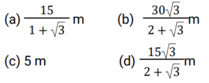 ऊँचाई और दूरीTotal Questions: 501. एक 1.75 m लम्बे व्यक्ति की छाया की लम्बाई 2 m है। उसी समय पर, एक लैम्प पोस्ट की छाया की लम्बाई 6.4 m है। लैम्प पोस्ट की ऊँचाई ज्ञात कीजिए [Group D 28/09/2022 (Morning)](a) 5.6 m (b) 5.9 m (c) 5.7 m (d) 5.8 mCorrect Answer: (a) 5.6 m Solution:2. एक चट्टान पर एक आदमी 30° के अवनमन कोण पर एक नाव को देखता है, जो एक समान गति से प्रक्षेप के ठीक नीचे एक बिन्दु पर किनारे की ओर आ रही है। दस मिनट बाद, नाव का अवनमन कोण 60° पा जाता है। नाव द्वारा किनारे तक पहुँचने में लगा कुल समय ज्ञात कीजिए [NTPC CBT II Level 6 (09/05/2022) Shift 2](a) 15 मिनट (b) 16 मिनट (c) 18 मिनट (d) 14 मिनटCorrect Answer: (a) 15 मिनट Solution:3. सड़क के दोनों ओर दो खम्भे हैं। दो खम्भों के बीच एक 20 मीटर लम्बी सीढ़ी रखी गई है। जब सीढ़ी एक खम्भे पर टिकी होती है, तो वह सड़क के साथ 60° का कोण बनाती है और जब वह दूसरे खम्भे की ओर विपरीत मोड़ा जाता है, तो वह सड़क के साथ 30° का कोण बनाती है। सड़क की चौड़ाई (m में) ज्ञात कीजिए। (√3 = 1.732 का उपयोग कीजिए) [NTPC CBT II Level 2 (16/06/2022) Shift 2](a) 3.464 (b) 0.3264 (c) 32.64 (d) 34.64Correct Answer: (d) 34.64Solution:4. 100 m चौड़ी एक सड़क के दोनों ओर समान ऊँचाई की दो दीवारें हैं। सड़क के एक बिन्दु पर खड़ी सीढ़ी दीवारों के साथ इस प्रकार टिकी है कि वह बिन्दु 60° और 30° से क्रमशः उन कोणों को बनाती है। ऐसी सीढ़ी की लम्बाई कितनी है? [NTPC CBT – I 05/01/2021 (Evening)](a) 75m (b) 50√3 m(c) 50√3/3 m (d) 50mCorrect Answer: (b) 50√3 mSolution:5. एक नदी पर बना एक पुल नदी के किनारों से 45° का कोण बनाता है जैसा कि चित्र में दिखाया गया है। यदि पुल की लम्बाई 150 m है, तो नदी की चौड़ाई कितनी है? [NTPC CBT – I 11/01/2021 (Morning)](a) 63√2 m (b) 75√2 m(c) 70 m (d) 65 mCorrect Answer: (b) 75√2 mSolution:6. एक 15 मीटर ऊँचा पेड़ हवा से इस तरह टूट जाता है कि उसका शीर्ष जमीन को छूता है और जमीन के साथ 60° का कोण बनाता है। नीचे से कितनी ऊँचाई पर पेड़ टूटा है? [NTPC CBT – I 11/01/2021 (Evening)](a)(b)(c)(d)Correct Answer: (d)Solution:7. 2 m लम्बा एक पर्यवेक्षक एक टावर से 150 √3m दूर है। उसकी आँख से टावर के शीर्ष तक का उन्नयन कोण 60° है। टावर की ऊँचाई कितनी है? [NTPC CBT – I 16/01/2021 (Evening)](a) 452 m (b) 480 m (c) 400 m (d) 450 mCorrect Answer: (a) 452 m Solution:8. एक छोटा लड़का एक ध्वजदंड से कुछ दूरी पर खड़ा है। जब वह ध्वज को देखता है, तो उसकी आंख से ध्वज के शीर्ष का उन्नयन कोण 60° है। यदि ध्वजदंड की ऊँचाई 30 फुट है, तो ध्वजदंड से लड़के की दूरी ज्ञात कीजिए। [NTPC CBT – I 21/03/2021 (Morning)](a) 12√3 ft (b) 15√3 ft(c) 20√3 ft (d) 10√3 ftCorrect Answer: (d) 10√3 ftSolution:9. एक प्रकाशस्तम्भ के दो किनारों पर समुद्र में दो जहाज चल रहे हैं। दो जहाजों से देखे गए प्रकाशस्तम्भ के शीर्ष के उन्नयन कोण क्रमशः 30° और 45° हैं। यदि लाइट हाउस 90 मीटर ऊँचा है, तो दोनों जहाजों के बीच की दूरी ________ है। [NTPC CBT – I 03/04/2021 (Morning)](a) 90√3 m(b) 90(√3 + 1) m(c) 100 m(d) 90(√3 − 1) mCorrect Answer: (b) 90(√3 + 1) mSolution:10. उड़ान बिन्दु से 300 मीटर की दूरी से देखे जाने पर ऊर्ध्वाधर में ऊपर की ओर जा रहे हवा के गुब्बारे का उन्नयन कोण पहले 10:00 बजे 30° है, बदलकर 10:02 बजे 60° हो जाता है। गुब्बारा किस दिशा में चला जा रहा था ज्ञात कीजिए। [RRB JE 22/05/2019 (Evening)](a) 2.18 मीटर/सेकण्ड(b) 2 मीटर/सेकण