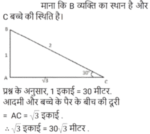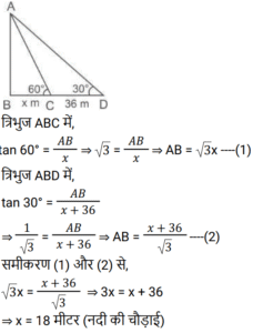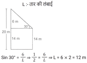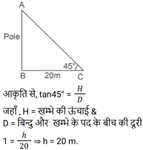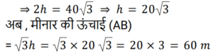 ऊँचाई और दूरीTotal Questions: 5011. सूर्य का उन्नयन कोण 60° से बदलकर 30° होने पर, भूतल पर स्थित किसी मीनार की छाया की लम्बाई में 40√3 मीटर की वृद्धि हो जाती है। मीनार की ऊँचाई ज्ञात कीजिये। [Group D 18/08/2022 (Evening)](a) 70 m (b) 60 m(c) 40 m (d) 50 mCorrect Answer: (b) 60 mSolution:12. 30 m ऊँचाई के टावर के शीर्ष से, एक आदमी 30 डिग्री के अवनमन के कोण पर जमीन पर खेल रहे एक बच्चे को देख रहा है। टावर के पाद और बच्चे के बीच की दूरी ज्ञात कीजिए। (गणना के लिए आदमी और बच्चे की ऊँचाई को नगण्य लीजिये) [Level 6 (09/05/2022) Shift 2](a) 53 m (b) 30/√3 m (c) 52√3 m (d) 30√3 mCorrect Answer: (d) 30√3 mSolution:13. किसी ऊर्ध्वाधर मीनार के शीर्ष पर मौजूद एक व्यक्ति, एकसमान चाल से चलती हुई कार को सीधी अपनी ओर आते हुए देखता है। यदि अवनमन कोण को 45° से बदलकर 60° होने में 10 मिनट का समय लगता है, तो कार कितने समय में मीनार तक पहुँचेगी? [Level 5 (15/06/2022) Shift 2](a) (15 + 5√3) मिनट(b) (3 + 5√3) मिनट(c) (15 + 8√3) मिनट(d) (15 + 3√3) मिनटCorrect Answer: (a) (15 + 5√3) मिनटSolution:14. भूतल पर स्थित किसी बिंदु से एक हवाई जहाज का उन्नयन कोण 45° है। क्षैतिज रूप से 12 सेकेंड की उड़ान के बाद, उन्नयन कोण बदलकर 30° हो जाता है। यदि हवाई जहाज 2400 m की ऊँचाई पर उड़ रहा है, तो हवाई जहाज की चाल (km/h में) ज्ञात कीजिए। [Level 5 (15/06/2022) Shift 3](a) 72(1 + √3) (b) 720(√3 + 1) (c) 720(√3 − 1)(d) 72(√3 − 1)Correct Answer: (c) 720(√3 − 1)Solution:15. दो टावरों के बीच क्षैतिज दूरी 40√3 m है। पहले टावर के शिखर का अवनमन कोण जब दूसरे टावर की चोटी से देखा जाए तो 30° है। यदि दूसरे टावर की ऊँचाई 130 m है, तो पहले टावर की ऊँचाई ज्ञात कीजिये। [RRB NTPC 30/12/2020 (Evening)](a) 80 m (b) 95 m (c) 85 m (d) 90 mCorrect Answer: (d) 90 mSolution:16. एक खम्भे के पाद से 20 मीटर की दूरी पर एक बिन्दु से खम्भे का उन्नयन कोण 45° है। खम्भे की ऊँचाई ज्ञात कीजिए। [RRB NTPC 04/01/2021 (Morning)](a) 20√2 m (b) 10 m (c) 20 m(d) 15 mCorrect Answer: (c) 20 mSolution:17. जब 10 m ऊँचाई वाले खम्भे की छाया 10√3 m होती है, तो सूर्य का उन्नयन कोण कितना है? [RRB NTPC 07/01/2021 (Morning)](a) 30° (b) 60° (c) 90° (d) 75°Correct Answer: (a) 30° Solution:18. 20 और 14 मीटर ऊँचाई वाले दो खम्भों को एक तार द्वारा शीर्ष पर जोड़ा जाता है जो क्षैतिज के साथ 30° का कोण बनाता है। तार की लम्बाई कितनी है? [RRB NTPC 08/01/2021 (Morning)](a) 12 m (b) 10 m (c) 16 m (d) 14 mCorrect Answer: (a) 12 m Solution:19. एक नदी के किनारे खड़ा एक व्यक्ति देखता है कि एक पेड़ द्वारा विपरीत किनारे पर बनाया गया कोण 60° है। वह किनारे पर 36 m पीछे चलता है और कोण 30° पाता है। नदी की चौड़ाई कितनी है? [RRB NTPC 08/01/2021 (Morning)](a) 10 मीटर (b) 18 मीटर(c) 20 मीटर (d) 28 मीटरCorrect Answer: (b) 18 मीटरSolution:20. समतल जमीन पर खड़े x और y ऊँचाई के दो टावरों के शीर्ष, उनके पाद बिंदु को मिलाने वाली रेखा के मध्य बिंदु पर क्रमशः 60° और 30° के कोण अंतरित करते हैं। x : y का मान क्या है? [RRB NTPC 09/01/2021 (Morning)](a) 2 : 1 (b) 1 : 2 (c) 1 : 3 (d) 3 : 1Correct Answer: (d) 3 : 1Solution:Submit Quiz« Previous12345Next »