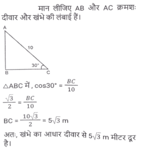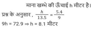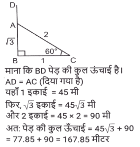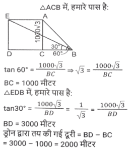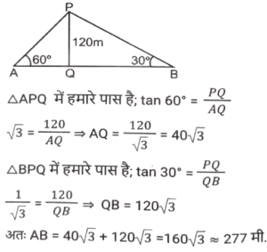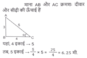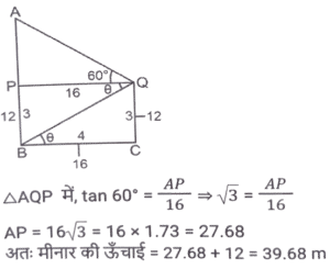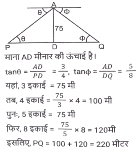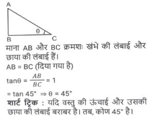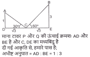 ऊंचाई और दूरीTotal Questions: 4511. दो मीनारों P और Q के ठीक बीच स्थित एक बिंदु से उनके शीर्ष के उन्नयन कोण क्रमशः 30° और 60° हैं। P और Q की ऊंचाई का अनुपात क्या है ? [SSC CGL Tier II (12/09/2019)](a) 1:3(b) 1:2(c) 1: 2√3(d) 2: 3√3Correct Answer: (a) 1:3Solution:12. भूमि पर स्थित किसी बिंदु से एक उड़ते हुए ड्रोन का उन्नयन कोण 60° है। 5 सेकंड तक उड़ने के बाद उन्नयन कोण कम होकर 30° हो जाता है। यदि ड्रोन क्षैतिज रूप से 1000√3 मीटर की निश्चित ऊंचाई पर उड़ान भर रहा है, तो ड्रोन द्वारा तय की गयी दूरी (मीटर में) ज्ञात करें । [SSC CPO 16/03/2019 (Afternoon)](a) 2000(b) 1000(c) 3000(d) 4000Correct Answer: (a) 2000Solution:13. दिन के किसी समय में 5.4 मीटर ऊँचे पेड़ की 9 मीटर की परछाईं बनती है। यदि इसी समय एक खंभे की परछाईं 13.5 मीटर की है, तो खंभे की ऊंचाई ज्ञात करें। [SSC CPO 16/03/2019 (Morning)](a) 8.1 m(b) 9.9 m(c) 7.2 m(d) 6.3 mCorrect Answer: (a) 8.1 mSolution:14. किसी खंभे के शीर्ष से सूर्य का उन्नयन कोण क्या है जब इसकी ऊँचाई इसकी छाया की लम्बाई के बराबर हो ? [SSC CPO 15/03/2019 (Evening)](a) 30°(b) 90°(c) 45°(d) 60°Correct Answer: (c) 45°Solution:15. टूटे हुए एक पेड़ का शीर्ष पेड़ की जड़ से 45 m दूर 60° के कोण पर भूमि को स्पर्श करता है। पेड़ की कुल ऊंचाई (मीटर में) क्या होगी ? [SSC CPO 14/03/2019 (Evening)](√3 = 1.73 और √2 = 1.41 का उपयोग कीजिये )(a) 153.45(b) 141.3(c) 167.85(d) 137.24Correct Answer: (c) 167.85Solution:16. 120 m ऊँची लाइट हाउस के शीर्ष से इसके आधार के विपरीत दिशाओं में दो जहाज़ो का अवनमन कोण 30° और 60° है। जहाज़ों के बीच की दूरी ज्ञात करें। [SSC CPO 14/03/2019 (Morning)](a) 327 m(b) 127 m(c) 277 m(d) 177 mCorrect Answer: (c) 277 mSolution:17. 75 मी ऊँची मीनार के शीर्ष से मीनार के तल के विपरीत दिशा में भूमि पर स्थित दो बिन्दुओं P और Q का अवनमन कोण θ तथा Φ इस प्रकार है कि tanθ = 3/4 और tanΦ = 5/8 है। बिंदु P और Q के बीच की दूरी (मीटर में) ज्ञात करें। [SSC CPO 13/03/2019 (Morning)](a) 190(b) 200(c) 180(d) 220Correct Answer: (d) 220Solution:18. 12 m ऊँचे भवन के शीर्ष से टावर के शीर्ष का उन्नयन कोण 60° है और टावर के तल का अवनमन कोण θ इस प्रकार है कि tanθ = 3/4 है I इस टावर की ऊंचाई क्या है ? (√3 = 1.73) [SSC CPO 12/03/2019 (Evening)](a) 41.41(b) 36.22(c) 39.68(d) 37.95Correct Answer: (c) 39.68Solution:19. किसी दीवार पर झुकी हुई एक सीढ़ी क्षैतिज भूमि के साथ कोण α इस प्रकार बनाती है कि tanα = 3/4 है। यदि सीढ़ी का तल दीवार से 5 मीटर दूर है तो सीढ़ी की लंबाई (मीटर में) ज्ञात करें। [SSC CPO 12/03/2019 (Morning)](a) 5.25(b) 3.75(c) 6.25(d) 4.5Correct Answer: (c) 6.25Solution:20. 10 m लंबा एक खंभा क्षैतिज (जमीन) से 30° का कोण बनाते हुए एक ऊर्ध्वाधर दीवार AB पर तिरछा टिका हुआ है। ज्ञात कीजिए कि खंभे का पाद दीवार से कितनी दूर (मीटर में) है। [SSCC CGL 10/09/2024 (1st Shift)](a) 15(b) 5/√3(c) 10(d) 5√3Correct Answer: (d) 5√3Solution:Submit Quiz« Previous12345Next »