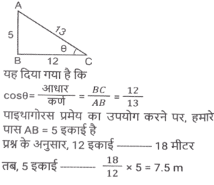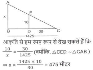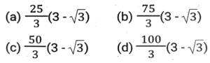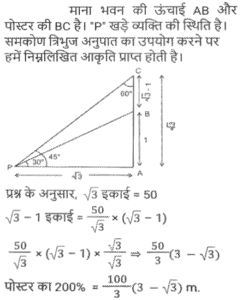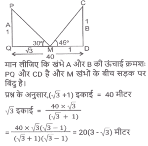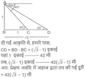 ऊंचाई और दूरीTotal Questions: 4541. एक इमारत के ऊपर एक पोस्टर लगा है। एक व्यक्ति इमारत से 50 मीटर की दूरी पर जमीन पर खड़ा है। पोस्टर के शीर्ष और पोस्टर के तल का उन्नयन कोण क्रमशः 45° और 30° हैं। पोस्टर की ऊंचाई का 200 प्रतिशत (मीटर में) क्या है? [SSC CGL 18/04/2022 (Afternoon)](a)(b)(c)(d)Correct Answer: (d)Solution:42. समान ऊंचाई के दो स्तंभ A और B 40 मीटर चौड़ी सड़क के विपरीत दिशा में हैं। खंभों के बीच सड़क पर, एक बिंदु से खंभों A और B के शीर्षों के उन्नयन कोण क्रमशः 30° और 45° हैं। स्तंभ A से बिंदु की दूरी (मीटर में) क्या है? [SSC CGL Tier II (03/02/2022)](a) 40(√3 - 1)(b) 20(2 - √3)(c) 20(3 - √3)(d) 39√3Correct Answer: (c) 20(3 - √3)Solution:43. समुद्र तल से 42 मीटर ऊंचे एक प्रकाशस्तंभ के शीर्ष से अवलोकन करने पर, इसकी ओर सीधे आ रहे जहाज का अवनमन कोण 30° से 45° हो जाता है। अवलोकन की अवधि के दौरान जहाज द्वारा तय की गई दूरी क्या है? [SSC CHSL 04/08/2021 (Evening)](a) 42(1 - √3)(b) 42(√3 + 1)(c) 42(√3 - 1)(d) 42Correct Answer: (c) 42(√3 - 1)Solution:44. एक व्यक्ति एक मॉल के पास सड़क पर खड़ा था। वह मॉल से 1425 मीटर दूर था और सड़क से मॉल के शीर्ष को इस तरह से देखने में सक्षम था कि पेड़ का शीर्ष, जो उसके और मॉल के बीच में है, मॉल के शीर्ष के साथ बिल्कुल दृष्टि की कतार में थी। पेड़ की ऊंचाई 10 मीटर है और यह उससे 30 मीटर दूर है। मॉल की ऊंचाई (मीटर में) क्या है ? [SSC CPO 23/11/2020 (Morning)](a) 475(b) 300(c) 425(d) 525Correct Answer: (a) 475Solution:45. भूतल पर एक अधोलंब खम्भे की परछाईं की लंबाई 18 मी है। यदि उस समय सूर्य की ऊँचाई का उन्नयन कोण θ है, जैसे कि cosθ = 12/13 है, तो खम्भे की ऊँचाई (मीटर में) क्या है? [SSC CPO 23/11/2020 (Evening)](a) 18(b) 9(c) 7.5(d) 12Correct Answer: (c) 7.5Solution:Submit Quiz« Previous12345