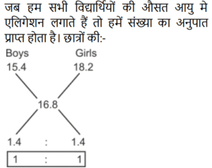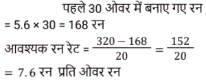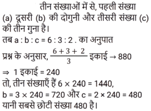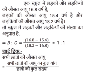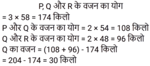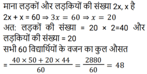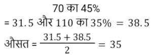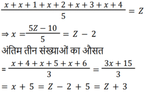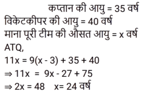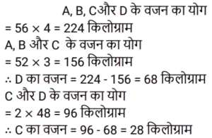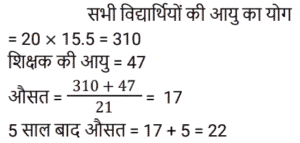 औसत Part-2Total Questions: 5011. 70 का 45% और 110 का 35% का औसत ज्ञात कीजिए। [Level 5 (15/06/2022) Shift 2](a) 34.5 (b) 35(c) 37.5 (d) 35.5Correct Answer: (b) 35Solution:12. सात क्रमागत संख्याओं के एक अनुक्रम पर विचार कीजिए। यदि पहली पाँच संख्याओं का औसत ‘z’ है, तो अंतिम तीन संख्याओं का औसत ज्ञात कीजिए। [Level 2 (16/06/2022) Shift 2](a) z + 5 (b) z + 1 (c) z + 7 (d) z + 3Correct Answer: (d) z + 3Solution:13. एक वनडे मैच में टीम इंडिया ने पहले 30 ओवरों में प्रति ओवर 5.6 रन की औसत से रन बनाए। शेष 20 ओवरों में 320 रन के कुल लक्ष्य को पूरा करने के लिए टीम को प्रति ओवर कितने रन बनाने की आवश्यकता है? [Level 3 (17/06/2022) Shift 2](a) 8.9 रन प्रति ओवर (b) 6.4 रन प्रति ओवर (c) 7.6 रन प्रति ओवर(d) 4.6 रन प्रति ओवरCorrect Answer: (c) 7.6 रन प्रति ओवरSolution:14. किसी समूह के 60 विद्यार्थियों में से, लड़कों की संख्या और लड़कियों की संख्या का अनुपात 2:1 है। यदि लड़कों का औसत वजन 50 kg और लड़कियों का औसत वजन 44 kg है, तो समूह के सभी विद्यार्थियों का औसत वजन (kg में) कितना होगा? [Level 3 (17/06/2022) Shift 2](a) 48.25 (b) 47.5 (c) 49 (d) 48Correct Answer: (d) 48Solution:15. एक स्कूल में लड़के और लड़कियों की औसत आयु 16.8 वर्ष है। लड़कों की औसत आयु 15.4 वर्ष है, और लड़कियों की औसत आयु 18.2 वर्ष है। स्कूल में लड़कों और लड़कियों की संख्या का अनुपात कितना है? [RRB NTPC 28/12/2020 (Evening)](a) 2 : 3 (b) 1 : 1(c) 3 : 2 (d) 3 : 5Correct Answer: (b) 1 : 1Solution:16. तीन संख्याओं में से पहली संख्या दूसरी संख्या की दुगनी और तीसरी संख्या की तिगुनी है। यदि तीनों संख्याओं का औसत 880 है, तो सबसे छोटी संख्या क्या होगी? [RRB NTPC 30/12/2020 (Evening)](a) 480 (b) 840 (c) 460 (d) 420Correct Answer: (a) 480 Solution:17. P, Q और R का औसत वजन 58 kg है। यदि P और Q का औसत वजन 54 kg है और Q और R का औसत वजन 48 kg है, तो Q का वजन कितना होगा? [RRB NTPC 04/01/2021 (Evening) ](a) 26 kg(b) 32 kg(c) 30 kg(d) 28 kgCorrect Answer: (c) 30 kgSolution:18. 11 सदस्यों वाली एक क्रिकेट टीम के कप्तान की आयु 35 वर्ष है और विकेट कीपर कप्तान से 5 वर्ष बड़ा है। यदि इन दोनों की आयु को ना गिना जाए, तो शेष खिलाड़ियों की औसत आयु पूरी टीम की औसत आयु से तीन वर्ष कम है। पूरी टीम की औसत आयु कितनी है? [RRB NTPC 04/01/2021 (Evening)](a) 24 वर्ष (b) 28 वर्ष (c) 26 वर्ष (d) 25 वर्षCorrect Answer: (a) 24 वर्ष Solution:19. वर्तमान में दसवीं कक्षा के 20 छात्रों की औसत आयु 15.5 वर्ष है। कक्षा शिक्षक की वर्तमान आयु 47 वर्ष है। 5 वर्ष बाद छात्रों और कक्षा शिक्षक की औसत आयु क्या होगी? [RRB NTPC 08/01/2021 (Morning)](a) 22 वर्ष (b) 21.8 वर्ष (c) 21.5 वर्ष (d) 22.5 वर्षCorrect Answer: (a) 22 वर्ष Solution:20. A, B, C और D का औसत भार 56 kg है। यदि A, B और C का औसत वजन 52 kg है और C और D का औसत वजन 48 kg है, तो C का भार कितना होगा? [RRB NTPC 08/01/2021 (Evening)](a) 30 kg (b) 36 kg (c) 28 kg(d) 34 kgCorrect Answer: (c) 28 kgSolution:Submit Quiz« Previous12345Next »