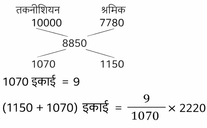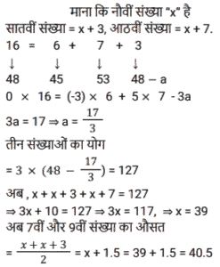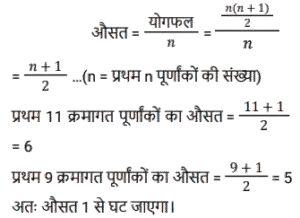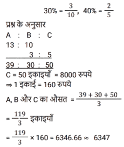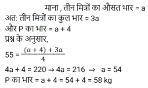 औसत (SSC) (Part-VI)Total Questions: 5031. अपने पूरे स्कूली शिक्षा के दौरान, विज्ञान में जॉन के औसत अंक 80% थे और गणित में औसत अंक 90% थे यदि विज्ञान और गणित में उसके संयुक्त औसत अंक 84% थे, यदि विज्ञान में जॉन के कुल अंक 54,000 थे, तो जॉन के गणित में प्राप्त कुल अंक कितने है? [SSC CHSL 02/06/2022 (Evening)](a) 90000(b) 81000(c) 36000(d) 60000Correct Answer: (c) 36000Solution:3 इकाई = 54000 ∴ 2 इकाई = (54000/3) × 2 = 3600032. 36 छात्रों के एक समूह की औसत वर्तमान आयु 14 वर्ष है। जब शिक्षक की आयु शामिल कर ली जाती है, तो औसत आयु एक से बढ़ जाती है। शिक्षक की आयु (वर्षों में) की गणना करें ? [SSC CHSL 03/06/2022 (Morning)](a) 53(b) 54(c) 52(d) 51Correct Answer: (d) 51Solution:33. एक क्रिकेट टीम (दस खिलाड़ियों और एक कप्तान का) का औसत स्कोर 32 है। दस खिलाड़ियों के स्कोर 22, 11, 5, 34, 21, 32, 0, 28, 9 और 53 हैं। कप्तान का स्कोर क्या है ? [SSC CHSL 06/06/2022 (Morning)](a) 129(b) 137(c) 115(d) 121Correct Answer: (b) 137Solution:34. एक निश्चित क्रम में दी गई पांच संख्याओं का औसत 32 है। पहली तीन संख्याओं का औसत 28 है, तथा अंतिम तीन संख्याओं का औसत 34 है। पहली दो संख्याओं का औसत क्या है? [SSC CHSL 07/06/2022 (Afternoon)](a) 29(b) 30(c) 27(d) 28Correct Answer: (a) 29Solution:35. एक कारखाने में सभी श्रमिकों का प्रति व्यक्ति औसत वेतन ₹8,850 है। यदि 9 तकनीशियनों का प्रति व्यक्ति औसत वेतन ₹10,000 है, और बाकी का प्रति व्यक्ति औसत वेतन ₹7,780 है, तो कारखाने में श्रमिकों की कुल संख्या ज्ञात कीजिए। (निकटतम पूर्णांक में) [SSC CHSL 07/06/2022 (Afternoon)](a) 18(b) 22(c) 24(d) 16Correct Answer: (a) 18Solution:36. एक परिवार का औसत मासिक खर्च पहले चार महीनों के लिए ₹13,750 है, अगले तीन महीनों के लिए ₹11,750 है और अंतिम पांच महीनों के लिए ₹31,750 है। यदि परिवार पूरे वर्ष के दौरान ₹15,550 की बचत करता है, तो वर्ष के दौरान परिवार की औसत मासिक आय ज्ञात कीजिए ? (निकटतम पूर्णांक में) [SSC CHSL 10/06/2022 (Afternoon)](a) 21,055(b) 22,045(c) 23,040(d) 22,000Correct Answer: (b) 22,045Solution:37. P और उसके तीन दोस्तों का औसत वजन 55 kg है। यदि P अपने तीन दोस्तों के औसत वजन से 4 किलो अधिक है, तो P का वजन (kg में) क्या है ? [SSC CGL 11/04/2022 (Morning)](a) 54(b) 58(c) 62(d) 60Correct Answer: (b) 58Solution:38. सोलह संख्याओं का औसत 48 है। इनमें से पहली छह संख्याओं का औसत 45 है और अंतिम सात संख्याओं का औसत 53 है। सातवीं और आठवीं संख्या क्रमशः, नौवीं संख्या से 3 और 7 बड़ी है। नौवीं और सातवीं संख्या का औसत क्या है? [SSC CGL 13/04/2022 (Afternoon)](a) 41.5(b) 40.5(c) 42(d) 39Correct Answer: (b) 40.5Solution:39. A ने B से 30% अधिक निवेश किया। B ने C से 40% कम निवेश किया, C ने रु 8,000 का निवेश किया। उन सभी द्वारा निवेश की गई कुल राशि का औसत (निकटतम रुपये में) कितना है? [SSC CGL 19/4/2022 (Morning)](a) 6,347(b) 6,417(c) 6,215(d) 6,143Correct Answer: (a) 6,347Solution:40. ग्यारह क्रमागत धनात्मक पूर्णांकों का औसत d है। यदि अंतिम दो संख्याओं को हटा दिया जाए, तो औसत में कितनी वृद्धि या कमी होगी? [SSC CGL 20/04/2022 (Morning)](a) 1 से घट जाएगा।(b) 2 से बढ़ जाएगा।(c) 2 से घट जाएगा।(d) 1 से बढ़ जाएगा।Correct Answer: (a) 1 से घट जाएगा।Solution:Submit Quiz« Previous12345Next »