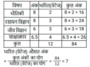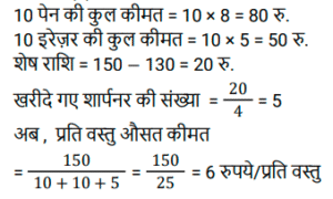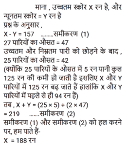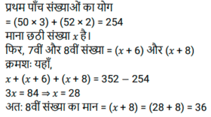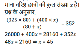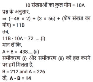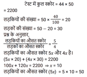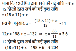 औसत (SSC)Total Questions: 5011. एक स्कूल भ्रमण के दौरान जूनियर स्कूल के प्रत्येक छात्र से ₹325 शुल्क लिया गया और सीनियर स्कूल के प्रत्येक छात्र से ₹400 शुल्क लिया गया। यदि जूनियर स्कूल के 80 छात्र थे और प्रति छात्र संयुक्त औसत शुल्क ₹352 था, तो सीनियर स्कूल के कितने छात्र भ्रमण के लिए गए थे [SSC CGL 24/07/2023 (1st shift)](a) 55(b) 45(c) 50(d) 40Correct Answer: (b) 45Solution:12. B, ₹150 में ₹8 प्रति पेन के मूल्य से 10 पेन, ₹5 प्रति रबड़ के मूल्य से 10 रबड़ और ₹4 प्रति कटर के मूल्य से कुछ कटर खरीदता है। प्रत्येक वस्तु का औसत मूल्य ₹ में क्या है? [SSC CGL 19/07/2023 (3rd shift)](a) 8(b) 7(c) 10(d) 6Correct Answer: (d) 6Solution:13. एक कॉलेज के 20 विद्यार्थी एक होटल में गए। उनमें से 19 में से प्रत्येक ने अपने भोजन पर ₹175 खर्च किए और 20वें विद्यार्थी ने सभी 20 के औसत से ₹19 अधिक खर्च किए। उनके द्वारा खर्च की गई कुल राशि ज्ञात करें। [SSC CGL 17/07/2023 (4th shift)](a) ₹3,490(b) ₹3,540(c) ₹3,520(d) ₹3,500Correct Answer: (c) ₹3,520Solution:14. एक टेस्ट में 50 छात्रों का औसत स्कोर 44 है। कुल छात्रों में से 40% छात्र लड़कियां हैं और शेष लड़के हैं। लड़कों का औसत स्कोर, लड़कियों के औसत स्कोर की तुलना में 20% कम है। लड़कियों का औसत स्कोर क्या है? [Higher Secondary 27/06/2023 (Shift-3)](a) 50(b) 54(c) 48(d) 52Correct Answer: (a) 50Solution:15. A 10 दी गई संख्याओं का औसत है। B, 2 संख्याओं को 3 अन्य भिन्न संख्याओं द्वारा प्रतिस्थापित करने के बाद का औसत है। हटाई गई संख्याओं का औसत 48 है और नई शामिल की गयी संख्याओं का औसत 56 है। यदि A + B = 438 है, तो A - B का मान ज्ञात कीजिए । [Matriculation Level 27/06/2023 (Shift-2)](a) 21(b) 14(c) 12(d) 26Correct Answer: (b) 14Solution:16. 8 संख्याओं का औसत 44 है। पहली तीन संख्याओं का औसत 50 है और अगली दो संख्याओं का औसत 52 है। यदि छठी संख्या क्रमशः सातवीं और आठवीं संख्या से 6 और 8 कम है, तो आठवीं संख्या का मान क्या है? [SSC MTS 16/05/2023 (Morning)](a) 36(b) 32(c) 40(d) 56Correct Answer: (a) 36Solution:17. ग्यारह दोस्तों में हर एक ने एक टूर पर Rs. 18 खर्च किए और बारहवें दोस्त ने उन सभी बारह दोस्तों के औसत खर्च से Rs. 11 कम खर्च किए। बारह दोस्तों द्वारा खर्च की गई कुल धनराशि कितनी है ? [SSC MTS 02/05/2023 (Afternoon)](a) Rs.204(b) Rs.215(c) Rs.212(d) Rs.208Correct Answer: (a) Rs.204Solution:18. सोनाली ने एक स्कूल में साइंस टीचर की नौकरी के लिए अप्लाई किया था। नौकरी के लिए परीक्षा में, उसने भौतिकी में 8, रसायन विज्ञान में 8, जीव विज्ञान में 6 और साक्षात्कार में 6.5 अंक प्राप्त किए। फाइनल स्कोर की गणना के लिए क्रमशः 2, 3, 3 और 4 का वेटेज भौतिकी, रसायन विज्ञान, जीव विज्ञान और साक्षात्कार को दिया गया था। सोनाली का भारित (वेटेज) औसत अंक क्या है? [SSC CGL 06/12/2022 (1st Shift)](a) 7(b) 8.4(c) 7.2(d) 21Correct Answer: (a) 7Solution:19. 27 पारियों के लिए किसी क्रिकेट खिलाड़ी का बल्लेबाजी औसत 47 रन है। एक पारी में उसका उच्चतम स्कोर, उसके निम्नतम स्कोर से 157 रन अधिक है। यदि ये दो पारियाँ हटा दी जाएँ, तो शेष 25 पारियों का औसत स्कोर 42 रन है। एक पारी में उसका उच्चतम स्कोर ज्ञात कीजिए । [SSC CGL 01/12/2022 (1st Shift)](a) 176(b) 188(c) 186(d) 174Correct Answer: (b) 188Solution:20. एक कार्यालय में, 80% कर्मचारी पुरुष हैं 
