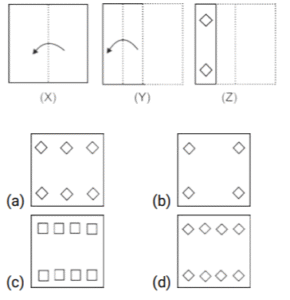 कागज मोड़ना (भाग-I)Total Questions: 5031. कागज के एक टुकड़े को मोड़ने का क्रम और मोड़े गए कागज को जिस तरह से काटा गया है, उसे निम्नलिखित प्रश्न आकृतियों में दिखाया गया है। अनफोल्ड होने पर यह पेपर (संबंधित विकल्पों में) कैसा दिखेगा ? [SSC MTS 30/09/2024 (Evening)](a)(b)(c)(d)Correct Answer: (b)Solution:32. कागज के एक टुकड़े को मोड़ने का क्रम और मोड़े गए कागज को जिस तरह से काटा गया है, उसे निम्नलिखित प्रश्न आकृतियों में दिखाया गया है। अनफोल्ड होने पर यह पेपर (संबंधित विकल्पों में) कैसा दिखेगा ? [SSC MTS 07/10/2024 (Evening)](a)(b)(c)(d)Correct Answer: (d)Solution:33. कागज के एक टुकड़े को मोड़ने का क्रम और मोड़े गए कागज को जिस तरह से काटा गया है, उसे निम्नलिखित प्रश्न आकृतियों में दिखाया गया है। अनफोल्ड होने पर यह पेपर (संबंधित विकल्पों में) कैसा दिखेगा ? [SSC MTS 09/10/2024 (Evening)](a)(b)(c)(d)Correct Answer: (a)Solution:34. कागज के एक टुकड़े को मोड़ने का क्रम और मोड़े गए कागज को जिस तरह से काटा गया है, उसे निम्नलिखित प्रश्न आकृतियों में दिखाया गया है। अनफोल्ड होने पर यह पेपर (संबंधित विकल्पों में) कैसा दिखेगा ? [SSC MTS 14/10/2024 (Morning)](a)(b)(c)(d)Correct Answer: (c)Solution:35. कागज के एक टुकड़े को मोड़ने का क्रम और मोड़े गए कागज को जिस तरह से काटा गया है, उसे निम्नलिखित प्रश्न आकृतियों में दिखाया गया है। अनफोल्ड होने पर यह पेपर (संबंधित विकल्पों में) कैसा दिखेगा ? [SSC MTS 05/11/2024 (Afternoon)](a)(b)(c)(d)Correct Answer: (c)Solution:36. कागज के एक टुकड़े को मोड़ने का क्रम और मोड़े गए कागज को जिस तरह से काटा गया है, उसे निम्नलिखित प्रश्न आकृतियों में दिखाया गया है। अनफोल्ड होने पर यह पेपर (संबंधित विकल्पों में) कैसा दिखेगा ? [SSC MTS 12/11/2024 (Afternoon)](a)(b)(c)(d)Correct Answer: (d)Solution:37. कागज के एक टुकड़े को मोड़ने का क्रम और मोड़े गए कागज को जिस तरह से काटा गया है, उसे निम्नलिखित प्रश्न आकृतियों में दिखाया गया है। अनफोल्ड होने पर यह पेपर (संबंधित विकल्पों में) कैसा दिखेगा ? [SSC MTS 14/11/2024 (Morning)](a)(b)(c)(d)Correct Answer: (b)Solution:38. कागज के एक टुकड़े को मोड़ने का क्रम और मोड़े गए कागज को जिस तरह से काटा गया है, उसे निम्नलिखित प्रश्न आकृतियों में दिखाया गया है। अनफोल्ड होने पर यह पेपर (संबंधित विकल्पों में) कैसा दिखेगा ? [SSC MTS 14/11/2024 (Evening)](a)(b)(c)(d)Correct Answer: (a)39. कागज के एक टुकड़े को मोड़ने का क्रम और मोड़े गए कागज को जिस तरह से काटा गया है, उसे निम्नलिखित प्रश्न आकृतियों में दिखाया गया है। अनफोल्ड होने पर यह पेपर (संबंधित विकल्पों में) कैसा दिखेगा ? [SSC CGL 09/09/2024 (2nd Shift)](a)(b)(c)(d)Correct Answer: (b)Solution:40. कागज के एक टुकड़े को मोड़ने का क्रम और मोड़े गए कागज को जिस तरह से काटा गया है, उसे निम्नलिखित प्रश्न आकृतियों में दिखाया गया है। अनफोल्ड होने पर यह पेपर (संबंधित विकल्पों में) कैसा दिखेगा ? [SSC CGL 09/09/2024 (2nd Shift)](a)(b)(c)(d)Correct Answer: (b)Solution:Submit Quiz« Previous12345Next »