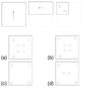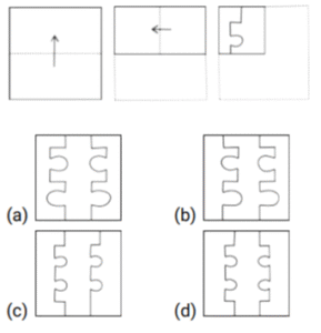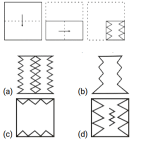 2. कागज के एक टुकड़े को मोड़ने का क्रम और मोड़े गए कागज को जिस तरह से काटा गया है, उसे निम्नलिखित प्रश्न आकृतियों में दिखाया गया है। अनफोल्ड होने पर यह पेपर (संबंधित विकल्पों में) कैसा दिखेगा ? [SSC CGL 17/09/2024 (1st Shift)]