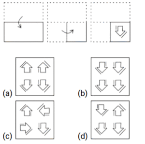 4. कागज के एक टुकड़े को मोड़ने का क्रम और मोड़े गए कागज को जिस तरह से काटा गया है, उसे निम्नलिखित प्रश्न आकृतियों में दिखाया गया है। अनफोल्ड होने पर यह पेपर (संबंधित विकल्पों में) कैसा दिखेगा ? [SSC CGL 17/09/2024 (3rd Shift)]