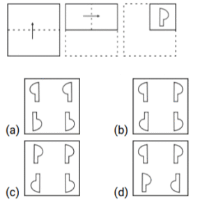 6. कागज के एक टुकड़े को मोड़ने का क्रम और मोड़े गए कागज को जिस तरह से काटा गया है, उसे निम्नलिखित प्रश्न आकृतियों में दिखाया गया है। अनफोल्ड होने पर यह पेपर (संबंधित विकल्पों में) कैसा दिखेगा ? [SSC CGL 18/09/2024 (2nd Shift)]