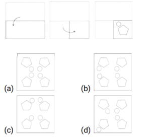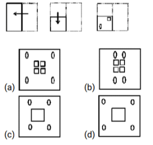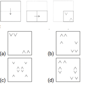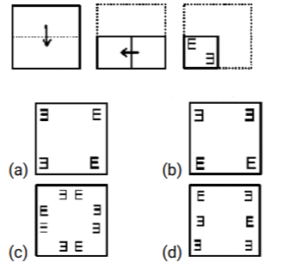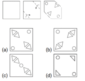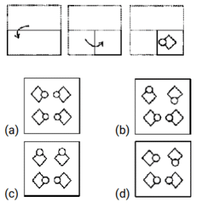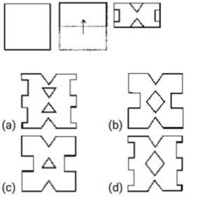 कागज मोड़ना (भाग-II)Total Questions: 5011. कागज के एक टुकड़े को मोड़ने का क्रम और मोड़े गए कागज को जिस तरह से काटा गया है, उसे निम्नलिखित प्रश्न आकृतियों में दिखाया गया है। अनफोल्ड होने पर यह पेपर (संबंधित विकल्पों में) कैसा दिखेगा ? [SSC CGL 19/09/2024 (3rd Shift)](a)(b)(c)(d)Correct Answer: (a)Solution:12. कागज के एक टुकड़े को मोड़ने का क्रम और मोड़े गए कागज को जिस तरह से काटा गया है, उसे निम्नलिखित प्रश्न आकृतियों में दिखाया गया है। अनफोल्ड होने पर यह पेपर (संबंधित विकल्पों में) कैसा दिखेगा ? [SSC CGL 23/09/2024 (2nd Shift)](a)(b)(c)(d)Correct Answer: (d)Solution:13. कागज के एक टुकड़े को मोड़ने का क्रम और मोड़े गए कागज को जिस तरह से काटा गया है, उसे निम्नलिखित प्रश्न आकृतियों में दिखाया गया है। अनफोल्ड होने पर यह पेपर (संबंधित विकल्पों में) कैसा दिखेगा ? [SSC CGL 23/09/2024 (3rd Shift)](a)(b)(c)(d)Correct Answer: (a)Solution:14. कागज के एक टुकड़े को मोड़ने का क्रम और मोड़े गए कागज को जिस तरह से काटा गया है, उसे निम्नलिखित प्रश्न आकृतियों में दिखाया गया है। अनफोल्ड होने पर यह पेपर (संबंधित विकल्पों में) कैसा दिखेगा ? [SSC CGL 24/09/2024 (2nd Shift)](a)(b)(c)(d)Correct Answer: (b)Solution:15. कागज के एक टुकड़े को मोड़ने का क्रम और मोड़े गए कागज को जिस तरह से काटा गया है, उसे निम्नलिखित प्रश्न आकृतियों में दिखाया गया है। अनफोल्ड होने पर यह पेपर (संबंधित विकल्पों में) कैसा दिखेगा ? [SSC CGL 24/09/2024 (3rd Shift)](a)(b)(c)(d)Correct Answer: (b)Solution:16. कागज के एक टुकड़े को मोड़ने का क्रम और मोड़े गए कागज को जिस तरह से काटा गया है, उसे निम्नलिखित प्रश्न आकृतियों में दिखाया गया है। अनफोल्ड होने पर यह पेपर (संबंधित विकल्पों में) कैसा दिखेगा ? [SSC CGL 25/09/2024 (1st Shift)](a)(b)(c)(d)Correct Answer: (c)Solution:17. कागज के एक टुकड़े को मोड़ने का क्रम और मोड़े गए कागज को जिस तरह से काटा गया है, उसे निम्नलिखित प्रश्न आकृतियों में दिखाया गया है। अनफोल्ड होने पर यह पेपर (संबंधित विकल्पों में) कैसा दिखेगा ? [SSC CGL 25/09/2024 (3rd Shift)](a)(b)(c)(d)Correct Answer: (a)Solution:18. कागज के एक टुकड़े को मोड़ने का क्रम और मोड़े गए कागज को जिस तरह से काटा गया है, उसे निम्नलिखित प्रश्न आकृतियों में दिखाया गया है। अनफोल्ड होने पर यह पेपर (संबंधित विकल्पों में) कैसा दिखेगा ? [SSC CGL 26/09/2024 (1st Shift)](a)(b)(c)(d)Correct Answer: (a)Solution:19. कागज के एक टुकड़े को मोड़ने का क्रम और मोड़े गए कागज को जिस तरह से काटा गया है, उसे निम्नलिखित प्रश्न आकृतियों में दिखाया गया है। अनफोल्ड होने पर यह पेपर (संबंधित विकल्पों में) कैसा दिखेगा ? [SSC CGL 26/09/2024 (2nd Shift)](a)(b)(c)(d)Correct Answer: (b)Solution:20. कागज के एक टुकड़े को मोड़ने का क्रम और मोड़े गए कागज को जिस तरह से काटा गया है, उसे निम्नलिखित प्रश्न आकृतियों में दिखाया गया है। अनफोल्ड होने पर यह पेपर (संबंधित विकल्पों में) कैसा दिखेगा ? [SSC CGL 26/09/2024 (3rd Shift)](a)(b)(c)(d)Correct Answer: (d)Solution:Submit Quiz« Previous12345Next »