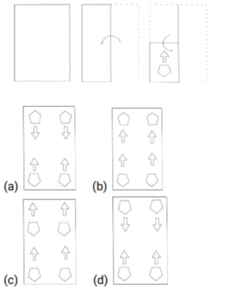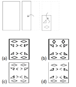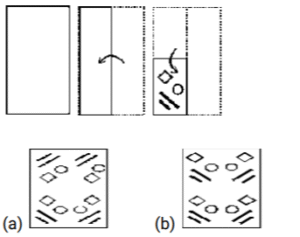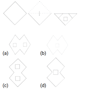 कागज मोड़ना (भाग-II)Total Questions: 5041. कागज के एक टुकड़े को मोड़ने का क्रम और मोड़े गए कागज को जिस तरह से काटा गया है, उसे निम्नलिखित प्रश्न आकृतियों में दिखाया गया है। अनफोल्ड होने पर यह पेपर (संबंधित विकल्पों में) कैसा दिखेगा ? [SSC CHSL 11/07/2024 (1st Shift)](a)(b)(c)(d)Correct Answer: (a)Solution:42. कागज के एक टुकड़े को मोड़ने का क्रम और मोड़े गए कागज को जिस तरह से काटा गया है, उसे निम्नलिखित प्रश्न आकृतियों में दिखाया गया है। अनफोल्ड होने पर यह पेपर (संबंधित विकल्पों में) कैसा दिखेगा ? [SSC CHSL 11/07/2024 (2nd Shift)](a)(b)(c)(d)Correct Answer: (c)Solution:43. कागज के एक टुकड़े को मोड़ने का क्रम और मोड़े गए कागज को जिस तरह से काटा गया है, उसे निम्नलिखित प्रश्न आकृतियों में दिखाया गया है। अनफोल्ड होने पर यह पेपर (संबंधित विकल्पों में) कैसा दिखेगा ? [SSC CHSL 11/07/2024 (2nd Shift)](a)(b)(c)(d)Correct Answer: (a)Solution:44. कागज के एक टुकड़े को मोड़ने का क्रम और मोड़े गए कागज को जिस तरह से काटा गया है, उसे निम्नलिखित प्रश्न आकृतियों में दिखाया गया है। अनफोल्ड होने पर यह पेपर (संबंधित विकल्पों में) कैसा दिखेगा ? [SSC CHSL 11/07/2024 (3rd Shift)](a)(b)(c)(d)Correct Answer: (b)Solution:45. कागज के एक टुकड़े को मोड़ने का क्रम और मोड़े गए कागज को जिस तरह से काटा गया है, उसे निम्नलिखित प्रश्न आकृतियों में दिखाया गया है। अनफोल्ड होने पर यह पेपर (संबंधित विकल्पों में) कैसा दिखेगा ? [SSC CHSL 11/07/2024 (4th Shift)](a)(b)(c)(d)Correct Answer: (a)Solution:46. कागज के एक टुकड़े को मोड़ने का क्रम और मोड़े गए कागज को जिस तरह से काटा गया है, उसे निम्नलिखित प्रश्न आकृतियों में दिखाया गया है। अनफोल्ड होने पर यह पेपर (संबंधित विकल्पों में) कैसा दिखेगा ? [SSC CPO 27/06/2024 (1st Shift)](a)(b)(c)(d)Correct Answer: (c)Solution:47. कागज के एक टुकड़े को मोड़ने का क्रम और मोड़े गए कागज को जिस तरह से काटा गया है, उसे निम्नलिखित प्रश्न आकृतियों में दिखाया गया है। अनफोल्ड होने पर यह पेपर (संबंधित विकल्पों में) कैसा दिखेगा ? [SSC CPO 27/06/2024 (3rd Shift)](a)(b)(c)(d)Correct Answer: (a)Solution:48. कागज के एक टुकड़े को मोड़ने का क्रम और मोड़े गए कागज को जिस तरह से काटा गया है, उसे निम्नलिखित प्रश्न आकृतियों में दिखाया गया है। अनफोल्ड होने पर यह पेपर (संबंधित विकल्पों में) कैसा दिखेगा ? [SSC CPO 27/06/2024 (3rd Shift)](a)(b)(c)(d)Correct Answer: (a)Solution:49. कागज के एक टुकड़े को मोड़ने का क्रम और मोड़े गए कागज को जिस तरह से काटा गया है, उसे निम्नलिखित प्रश्न आकृतियों में दिखाया गया है। अनफोल्ड होने पर यह पेपर (संबंधित विकल्पों में) कैसा दिखेगा ? [SSC CPO 28/06/2024 (1st Shift)]एक पैटर्न वाली एक पारदर्शी शीट नीचे दी गई है। उस विकल्प का चयन कीजिए जो उस पैटर्न को दर्शाता है जो दी गई पारदर्शी शीट को मध्य क्षैतिज रेखा पर मोड़ने पर दिखाई देगा। (a)(b)(c)(d)Correct Answer: (b)Solution:50. कागज के एक टुकड़े को मोड़ने का क्रम और मोड़े गए कागज को जिस तरह से काटा गया है, उसे निम्नलिखित प्रश्न आकृतियों में दिखाया गया है। अनफोल्ड होने पर यह पेपर (संबंधित 