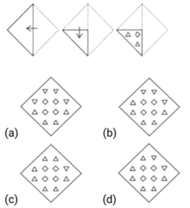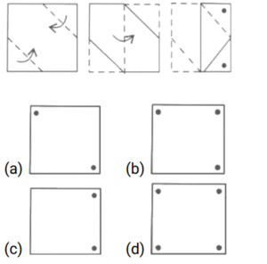 कागज मोड़ना (भाग-III)Total Questions: 5021. कागज के एक टुकड़े को मोड़ने का क्रम और मोड़े गए कागज को जिस तरह से काटा गया है, उसे निम्नलिखित प्रश्न आकृतियों में दिखाया गया है। अनफोल्ड होने पर यह पेपर (संबंधित विकल्पों में) कैसा दिखेगा ? [SSC MTS 08/09/2023 (2nd Shift)](a)(b)(c)(d)Correct Answer: (c)Solution:22. कागज के एक टुकड़े को मोड़ने का क्रम और मोड़े गए कागज को जिस तरह से काटा गया है, उसे निम्नलिखित प्रश्न आकृतियों में दिखाया गया है। अनफोल्ड होने पर यह पेपर (संबंधित विकल्पों में) कैसा दिखेगा ? [SSC MTS 12/09/2023 (1st Shift)](a)(b)(c)(d)Correct Answer: (d)Solution:23. कागज के एक टुकड़े को मोड़ने का क्रम और मोड़े गए कागज को जिस तरह से काटा गया है, उसे निम्नलिखित प्रश्न आकृतियों में दिखाया गया है। अनफोल्ड होने पर यह पेपर (संबंधित विकल्पों में) कैसा दिखेगा ? [SSC CHSL 02/08/2023 (3rd Shift)](a)(b)(c)(d)Correct Answer: (a)Solution:24. कागज के एक टुकड़े को मोड़ने का क्रम और मोड़े गए कागज को जिस तरह से काटा गया है, उसे निम्नलिखित प्रश्न आकृतियों में दिखाया गया है। अनफोल्ड होने पर यह पेपर (संबंधित विकल्पों में) कैसा दिखेगा ? [SSC CHSL 03/08/2023 (4th Shift)](a)(b)(c)(d)Correct Answer: (a)Solution:25. कागज के एक टुकड़े को मोड़ने का क्रम और मोड़े गए कागज को जिस तरह से काटा गया है, उसे निम्नलिखित प्रश्न आकृतियों में दिखाया गया है। अनफोल्ड होने पर यह पेपर (संबंधित विकल्पों में) कैसा दिखेगा ? [SSC CHSL 04/08/2023 (4th Shift)](a)(b)(c)(d)Correct Answer: (d)Solution:26. कागज के एक टुकड़े को मोड़ने का क्रम और मोड़े गए कागज को जिस तरह से काटा गया है, उसे निम्नलिखित प्रश्न आकृतियों में दिखाया गया है। अनफोल्ड होने पर यह पेपर (संबंधित विकल्पों में) कैसा दिखेगा ? [SSC CHSL 08/08/2023 (2nd Shift)](a)(b)(c)(d)Correct Answer: (d)Solution:27. कागज के एक टुकड़े को मोड़ने का क्रम और मोड़े गए कागज को जिस तरह से काटा गया है, उसे निम्नलिखित प्रश्न आकृतियों में दिखाया गया है। अनफोल्ड होने पर यह पेपर (संबंधित विकल्पों में) कैसा दिखेगा ? [SSC CHSL 17/08/2023 (4th Shift)](a)(b)(c)(d)Correct Answer: (d)Solution:28. कागज के एक टुकड़े को मोड़ने का क्रम और मोड़े गए कागज को जिस तरह से काटा गया है, उसे निम्नलिखित प्रश्न आकृतियों में दिखाया गया है। अनफोल्ड होने पर यह पेपर (संबंधित विकल्पों में) कैसा दिखेगा ? [SSC CGL 14/07/2023 (2nd shift)](a)(b)(c)(d)Correct Answer: (b)Solution:29. कागज के एक टुकड़े को मोड़ने का क्रम और मोड़े गए कागज को जिस तरह से काटा गया है, उसे निम्नलिखित प्रश्न आकृतियों में दिखाया गया है। अनफोल्ड होने पर यह पेपर (संबंधित विकल्पों में) कैसा दिखेगा ? [SSC CGL 18/07/2023 (1st shift)](a)(b)(c)(d)Correct Answer: (a)Solution:30. कागज के एक टुकड़े को मोड़ने का क्रम और मोड़े गए कागज को जिस तरह से काटा गया है, उसे निम्नलिखित प्रश्न आकृतियों में दिखाया गया है। अनफोल्ड होने पर यह पेपर (संबंधित विकल्पों में) कैसा दिखेगा ? [SSC CGL 19/07/2023 (1st shift)](a)(b)(c)(d)Correct Answer: (b)Solution:Submit Quiz« Previous12345Next »