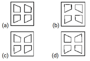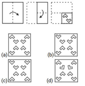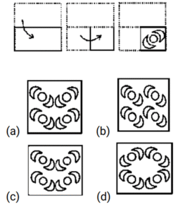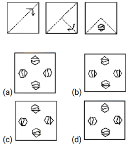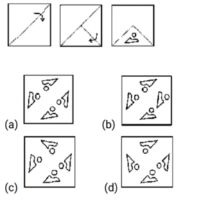 कागज मोड़ना (भाग-IV)Total Questions: 5011. कागज के एक टुकड़े को मोड़ने का क्रम और मोड़े गए कागज को जिस तरह से काटा गया है, उसे निम्नलिखित प्रश्न आकृतियों में दिखाया गया है। अनफोल्ड होने पर यह पेपर (संबंधित विकल्पों में) कैसा दिखेगा ? [SSC CPO 10/11/2022 (Afternoon)](a)(b)(c)(d)Correct Answer: (d)Solution:12. कागज के एक टुकड़े को मोड़ने का क्रम और मोड़े गए कागज को जिस तरह से काटा गया है, उसे निम्नलिखित प्रश्न आकृतियों में दिखाया गया है। अनफोल्ड होने पर यह पेपर (संबंधित विकल्पों में) कैसा दिखेगा ? [SSC CPO 11/11/2022 (Afternoon)](a)(b)(c)(d)Correct Answer: (c)Solution:13. कागज के एक टुकड़े को मोड़ने का क्रम और मोड़े गए कागज को जिस तरह से काटा गया है, उसे निम्नलिखित प्रश्न आकृतियों में दिखाया गया है। अनफोल्ड होने पर यह पेपर (संबंधित विकल्पों में) कैसा दिखेगा ? [Higher Secondary 01/08/2022 (Shift - 3)](a)(b)(c)(d)Correct Answer: (b)Solution:14. कागज के एक टुकड़े को मोड़ने का क्रम और मोड़े गए कागज को जिस तरह से काटा गया है, उसे निम्नलिखित प्रश्न आकृतियों में दिखाया गया है। अनफोल्ड होने पर यह पेपर (संबंधित विकल्पों में) कैसा दिखेगा ? [Higher Secondary 02/08/2022 Shift - 2)] (a)(b)(c)(d)Correct Answer: (a)Solution:15. कागज के एक टुकड़े को मोड़ने का क्रम और मोड़े गए कागज को जिस तरह से काटा गया है, उसे निम्नलिखित प्रश्न आकृतियों में दिखाया गया है। अनफोल्ड होने पर यह पेपर (संबंधित विकल्पों में) कैसा दिखेगा ? [Higher Secondary 03/08/2022 (Shift - 4)](a)(b)(c)(d)Correct Answer: (a)Solution:16. कागज के एक टुकड़े को मोड़ने का क्रम और मोड़े गए कागज को जिस तरह से काटा गया है, उसे निम्नलिखित प्रश्न आकृतियों में दिखाया गया है। अनफोल्ड होने पर यह पेपर (संबंधित विकल्पों में) कैसा दिखेगा ? [Higher Secondary 04/08/2022 (Shift - 3)](a)(b)(c)(d)Correct Answer: (d)Solution:17. कागज के एक टुकड़े को मोड़ने का क्रम और मोड़े गए कागज को जिस तरह से काटा गया है, उसे निम्नलिखित प्रश्न आकृतियों में दिखाया गया है। अनफोल्ड होने पर यह पेपर (संबंधित विकल्पों में) कैसा दिखेगा ? [Higher Secondary 05/08/2022 (Shift - 2)](a)(b)(c)(d)Correct Answer: (a)Solution:18. कागज के एक टुकड़े को मोड़ने का क्रम और मोड़े गए कागज को जिस तरह से काटा गया है, उसे निम्नलिखित प्रश्न आकृतियों में दिखाया गया है। अनफोल्ड होने पर यह पेपर (संबंधित विकल्पों में) कैसा दिखेगा ? [Higher Secondary 05/08/2022 (Shift - 2 )](a)(b)(c)(d)Correct Answer: (c)Solution:19. कागज के एक टुकड़े को मोड़ने का क्रम और मोड़े गए कागज को जिस तरह से काटा गया है, उसे निम्नलिखित प्रश्न आकृतियों में दिखाया गया है। अनफोल्ड होने पर यह पेपर (संबंधित विकल्पों में) कैसा दिखेगा ? [SSC MTS 05/07/2022 (Evening)](a)(b)(c)(d)Correct Answer: (d)Solution:20. कागज के एक टुकड़े को मोड़ने का क्रम और मोड़े गए कागज को जिस तरह से काटा गया है, उसे निम्नलिखित प्रश्न आकृतियों में दिखाया गया है। अनफोल्ड होने पर यह पेपर (संबंधित विकल्पों में) कैसा दिखेगा ? [SSC MTS 06/07/2022 (Morning)](a)(b)(c)(d)Correct Answer: (a)Solution:Submit Quiz« Previous12345Next »
