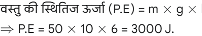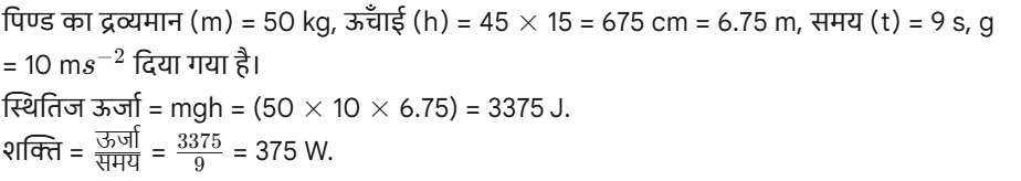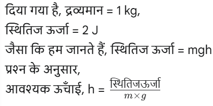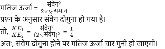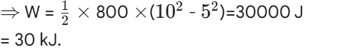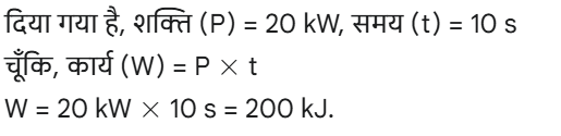 कार्य, ऊर्जा और शक्ति (Part-III)Total Questions: 6011. 1 kg की एक वस्तु को 10 m की ऊँचाई तक उठाया जाता है। गुरुत्व बल द्वारा किया गया कार्य ________ होगा। (मान लीजिए g = 9.8 m/s²) [RRB Group D 20/09/2018 (Morning)](a) 98 J(b) -98 J(c) -9.8 J(d) 9.8 JCorrect Answer: (b) -98 JSolution:दिया गया है, द्रव्यमान (m) = 1 kg, ऊँचाई (h) = 10 m∴ किया गया कार्य, W = m(-g)h = 1 × (- 9.8) × 10 = - 98 J (ऋण चिह्न इंगित करता है कि कार्य गुरुत्वाकर्षण के विरुद्ध किया गया है)।12. 10 किलोग्राम द्रव्यमान का एक ब्लॉक 20 सेकंड में विरामावस्था से 2 मीटर/सेकंड की गति तक एकसमान रूप से त्वरित होता है। 0 से 20 सेकंड के समय अंतराल में उत्पन्न औसत शक्ति है: [RRB Group D 20/09/2018 (Afternoon)](a) 1.5 W(b) 0.5 W(c) 2 W(d) 1 WCorrect Answer: (d) 1 WSolution:दिया गया है, द्रव्यमान = 10 किग्रा, समय अंतराल = 0 से 20 सेकंड v = 0 मी/से और u = 2 मी/से किया गया कार्य = mv² - m²13. 10 N का एक क्षैतिज बल 5 किलोग्राम की वस्तु को बल की दिशा में 2 मीटर की दूरी से विस्थापित कर देता है। बल द्वारा किया गया कार्य ________ होगा। [RRB Group D 20/09/2018 (Evening)](a) 20 J(b) 10J(c) 5 J(d) 50JCorrect Answer: (a) 20 JSolution:दिया गया है, बल = 10 N, वस्तु का द्रव्यमान = 5 kg, दूरी = 2 m∴ किया गया कार्य = F.s cos°यहाँ बल और विस्थापन के बीच का कोण शून्य है ⇒ cos0° = 1तो, किया गया कार्य = F × s = 10 × 2 = 20 J.14. 800 kg की कार के वेग को 5 m/s से 10 m/s बढ़ाने के लिए किया गया कार्य क्या है? [RRB Group D 22/09/2018 (Afternoon)](a) 20 kJ(b) 10 kJ(c) 40 kJ(d) 30 kJCorrect Answer: (d) 30 kJSolution:दिया गया है, द्रव्यमान (m) = 800 किग्रा, अंतिम वेग (v) = 10 मीटर/सेकंड और प्रारंभिक वेग (u) = 5 मीटर/सेकंड। कार्य-ऊर्जा प्रमेय के अनुसार, किया गया कार्य = गतिज ऊर्जा में परिवर्तन⇒ W = Δ K.E =1/2 × m × (v² - u²)15. 20 किलोवाट इंजन द्वारा 10 सेकंड में किया गया अधिकतम कार्य कितना होगा? RRB Group D 22/09/2018 (Evening) [RRB Group D 22/09/2018 (Evening)](a) 20 kJ(b) 200 kJ(c) 25 kJ(d) 2 kJCorrect Answer: (b) 200 kJSolution:16. यदि एक साइकिल की गति दोगुनी हो जाती है, तो गतिज ऊर्जा _______ हो जाती है। [RRB Group D 22/09/2018 (Evening)](a) 2 गुना(b) 4 गुना(c) 8 गुना(d) 16 गुनाCorrect Answer: (b) 4 गुनाSolution:∴ K.E.1 = 1/2 mv²अब, यदि v' = 2v साइकिल की नई गति है, तोनया K.E.2 = 21(mv')2 = 1/2m(2v)² = 4 × (1/2mv²) = 4 × K.E.1 = 4 गुना।17. बिंदु 6 मीटर की ऊँचाई पर और 50 किलोग्राम द्रव्यमान के साथ स्थिर वस्तु की ऊर्जा ज्ञात कीजिए। (g = 10 m/s²) [RRB Group D 22/09/2018 (Evening)](a) 3000 J(b) 3 × 10⁴ J(c) 300 J(d) 30 JCorrect Answer: (a) 3000 JSolution:दिया गया है, ऊँचाई (h) = 6 m, द्रव्यमान (m) = 50 kg, गुरुत्वीय त्वरण (g) = 10 m/s²।18. 50 kg भार का एक लड़का, 45 चरणों की सीढ़ियाँ 9 s में चढ़ जाता है। यदि प्रत्येक चरण की उँचाई 15 cm है, तो उसकी शक्ति का पता लगाएँ। (g = 10 ms⁻² लें) [RRB Group D 23/09/2018 (Morning)](a) 475 W(b) 325(c) 275 W(d) 375 WCorrect Answer: (d) 375 WSolution:19. _____ किलो द्रव्यमान की एक वस्तु की जमीन के सापेक्ष स्थितिज ऊर्जा 2 J है, जब वह _____ ऊँचाई पर होती है: g=10 m/s² लें। [RRB Group D 23/09/2018 (Afternoon)](a) 0.2 m(b) 1m(c) 0.1m(d) 0.5 mCorrect Answer: (a) 0.2 mSolution:2/1×10 = 0.2 m.20. जब किसी पिंड का संवेग दोगुना हो जाता है तो गतिज ऊर्जा ________ हो जाएगी। [RRB Group D 23/09/2018 (Afternoon)](a) दो गुनी(b) चार गुनी(c) अपरिवर्तित(d) आधाCorrect Answer: (b) चार गुनीSolution:जैसा कि हम जानते हैं, संवेग = द्रव्यमान × वेगऔर गतिज ऊर्जा = 1/2mv²Submit Quiz« Previous123456Next »