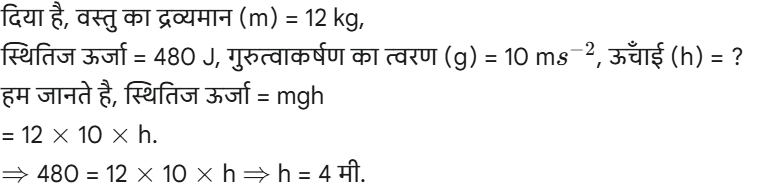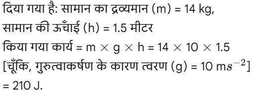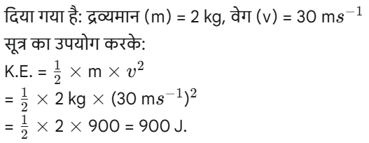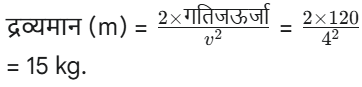 कार्य, ऊर्जा और शक्ति (Part-III)Total Questions: 6031. यदि कोई कारक t समय में W कार्य करता है, तो उसकी शक्ति (p) होगी: [RRB Group D 01/10/2018 (Afternoon)](a) समय-कार्य (t-W)(b) समय × कार्य (t × W)(c) कार्य/समय (W/t)(d) समय/कार्य (t/W)Correct Answer: (c) कार्य/समय (W/t)Solution:कार्य/समय (W/t). शक्ति को कार्य करने की दर या ऊर्जा के स्थानांतरण की दर के रूप में परिभाषित किया जाता है। यह एक अदिश राशि है। SI मात्रक - वाट (W)। आयामी सूत्र -[M¹L²T⁻³]।32. 5 ms⁻¹ की गति से आगे बढ़ रही द्रव्यमान m की एक वस्तु की गतिज ऊर्जा 25 J है। इसकी गति दोगुनी हो जाने पर इसकी गतिज ऊर्जा कितनी होगी? [RRB Group D 01/10/2018 (Afternoon)](a) 100 J(b) 50 J(c) 100 N(d) 50 NCorrect Answer: (a) 100 JSolution:गतिज ऊर्जा (KE) = 1/2}mv²⇒ KE ∝ v2.⇒ यदि वेग दोगुना कर दिया जाए तो गतिज ऊर्जा 4 गुना हो जाती है।⇒ गतिज ऊर्जा = 25 × 4 = 100 J.33. 4ms⁻¹ के एकसमान वेग से गतिमान एक वस्तु की गतिज ऊर्जा 120 J है। वस्तु का द्रव्यमान ज्ञात कीजिए। [RRB Group D 01/10/2018 (Evening)](a) 15 N(b) 15 W(c) 15 kg(d) 15 PaCorrect Answer: (c) 15 kgSolution:दिया गया है, वेग (v) = 4 ms⁻¹ गतिज ऊर्जा = 120 J. गतिज ऊर्जा के समीकरण का उपयोग करते हुए, गतिज ऊर्जा = 1/2mv²34. 12 किलोग्राम द्रव्यमान की एक वस्तु जमीन से एक निश्चित ऊँचाई पर है। यदि वस्तु की स्थितिज ऊर्जा 480 J है, तो वह ऊँचाई ज्ञात कीजिए जिस पर वस्तु जमीन के सापेक्ष है। दिया गया है, g = 10 ms⁻² [RRB Group D 03/10/2018 (Afternoon)](a) 5 मी(b) 8 मी(c) 4 मी(d) 6 मीCorrect Answer: (c) 4 मीSolution:35. एक कुली ज़मीन से 11kg का सामान उठाता है और ज़मीन से 1.5m ऊपर अपने सिर पर रखता है। कुली द्वारा सामान पर कुल कितना काम किया गया? (g = 10 ms⁻²) [RRB Group D 03/10/2018 (Evening)](a) 100 N(b) 155 J(c) 165 J(d) 150 JCorrect Answer: (c) 165 JSolution:दिया गया है कि, m = 11 kg, h = 1.5 m, g = 10 m/s² W = mgh = 11 × 1.5 × 10 = 165 J.36. एक कुली ज़मीन से 12 किलो का सामान उठाता है और अपने सिर को जमीन से 1.5 मीटर ऊपर रखता है। सामान पर उसके द्वारा किए गए कार्य की गणना करें। (g = 10 ms⁻²) [RRB Group D 04/10/2018 (Morning)](a) 140 J(b) 150 J(c) 180 J(d) 155 JCorrect Answer: (c) 180 JSolution:∴ किया गया कार्य = स्थितिज ऊर्जा में परिवर्तन = mgΔh, जहाँ m उठाया गया द्रव्यमान है, g गुरुत्वाकर्षण के कारण त्वरण है, Δh ऊँचाई में परिवर्तन है। $\therefore$ W = mgΔh = 12 × 10 × 1.5 = 180 J.37. 10 N का बल किसी वस्तु पर कार्य कर रहा है। वस्तु बल की दिशा में 5 m विस्थापित होती है। तो किया गया कार्य होता है: [RRB Group D 04/10/2018 (Morning)](a) 50 N(b) -50 N(c) 50 J(d) -50 JCorrect Answer: (c) 50 JSolution:दिया गया है कि, बल (F) = 10 N, विस्थापन (s) = 5 m, किया गया कार्य = ?∴ किया गया कार्य = बल × विस्थापन = 10 × 5 = 50 J.38. 12 kg की एक वस्तु को भूमि से एक निश्चित ऊँचाई पर रखा गया है। यदि वस्तु की स्थितिज ऊर्जा 600J है, तो भूमि के संदर्भ में वस्तु की ऊँचाई ज्ञात कीजिए। दिया गया है g = 10 ms⁻² [RRB Group D 04/10/2018 (Morning)](a) 5 ms²(b) -5 m(c) 5 ms⁻²(d) 5 mCorrect Answer: (d) 5 mSolution:39. एक मज़दूर भूमि से 14 kg का सामान उठाता है, और उसे भूमि से 1.5m ऊपर, अपने सिर पर रखता है। उसके द्वारा सामान पर किए गए कार्य की गणना करें। [RRB Group D 04/10/2018 (Afternoon)](a) 210 J(b) 140 J(c) 210 N(d) 155 JCorrect Answer: (a) 210 JSolution:40. 30 ms⁻¹ की गति से चलने वाले 2 kg द्रव्यमान के बॉल की गतिज ऊर्जा ज्ञात करें: [RRB Group D 04/10/2018 (Afternoon)](a) 900 N(b) 900 J(c) 900 W(d) 900 PaCorrect Answer: (b) 900 JSolution:Submit Quiz« Previous123456Next