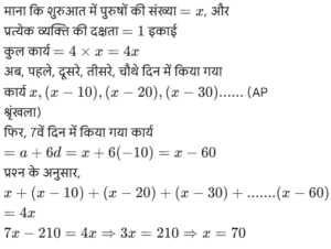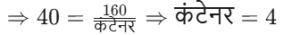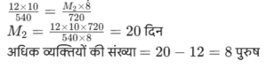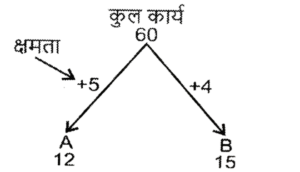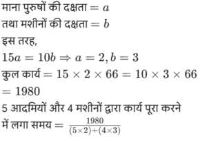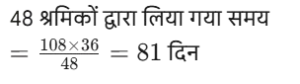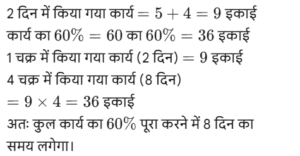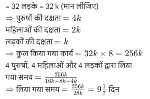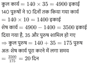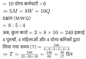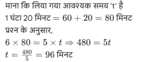 कार्य और समय (भाग-III) Total Questions: 501. यदि 12 व्यक्ति 540 समान पुस्तकों को 10 दिनों में मुद्रित कर सकते हैं, तो 8 दिनों में ऐसी 720 पुस्तकों को मुद्रित करने के लिए कितने और व्यक्तियों की आवश्यकता होगी? [SSC CPO 29/06/2024 (3rd Shift)](a) 8(b) 12(c) 6(d) 4Correct Answer: (a) 8Solution:2. A और B एक कार्य को क्रमशः 12 और 15 दिनों में पूरा करते हैं। उन्होंने बारी-बारी से 1-1 दिन कार्य करना शुरू किया और A ने पहले कार्य शुरू किया। 60% कार्य कितने समय में पूरा हो जाएगा ? [Matriculation Level 20/06/2024 (Shift - 1)](a) 9 दिन(b) 10 दिन(c) 7 दिन(d) 8 दिनCorrect Answer: (d) 8 दिनSolution:3. एक निर्माण स्थल पर, 15 आदमी या 10 मशीनें 66 दिनों में एक कमरे का निर्माण कर सकती हैं। 5 आदमी और 4 मशीनें मिलकर उस कार्य को कितने दिनों में पूरा कर सकती हैं? [Matriculation Level 20/06/2024 (Shift - 4)](a) 80(b) 75(c) 85(d) 90Correct Answer: (d) 90Solution:दिया गया है, 15 आदमी और 10 मशीनें एक ही समय में एक ही काम करते हैं4. 140 पुरुषों की एक चौकी में 35 दिन के लिए रसद है। 10 दिन के अंत में, 35 और पुरुष उनके साथ शामिल हो गए। शेष रसद पर वे कितने दिन तक भरण-पोषण कर सकते हैं? [Matriculation Level 20/06/2024 (Shift - 4)](a) 10(b) 20(c) 25(d) 35Correct Answer: (b) 20Solution:5. यदि 108 मजदूर एक दीवार को 36 दिन में बना सकते हैं, तो उसी दीवार को 48 मजदूर कितने दिन में बना सकते हैं? [Matriculation Level 21/06/2024 (Shift - 1)](a) 72(b) 63(c) 81(d) 54Correct Answer: (c) 81Solution:कुल किया गया कार्य = 108 × 366. यदि किसी कार्य को 1 घंटे 20 मिनट में पूरा करने के लिए 6 व्यक्तियों की आवश्यकता होती है, तो उसी कार्य को केवल 5 व्यक्ति कितने समय में पूरा करेंगे? [Matriculation Level 24/06/2024 (Shift - 1)](a) 105 मिनट(b) 90 मिनट(c) 96 मिनट(d) 100 मिनटCorrect Answer: (c) 96 मिनटSolution:7. पुरुषों के एक समूह ने 4 दिनों में एक काम पूरा करने का फैसला किया। हालाँकि, चूँकि हर दिन 10 पुरुष बाहर हो गए, इसलिए काम 7वें दिन के अंत में पूरा हो पाया। शुरुआत में कितने पुरुष थे ? [Matriculation Level 24/06/2024 (Shift - 4)](a) 140(b) 70(c) 35(d) 90Correct Answer: (b) 70Solution:8. यदि 8 पुरुष या 16 महिलाएं या 32 लड़के एक कार्य को 8 महीने में पूरा कर सकते हैं, तो 4 पुरुष, 4 महिलाएं और 4 लड़के मिलकर उस कार्य को कितने महीने में पूरा कर सकते हैं ? [Higher Secondary 20/06/2024 (Shift - 2)](a) 6³⁄₇(b) 10⁵⁄₇(c) 9¹⁄₇(d) 8²⁄₇Correct Answer: (c) 9¹⁄₇Solution:दिया गया: 8 पुरुष = 16 महिलाएँ9. 3 पुरुष एक कार्य को 10 दिनों में कर सकते हैं, 4 महिलाएं इसे 12 दिनों में कर सकती हैं और 10 योग्य श्रमिक इसे 6 दिनों में पूरा कर सकते हैं। प्रतिदिन 4 पुरुष, 4 महिलाएं और 4 योग्य श्रमिक एक साथ मिलकर कार्य करते हुए उस कार्य को कितने दिनों में पूरा करते हैं? [Higher Secondary 21/06/2024 (Shift - 2)](a) 30/19(b) 60/17(c) 45/17(d) 60/19Correct Answer: (b) 60/17Solution:3 पुरुष × 10 = 4 महिलाएँ × 1210. 25 पर्यटकों का एक समूह एक होटल में 8 दिनों में 5 कंटेनर भोजन का उपभोग करता है। 10 पर्यटकों को 16 दिनों तक खाने के लिए कितने कंटेनरों की आवश्यकता होगी? [Higher Secondary 24/06/2024 (Shift - 2)](a) 4(b) 3(c) 6(d) 5Correct Answer: (a) 4Solution:Submit Quiz12345Next »