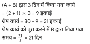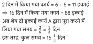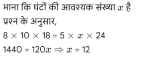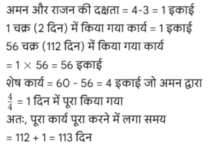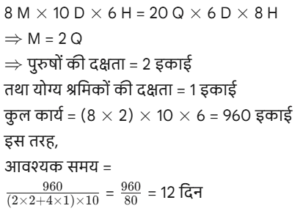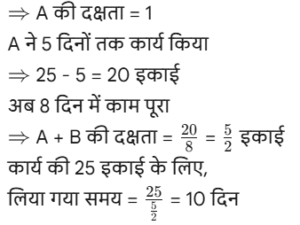 कार्य और समय (भाग-III) Total Questions: 5011. 2 पुरुषों का एक दिन का कार्य 4 महिलाओं के एक दिन के कार्य या 8 योग्य श्रमिकों के एक दिन के कार्य के बराबर है। 10 योग्य श्रमिक एक कार्य को 8 दिनों में पूरा कर सकते हैं। यदि एक पुरुष, एक महिला और एक योग्य श्रमिक तीन अलग-अलग दिनों में इसी क्रम में कार्य करते हैं, तो कार्य दिनों में समाप्त हो जाएगा। [Higher Secondary 24/06/2024 (Shift - 2)](a) 166/5(b) 203/6(c) 131/4(d) 135/4Correct Answer: (d) 135/4Solution:12. एक कार्य को 8 व्यक्ति प्रतिदिन 6 घंटे कार्य करके 10 दिनों में समाप्त कर सकते हैं या 20 योग्य श्रमिक प्रतिदिन 8 घंटे कार्य करके 6 दिनों में समाप्त कर सकते हैं। 2 पुरुष और 4 योग्य श्रमिक प्रतिदिन 10 घंटे एक साथ कार्य करते हैं, कार्य ___ दिनों में समाप्त हो जाएगा। [Higher Secondary 25/06/2024 (Shift - 2)](a) 10(b) 8(c) 12(d) 9Correct Answer: (c) 12Solution:13. X और Y एक कार्य को क्रमशः 18 दिन और 27 दिन में कर सकते हैं। X से शुरू करते हुए, वे एकांतर दिन में कार्य करते हैं। X और Y द्वारा कार्य को पूरा करने में कुल कितने दिन लगेंगे? [Higher Secondary 25/06/2024 (Shift - 2)](a) 20(b) 21(c) 24(d) 22Correct Answer: (d) 22Solution:14. A किसी कार्य को 25 दिन में पूरा कर सकता है। 5 दिन तक कार्य करने के बाद, उसने B की सहायता ली और 8 दिन में कार्य पूरा कर लिया। यदि A और B दोनों ने शुरू से ही एक साथ कार्य किया होता, तो उन्होंने कार्य को कितने दिन में पूरा किया होता? [Higher Secondary 25/06/2024 (Shift - 4)](a) 12(b) 14(c) 10(d) 15Correct Answer: (b) 14Solution:माना कुल कार्य = 25 इकाई15. सार्थक और मोहन एक एकांतर दिनों पर काम कर रहे हैं। वर्कशॉप में सार्थक काम को 20 दिनों में पूरा कर सकता है जबकि मोहन 25 दिनों में पूरा कर सकता है। सार्थक पहले दिन काम करता है, मोहन दूसरे दिन काम करता है और इसी तरह आगे भी। एकांतर आधार पर उन्हें कितना समय (दिनों में) लगेगा ? [Higher Secondary 25/06/2024 (Shift - 4)](a) 20¹⁄₅(b) 22¹⁄₅(c) 23(d) 22¹⁄₃Correct Answer: (b) 22¹⁄₅Solution:चूँकि वे एकान्तर रूप से कार्य करते हैं,16. A और B अलग-अलग कार्य करते हुए एक कार्य को क्रमशः 15 दिनों और 18 दिनों में पूरा कर सकते हैं। यदि A कार्य शुरू करता है और वे प्रत्येक दिन बारी-बारी से एक-एक करके एकांतर दिनों में कार्य करते हैं, तो कार्य कितने दिनों में पूरा होगा? [Higher Secondary 26/06/2024 (Shift - 2)](a) 16¹⁄₃(b) 17¹⁄₃(c) 15²⁄₃(d) 18²⁄₃Correct Answer: (a) 16¹⁄₃Solution:17. A और B एक कार्य को क्रमशः 15 दिन और 30 दिन में कर सकते हैं। वे एक साथ कार्य करना शुरू करते हैं, लेकिन A, 3 दिन बाद कार्य छोड़ देता है। शेष कार्य को पूरा करने में B को कितना समय लगेगा? [Graduate Level 20/06/2024 (Shift - 3)](a) 28 दिन(b) 21 दिन(c) 24 दिन(d) 32 दिनCorrect Answer: (b) 21 दिनSolution:18. आठ मजदूर प्रतिदिन 10 घंटे कार्य करके किसी कार्य को 18 दिनों में पूरा करते हैं। यदि केवल 5 मजदूर कार्य कर रहे हैं, तो 24 दिनों में कार्य पूरा करने के लिए उन्हें प्रतिदिन कितने घंटे कार्य करना चाहिए? [Graduate Level 20/06/2024 (Shift - 3)](a) 9 घंटे(b) 8 घंटे(c) 10 घंटे(d) 12 घंटेCorrect Answer: (d) 12 घंटेSolution:19. अमन और राजन एक निर्माण स्थल पर काम कर रहे हैं। किसी इंजीनियरिंग प्रयोग में, अमन एक दीवा