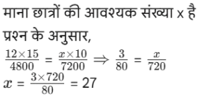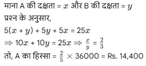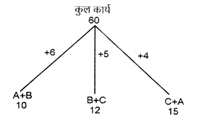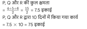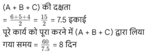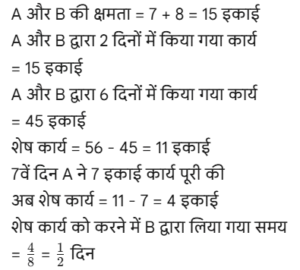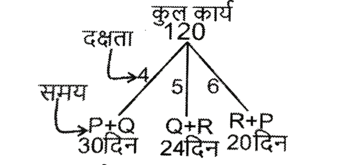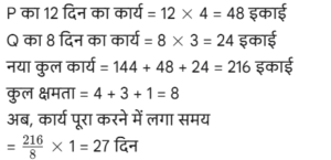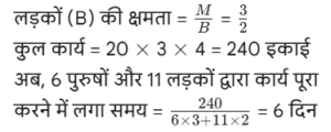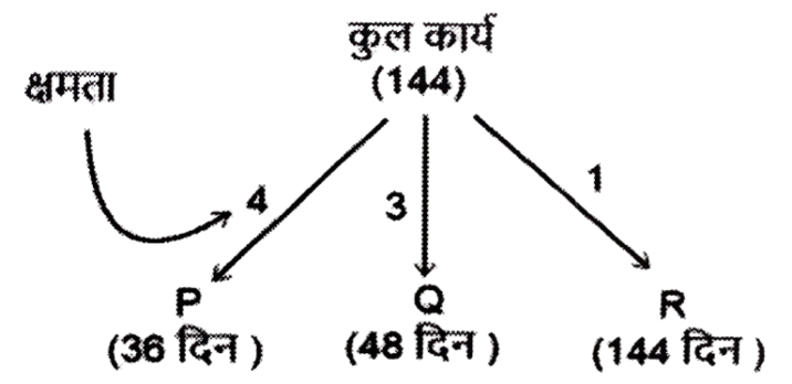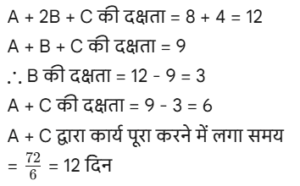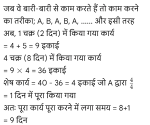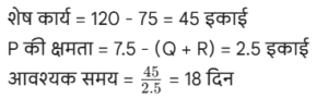 कार्य और समय (भाग-III) Total Questions: 5021. A और B एक काम को 10 दिनों में कर सकते हैं। B और C उसी कार्य को 12 दिनों में कर सकते हैं। C और A उसी कार्य को 15 दिनों में कर सकते हैं। यदि तीनों एक साथ मिलकर कार्य करते हैं, तो कार्य को पूरा करने के लिए आवश्यक दिनों की संख्या ज्ञात कीजिए। [Graduate Level 25/06/2024 (Shift - 3)](a) 12(b) 6(c) 10(d) 8Correct Answer: (d) 8Solution:22. यदि 12 विद्यार्थी एक पुस्तक के 4800 पृष्ठ 15 दिन में पढ़ सकते हैं, तो कितने विद्यार्थी उसी पुस्तक के 7200 पृष्ठ 10 दिन में पढ़ सकते हैं? [Graduate Level 26/06/2024 (Shift - 3)](a) 24(b) 27(c) 33(d) 30Correct Answer: (b) 27Solution:23. 30 व्यक्ति प्रतिदिन 10 घंटे कार्य करके 5 इकाई कार्य को 12 दिनों में पूरा कर सकते हैं। यदि वे दिन में 8 घंटे काम करते हैं, तो उस कार्य की 8 इकाइयों को 16 दिनों में पूरा करने के लिए कितने व्यक्तियों की आवश्यकता होगी? [Graduate Level 26/06/2024 (Shift - 3)](a) 30(b) 38(c) 45(d) 47Correct Answer: (c) 45Solution:24. A और B अकेले अकेले एक काम को क्रमशः 10 दिन और 8 दिन में कर सकते हैं। यदि वे एकांतर दिन (बारी-बारी से एक-एक दिन) पर कार्य करते हैं और A कार्य प्रारंभ करता है, तो कार्य कितने दिनों में पूरा होगा? [Graduate Level 26/06/2024 (Shift - 4)](a) 10(b) 8(c) 9(d) 12Correct Answer: (c) 9Solution:25. A और B एक काम को 9 दिनों में पूरा कर सकते हैं, जबकि B और C उसी काम को 18 दिनों में पूरा कर सकते हैं। A, B और C साथ मिलकर काम करते हुए उसी काम को 8 दिनों में पूरा कर सकते हैं। A और C को साथ मिलकर काम पूरा करने में कितने दिन लगेंगे ? [SSC CHSL Tier II 02/11/2023](a) 11(b) 13(c) 12(d) 14Correct Answer: (c) 12Solution:26. P, Q और R, जब अलग-अलग कार्य करते हैं, तो किसी कार्य को क्रमशः 36 दिन, 48 दिन और 144 दिन में पूरा कर सकते हैं। P, Q और R एक साथ मिलकर कार्य करना शुरू करते हैं। P कार्य पूरा होने से 12 दिन पहले कार्य छोड़ देता है, और Q कार्य पूरा होने से 8 दिन पहले कार्य छोड़ देता है। R कार्य के आरंभ से अंत तक कार्य करता है। कार्य पूरा करने में लगने वाले दिनों की कुल संख्या ज्ञात करें। [SSC CPO 03/10/2023 (1st Shift)](a) 30(b) 24(c) 27(d) 25Correct Answer: (c) 27Solution:27. A एक कार्य को 8 दिन में कर सकता है, जबकि B इसे 7 दिन में कर सकता है। यदि वे उस पर A से शुरू करते हुए बारी-बारी से कार्य करते हैं, तो कार्य कितने दिनों में पूरा हो जाएगा? [SSC CPO 03/10/2023 (2nd Shift)](a) 7(b) 8(c) 8 ½(d) 7 ⅟₂Correct Answer: (d) 7 ⅟₂Solution: अतः कुल समय = 7 + 1/2 = 7 ⅟₂ दिन28. P और Q मिलकर एक कार्य को 30 दिनों में पूरा कर सकते हैं। Q और R मिलकर उसी कार्य को 24 दिनों में पूरा कर सकते हैं, तथा R और P मिलकर उसी कार्य को 20 दिनों में पूरा कर सकते हैं। उन्होंने ने एक साथ कार्य करना शुरू किया, लेकिन Q और R ने 10 दिनों के बाद कार्य छोड़ दिया। शेष कार्य को पूरा करने में P को और कितने दिनों का समय लगेगा? [SSC CPO 03/10/2023 (2nd Shift)](a) 23(b) 19(c) 21(d) 18Correct Answer: (d) 18Solution: 29. यदि 4 पुरुष या 6 लड़के किसी कार्य को 20 दिन में पूरा कर सकते हैं, तो 6 पुरुष और 11 लड़के उसी कार्य को कितने दिन में पूरा कर सकते हैं? [SSC CPO 03/10/2023 (3rd Shift)](a) 5(b) 7(c) 8(d) 6Correct Answer: (d) 6Solution:4 आदमियो (M) की क्षमता = 630. A और B, ₹36,000 में एक प्रोजेक्ट को पूरा करने की जिम्मे