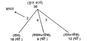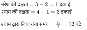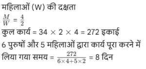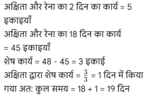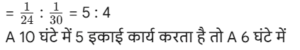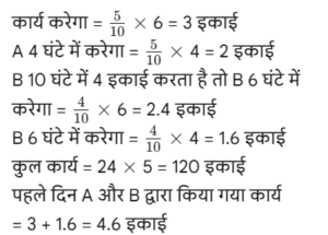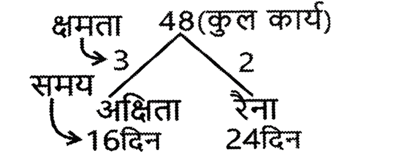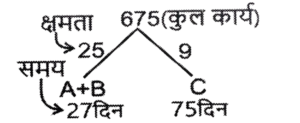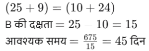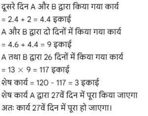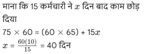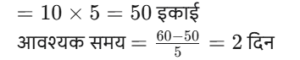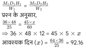 कार्य और समय (भाग-III) Total Questions: 5031. एक कार्यालय में, 75 कर्मचारी एक परियोजना को 60 दिनों में पूरा कर सकते हैं। कुछ दिनों के बाद, 15 कर्मचारियों ने कार्य छोड़ दिया, और परियोजना 65 दिनों में पूर्ण हुई। 15 कर्मचारियों ने कितने दिनों के बाद कार्य छोड़ दिया था ? [SSC CPO 04/10/2023 (2nd Shift)](a) 40(b) 50(c) 45(d) 30Correct Answer: (a) 40Solution:प्रश्न के अनुसार,32. अक्षिता और रैना एक किताब टाइप कर रहे हैं, लेकिन उनके पास कार्य करने के लिए केवल एक लेपटॉप है। उन्होंने तय किया कि वे बारी-बारी से कार्य करेंगे, जैसे कि अक्षिता पहले दिन कार्य करती है, रैना दूसरे दिन कार्य करती है, [SSC CPO 04/10/2023 (2nd Shift)](a) 19(b) 15(c) 17(d) 18Correct Answer: (a) 19Solution:33. 36 समान रूप से दक्ष कर्मचारी 48 दिनों में 25 एक जैसी दीवारों को पेंट कर सकते हैं। ऐसे 45 कर्मचारी कितने दिनों में ऐसी 60 दीवारों को पेंट कर सकते हैं? [SSC CPO 04/10/2023 (3rd Shift)](a) 91.96(b) 92.16(c) 92.36(d) 91.16Correct Answer: (b) 92.16Solution:प्रयुक्त सूत्र:-34. यदि 2 पुरुष या 4 महिलाएं एक दीवार को 34 दिनों में बना सकते हैं, तो 6 पुरुष और 5 महिलाएं उसी दीवार को कितने दिनों में बना सकते हैं ? [SSC CPO 05/10/2023 (1st Shift)](a) 8(b) 16(c) 24(d) 12Correct Answer: (a) 8Solution:2 पुरुषों (M) की दक्षता = 435. A और B प्रतिदिन 10 घंटे कार्य करते हुए एक कार्य को क्रमशः 24 और 30 दिनों में पूरा करते हैं। कार्य दो पालियों में किया जाना है। सुबह की पाली 6 घंटे की, और शाम की पाली 4 घंटे की है। पहले दिन, A सुबह कार्य करता है, और B शाम को कार्य करता है, और वे प्रतिदिन अपनी पाली परस्पर बदल लेते हैं। कार्य किस दिन पूरा होगा ? [SSC CPO 05/10/2023 (1st Shift)](a) 24वें दिन(b) 27वें दिन(c) 30वें दिन(d) 21 वें दिनCorrect Answer: (b) 27वें दिनSolution:A और B की दक्षता का अनुपात 36. रॉबर्ट एक कार्य को पूरा करने में टॉम से दोगुना और जॉर्ज से तीन गुना समय लेता है यदि एक साथ कार्य करते हुए, वे इस कार्य को 23 घंटे में पूरा कर सकते हैं, तो टॉम को उस कार्य को पूरा करने में कितना समय लगेगा ? [SSC CPO 05/10/2023 (2nd Shift)](a) 39 घंटे(b) 46 घंटे(c) 69 घंटे(d) 11 घंटेCorrect Answer: (c) 69 घंटेSolution:प्रश्न के अनुसार,37. A एक निश्चित कार्य को पूरा करने में, B और C द्वारा मिलकर उस कार्य को पूरा करने में लगने वाले समय से 2.4 गुना समय लेता है। यदि A और B मिलकर इसी कार्य 27 दिन में कर सकते हैं, और C अकेले उसी कार्य को 75 दिन में कर सकता है, तो B अकेले इस कार्य को कितने दिनों में पूरा करेगा ? [SSC CPO 05/10/2023 (2nd Shift)](a) 42(b) 54(c) 48(d) 45Correct Answer: (d) 45Solution:प्रश्न के अनुसार, अनुपात - A : B+C समय - 24 : 10 दक्षता - 10 : 2438. यदि अरुण किसी कार्य का 2 भाग 12 दिनों में पूरा कर सकता है, तो वह उसी कार्य का 1 6 भाग कितने दिनों में पूरा करेगा ? [SSC CPO 05/10/2023 (3rd Shift)](a) 4(b) 5(c) 2(d) 3Correct Answer: (d) 3Solution:2/3 वाँ भाग का कार्य पूरा करने में39. A, B और C एक काम को क्रमशः 10, 15, 12 दिनों में कर सकते हैं। A और B प्रत्येक दिन बारी-बारी से 5 दिनों तक काम करते हैं और फिर काम छोड़ देते हैं। फिर C शामिल होकर शेष काम को पूरा करता है। C ने शेष काम को कितने दिनों में पूरा किया ? [SSC MTS 01/09/2023 (1st Shift)](a) 3(b) 1(c) 4(d) 2Correct An