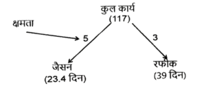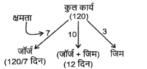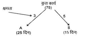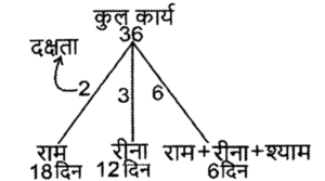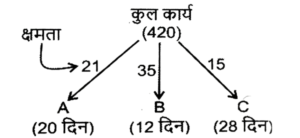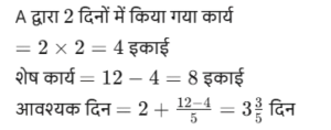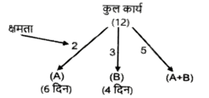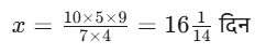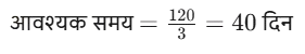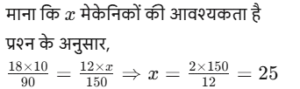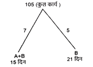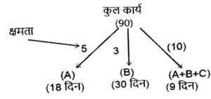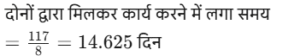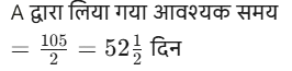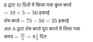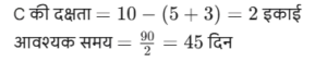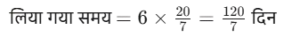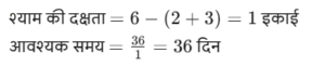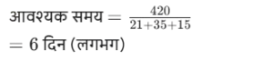 कार्य और समय (भाग-IV)Total Questions: 5021. A और B एक काम को क्रमशः 6 दिन और 4 दिन में पूरा कर सकते हैं। A अकेले इस पर 2 दिनों तक काम करता है, उसके बाद, B उसके साथ शामिल हो जाता है। काम को पूरा करने में उन्हें कुल कितना समय लगा ? [SSC CHSL 07/08/2023 (2nd Shift)](a) 3³⁄₅ दिन(b) 1³⁄₅ दिन(c) 3¹⁄₅ दिन(d) 4¹⁄₅ दिनCorrect Answer: (a) 3³⁄₅ दिनSolution:22. A और B मिलकर किसी काम को 15 दिनों में पूरा कर सकते हैं और B अकेले उसी काम को 21 दिनों में पूरा कर सकता है। A अकेले इसी काम को कितने दिनों में पूरा कर सकता है? [SSC CHSL 08/08/2023 (2nd Shift)](a) 41 ⅟₂ दिन(b) 52 ⅟₂ दिन(c) 31 ⅟₂ दिन(d) 57 ⅟₂ दिनCorrect Answer: (b) 52 ⅟₂ दिनSolution:23. तीन व्यक्ति A, B और C साथ मिलकर काम करते हैं और एक काम को 9 दिनों में पूरा करते हैं। यदि A अकेले उसी काम को 18 दिनों में और B अकेले 30 दिनों में पूरा कर सकता है, तो C अकेले उसी काम को कितने दिनों में पूरा करेगा? [SSC CHSL 09/08/2023 (4th Shift)](a) 36 दिन(b) 45 दिन(c) 40 दिन(d) 54 दिनCorrect Answer: (b) 45 दिनSolution:24. X, Y और Z एक कार्य को क्रमशः 20, 12 और 28 दिनों में पूरा कर सकते हैं। यदि सभी साथ मिलकर काम करते हैं, तो काम पूरा करने के लिए दिनों की अनुमानित संख्या क्या होगी ? [SSC CHSL 10/08/2023 (2nd Shift)](a) 6(b) 7(c) 4(d) 5Correct Answer: (a) 6Solution:25. जॉर्ज कुल काम का 35% भाग 6 दिनों में कर सकता है। जिम और जॉर्ज ने साथ मिलकर एक काम को 12 दिनों में पूरा किया। जिम अकेले काम करते हुए, उसी काम को कितने दिनों में पूरा कर सकता था ? [SSC CHSL 10/08/2023 (3rd Shift)](a) 36(b) 40(c) 42(d) 45Correct Answer: (b) 40Solution:जॉर्ज द्वारा संपूर्ण कार्य करने में26. 30 महिलाएँ प्रतिदिन 5 घंटे काम करके एक काम को 18 दिनों में पूरा कर सकती है। 21 महिलाएँ प्रतिदिन 8 घंटे काम करके उसी काम को कितने दिनों में पूरा करेंगी? [SSC CHSL 11/08/2023 (1st Shift)](a) 18⁷⁄₁₃ दिन(b)17¹¹⁄₁₃ दिन(c) 16¹⁄₁₄ दिन(d) 13¹⁄₁₄ दिनCorrect Answer: (c) 16¹⁄₁₄ दिनSolution:माना, दिनों की अभीष्ट संख्या =x30 × 5 × 18 = 21 × 8 × x27. यदि 18 मैकेनिक 10 दिनों में 90 कारों की मरम्मत कर सकते हैं, तो 12 दिनों में 150 कारों की मरम्मत करने के लिए कितने मैकेनिकों की आवश्यकता होगी ? [SSC CHSL 11/08/2023 (4th Shift)](a) 25(b) 30(c) 20(d) 27Correct Answer: (a) 25Solution:28. A एक काम को 25 दिनों में पूरा कर सकता है और B उसी काम को 15 दिनों में कर सकता है। B ने 10 दिनों तक काम करने के बाद काम छोड़ दिया। A अकेले शेष काम को कितने दिनों में पूरा कर सकता है? [SSC CHSL 14/08/2023 (2nd Shift)](a) 7⅟₃(b) 6⅟₃(c) 8⅟₃(d) 5⅟₃Correct Answer: (c) 8⅟₃Solution:29. जेसन अकेले किसी कार्य को 23.4 दिनों में कर सकता है, जबकि रफीक अकेले उसी कार्य को 39 दिनों में कर सकता है। यदि वे साथ मिलकर कार्य करें तो दोनों उसी कार्य को कितने दिनों में पूरा कर सकते हैं? [SSC CHSL 14/08/2023 (3rd Shift)](a) 14.750(b) 14.625(c) 14.875(d) 14.375Correct Answer: (b) 14.625Solution:30. राम एक काम को 18 दिनों में पूरा कर सकता है. रीना उसी काम को 12 दिनों में पूरा कर सकती है और श्याम की मदद से वे उसी काम को छः दिनों में पूरा करते हैं। श्याम अकेले उसी कार्य को कितने दिनों में पूरी कर सकता है? [SSC CHSL 14/08/2023 (4th Shift)](a) 42 दिन(b) 36 दिन(c) 30 दिन(d) 24 दिनCorrect Answer: (b) 36 दिनSolution: Submit Quiz« Previous12345Next »