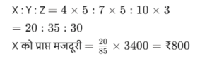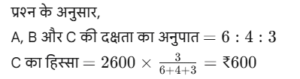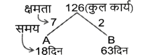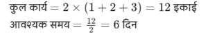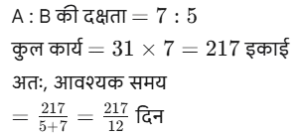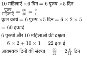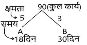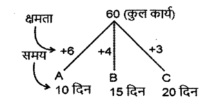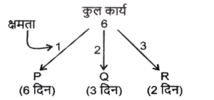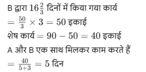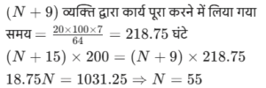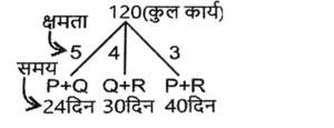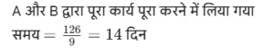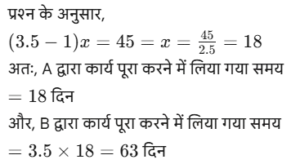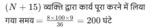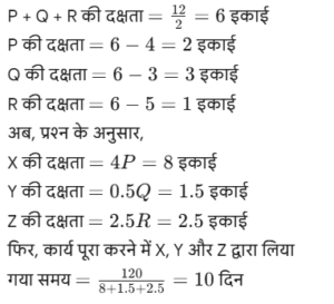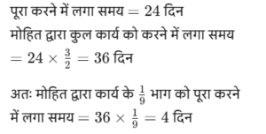 कार्य और समय (भाग-IV)Total Questions: 5041. मोहित एक काम का 2/3 भाग 24 दिनों में कर सकता है, तो वह उस काम का 1/9 भाग कितने दिनों में करेगा। [SSC CGL 19/07/2023 (1st shift)](a) 8(b) 4(c) 6(d) 5Correct Answer: (b) 4Solution:मोहित द्वारा कार्य के 2/3 भाग को42. 10 महिलाएं किसी कार्य को 6 दिन में पूरा कर सकती हैं और 6 पुरुष उसी कार्य को 5 दिन में पूरा कर सकते हैं। यदि सभी पुरुष और महिलाएं एक साथ मिलकर कार्य करें, तो उन्हें इस कार्य को पूरा करने में कितने दिन लगेंगे? [SSC CGL 19/07/2023 (3rd shift)](a) 2⁸⁄₁₁(b) 4⁶⁄₁₁(c) 1²⁄₁₁(d) 3⁴⁄₁₁Correct Answer: (a) 2⁸⁄₁₁Solution:कुल कार्य को बराबर करने पर :-43. (N + 15) व्यक्ति, प्रत्येक प्रतिदिन 9 घंटे काम करके 8 दिन में किसी कार्य का 36% पूरा कर सकते हैं। (N + 9) व्यक्ति शेष कार्य को 20 दिन में पूरा कर सकते हैं, यदि उनमें से प्रत्येक प्रतिदिन 7 घंटे कार्य करता है। तब N का मान ज्ञात कीजिए। [SSC CGL 19/07/2023 (4th shift)](a) 55(b) 52(c) 64(d) 50Correct Answer: (a) 55Solution:प्रश्न के अनुसार,44. A और B अलग-अलग एक कार्य को क्रमशः 18 दिन और 30 दिन में पूरा कर सकते हैं A और B एक साथ कार्य करना शुरू करते हैं, लेकिन A कार्य पूरा होने से 16 ²⁄₃ दिन पहले काम छोड़ देता है और B अकेले शेष कार्य को पूरा करता है। A ने कितने दिन तक कार्य किया? [SSC CGL 20/07/2023 (1st shift)](a) 4(b) 5(c) 6(d) 3Correct Answer: (b) 5Solution:45. A, B और C एक काम को क्रमशः 10 दिन, 15 दिन और 20 दिन में पूरा कर सकते हैं। उन्होंने उस काम को एक साथ मिलकर पूरा किया और मजदूरी के रूप में ₹2,600 प्राप्त किए। C की मजदूरी ज्ञात करें। [SSC CGL 20/07/2023 (2nd shift)](a) ₹550(b) ₹600(c) ₹575(d) ₹625Correct Answer: (b) ₹600Solution:46. P और Q एक कार्य को 24 दिनों में पूरा कर सकते हैं, Q और R इसी कार्य को 30 दिनों में पूरा कर सकते हैं, जबकि P और R उस कार्य को 40 दिनों में पूरा कर सकते हैं। X, P से चार गुना कुशल है, Y. Q का आधा कुशल है, और Z, R से 2.5 गुना कुशल है। यदि X, Y और Z एक साथ कार्य करते हैं, तो समान कार्य को पूरा करने के लिए आवश्यक दिनों की संख्या ज्ञात कीजिए। [SSC CGL 20/07/2023 (3rd shift)](a) 9(b) 12(c) 8(d) 10Correct Answer: (d) 10Solution:47. X, Y और Z ने ₹3,400 की लागत वाला एक कार्य पूरा किया। x ने 5 दिन के लिए, ४ ने 7 दिन के लिए और 2 ने 10 दिन के लिए कार्य किया। यदि उनकी दैनिक मजदूरी 4:5:3 के अनुपात में है, तो x को कितनी राशि प्राप्त होगी? [SSC CGL 20/07/2023 (4th shift)](a) ₹700(b) ₹900(c) ₹800(d) ₹600Correct Answer: (c) ₹800Solution:उनके वेतन का अनुपात :-48. A, B से 3.5 गुना तेजी से कार्य करता है, और A किसी कार्य को पूरा करने में B से 45 दिन कम लेता है, जब प्रत्येक अकेले कार्य करता है। यदि A और B एक साथ कार्य करते हैं तो उसी कार्य को पूरा करने में लगने वाले दिनों की संख्या ज्ञात कीजिए। [SSC CGL 21/07/2023 (1st shift)](a) 10.5(b) 17.5(c) 21(d) 14Correct Answer: (d) 14Solution:A : B की दक्षता = 3.5 : 149. A, B से 40% अधिक कुशल है यदि A अकेले किसी काम को 31 दिनों में पूरा कर सकता है, तो दोनों को मिलकर उस काम को पूरा करने में कितने दिनों का समय लगेगा? [SSC CGL 21/07/2023 (4th shift)](a) 217/12(b) 515/32(c) 215/12(d) 517/32Correct Answer: (a) 217/12Solution:50. P एक कार्य को पूरा करने में Q से दोगुना या R से तीन गुना समय लेता है। यदि वे एक साथ कार्य करें, तो वे कार्य को 