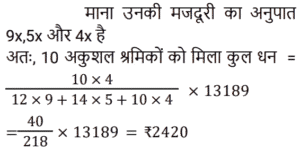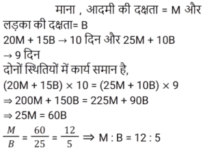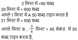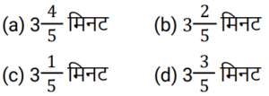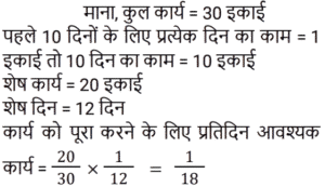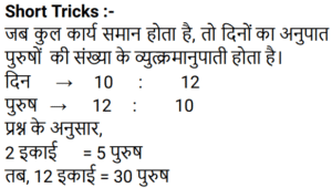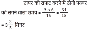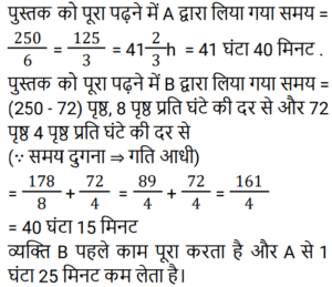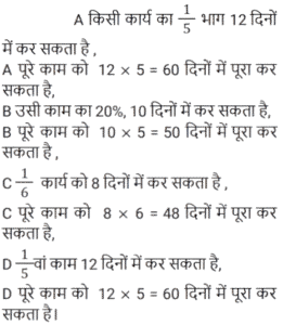 कार्य और समयTotal Questions: 5011. रुचिका को एक काम को 22 दिनों में पूरा करना था। हालांकि, पहले 10 दिनों के दौरान उसने प्रत्येक दिन केवल 1/30 काम किया। रुचिका को 11वें दिन से प्रतिदिन कार्य का कितना हिस्सा करना होगा ताकि कार्य समय पर पूरा किया जा सके? [NTPC CBT II Level 4 (10/05/2022) Shift 1](a) 2/39(b) 3/44(c) 1/18(d) 1/19Correct Answer: (c) 1/18Solution:12. 12 कुशल, 14 अर्ध-कुशल और 10 अकुशल श्रमिक, किसी कार्य को ₹13189 में पूरा करते हैं। यदि उनकी व्यक्तिगत मजदूरी का अनुपात 9 : 5 : 4 है, तो 10 अकुशल श्रमिकों द्वारा अर्जित कुल धनराशि (₹ में) कितनी होगी? [NTPC CBT II Level 2 (16/06/2022) Shift 3](a) 3240(b) 3420(c) 2420(d) 2240Correct Answer: (c) 2420Solution:13. 20 आदमी और 15 लड़के एक काम को 10 दिनों में कर सकते हैं, 25 आदमी और 10 लड़के इसे 9 दिनों में कर सकते हैं। एक आदमी और एक लड़के द्वारा किए गए दैनिक कार्यों का अनुपात ज्ञात कीजिए। [NTPC CBT-I 04/01/2021 (Evening)](a) 14 : 5(b) 5 : 12(c) 12 : 5(d) 5 : 14Correct Answer: (c) 12 : 5Solution:14. कार से मुंबई से पुणे जाते समय मुझे पता लगा कि एक टायर में दो पंचर हैं। अपने पुराने अनुभव के आधार पर मेरा मानना था कि पहला पंचर अकेले 9 मिनट में टायर को सपाट कर देता है और दूसरा 6 मिनट में कर देता है। यदि हवा एक स्थिर दर से निकलती है, तो टायर को सपाट करने में दोनों पंचर एक साथ कितना समय लेंगे? [NTPC CBT-I 05/01/2021 (Evening)](a)(b)(c)(d)Correct Answer: (d)Solution:15. एक पुस्तक में 250 पृष्ठ हैं। व्यक्ति A एक घंटे में 6 पृष्ठ पढ़ता है। व्यक्ति B एक घंटे में 8 पृष्ठ पढ़ता है। पुस्तक में 72 पृष्ठों के दो अध्याय हैं जिन्हें पढ़ना व्यक्ति B के लिए कठिन है, इसलिए व्यक्ति B उन पृष्ठों को पढ़ने में दोगुना समय लेता है। उनमें से कौन दूसरे की तुलना में और कितनी जल्दी पुस्तक को खत्म करेगा? [NTPC CBT-I 16/01/2021 (Morning)](a) व्यक्ति A, 1 घंटे 35 मिनट(b) व्यक्ति B, 1 घंटे 25 मिनट(c) व्यक्ति A, 1 घंटे 25 मिनट(d) व्यक्ति B, 1 घंटे 35 मिनटCorrect Answer: (b) व्यक्ति B, 1 घंटे 25 मिनटSolution:16. पुरुषों के एक समूह ने एक काम को 10 दिनों में पूरा करने का फैसला किया, लेकिन उनमें से पाँच अनुपस्थित रहे। यदि शेष समूह ने 12 दिनों में कार्य पूरा किया, तो पुरुषों की वास्तविक संख्या ज्ञात कीजिए। [NTPC CBT-I 25/01/2021 (Morning)](a) 25 पुरुष(b) 30 पुरुष(c) 40 पुरुष(d) 24 पुरुषCorrect Answer: (b) 30 पुरुषSolution:17. कंप्यूटर गेम में एक निर्माता 20 घंटे में एक दीवार बना सकता है जबकि एक विध्वंसक (नष्ट करने वाला) ऐसी दीवार को 50 घंटे में पूरी तरह से ध्वस्त कर सकता है। निर्माता और विध्वंसक दोनों को शुरू में समतल जमीन पर एक साथ काम करने के लिए लगाया गया था। लेकिन 30 घंटे के बाद विध्वंसक को हटा दिया गया। दीवार बनाने में कुल कितना समय लगा? [NTPC CBT-I 31/01/2021 (Morning)](a) 32 घंटे(b) 32 घंटे 40 मिनट(c) 33 घंटे 20 मिनट(d) 32 घंटे 20 मिनटCorrect Answer: (a) 32 घंटेSolution:18. चार व्यक्ति A, B, C और D एक कार्य को क्रमशः 2/3 घंटे, 3/4 घंटे, 4/5 घंटे और 1/5 घंटे में पूरा करते हैं। निम्नलिखित में से किसने कार्य को पूरा करने में सबसे अधिक समय लिया? [NTPC CBT-I 02/02/2021 (Morning)](a) B(b) D(c) C(d) ACorrect Answer: (c) CSolution:19. A, 1 मिनट में 50 शब्द टा