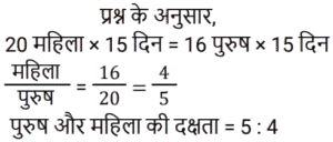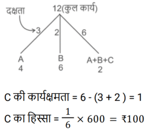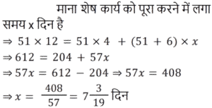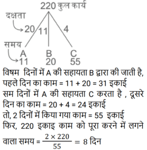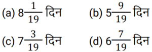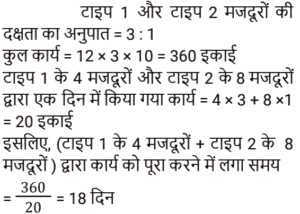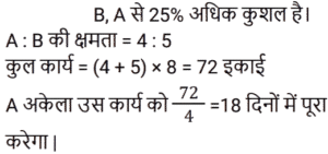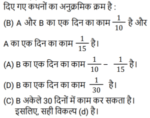 कार्य और समयTotal Questions: 5021. राम सुबह 7 केले, दोपहर में 8 और शाम को 3 केले खाता है। वह एक दिन में कितने दर्जन केले खाता है? [NTPC CBT-I 04/03/2021 (Evening)](a) 2/15(b) 3/2(c) 8/5(d) 8/15Correct Answer: (b) 3/2Solution:22. मजदूरों के दो टाइप हैं। पहले टाइप के मजदूर दूसरे टाइप के मजदूर से तीन गुना ज्यादा कार्य करते हैं। पहले टाइप के 12 मजदूर किसी कार्य को 10 दिनों में कर डालते हैं। इसी कार्य को पूरा करने के लिए पहले टाइप के 4 मजदूरों और दूसरे टाइप के 8 मजदूरों को कितना समय लगेगा? [RRB ALP Tier-I 09/08/2018 (Morning)](a) 17(b) 20(c) 18(d) 16Correct Answer: (c) 18Solution:23. प्रनीत ने अपनी यात्रा दोपहर के 2:45:46 बजे शुरू की और वह गंतव्य पर शाम के 4:55:57 बजे पहुँचा। अमित ने प्रनीत के 58 मिनट 40 सेकंड बाद यात्रा शुरू की और गंतव्य पर उसके 50 मिनट 29 सेकंड बाद पहुँच गया। अमित ने अपनी यात्रा पूरी करने में कितना समय लगाया? [RRB ALP Tier-I 13/08/2018 (Evening)](a) 1 घंटा 59 मिनट(b) 2 घंटे 2 मिनट(c) 2 घंटे 1 मिनट 12 सेकंड(d) 2 घंटे 2 सेकंडCorrect Answer: (b) 2 घंटे 2 मिनटSolution:24. A और B मिलकर एक कार्य को 10 दिनों में कर सकते हैं। यदि A उसी कार्य को अकेला 15 दिनों में कर सकता है, तो B अकेला उसी कार्य को कितने दिनों में कर सकता है? नीचे दिए गए चरणों को क्रम में व्यवस्थित करें। [RRB ALP Tier-I 30/08/2018 (Morning)](A) B का एक दिन का कार्य 1/10 − 1/15(B) A और B का एक दिन का कार्य 1/10 और A का एक दिन का कार्य 1/15 है।(C) B कार्य को अकेला 30 दिनों में कर सकता है।(D) B का एक दिन का कार्य 1/30 है।(a) BCAD(b) ABDC(c) BDAC(d) BADCCorrect Answer: (d) BADCSolution:25. 20 महिलाएँ एक कार्य को 15 दिनों में पूरा कर सकती हैं। 16 पुरुष उसी कार्य को 15 दिनों में पूरा कर सकते हैं। एक पुरुष और एक महिला की कार्य-कुशलता के बीच का अनुपात ज्ञात कीजिए। [Group D 17/08/2022 (Morning)](a) 5 : 3(b) 3 : 2(c) 4 : 3(d) 5 : 4Correct Answer: (d) 5 : 4Solution:26. A एक साड़ी को 11 दिनों में, B उसे 20 दिनों में और C उसे 55 दिनों में पेंट कर सकता है। यदि वे स्वतंत्र रूप से काम करते हैं और प्रत्येक विषम दिन पर B तथा प्रत्येक सम दिन पर C, A की सहायता करता है, तो कार्य कितने दिनों में पूरा होगा? [Group D 17/08/2022 (Evening)](a) 8 दिन(b) 18 दिन(c) 12 दिन(d) 9 दिनCorrect Answer: (a) 8 दिनSolution:27. X और Y एक कार्य को क्रमशः 8 दिन और 12 दिन में पूरा कर सकते हैं। यदि वे वैकल्पिक दिनों में कार्य करते हैं, जिसमें X पहले दिन कार्य करता है, तो दोनों को कार्य पूरा करने में कितना समय लगेगा? [Group D 17/08/2022 (Evening)](a)(b)(c)(d)Correct Answer: (a)Solution:28. 51 आदमी एक कार्य को 12 दिन में पूरा कर सकते हैं। उनके कार्य शुरू करने के चार दिन बाद, 6 और आदमी उनके साथ कार्य में शामिल हो जाते हैं। अब वे शेष कार्य को कितने दिन में पूरा कर लेंगे? [Group D 22/08/2022 (Afternoon)](a)(b)(c)(d)Correct Answer: (c)Solution:29. A और B मिलकर किसी कार्य को 8 दिनों में पूरा करते हैं। यदि B, A से 25% अधिक कुशल है, तो A अकेला उसी कार्य को कितने दिनों में पूरा करेगा? [Group D 22/08/2022 (Evening)](a) 24 दिन (b) 12 दिन (c) 18 दिन(d) 6 दिनCorrect Answer: (c) 18 दिनSolution:30. A और B एक कार्य को 600 रुपये में पूरा करने का अनुबंध करते हैं। A अकेले इसे 4 दिनों में पूरा कर सकता है जबकि B अकेले इसे 6 दिनों 