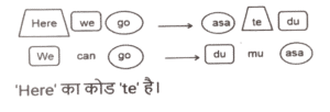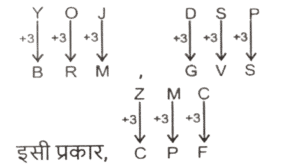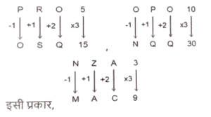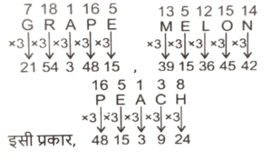 कोडिंग डिकोडिंग (भाग-I)Total Questions: 5011. एक निश्चित कूट भाषा में, 'FEATURE' को 1001010 के रूप में कूटबद्ध किया जाता है और 'CANDID' को 101101 के रूप में कूटबद्ध किया जाता है। इसी कूट भाषा में 'HOLIDAY' को किस प्रकार से कूटबद्ध किया जाएगा ? [Higher Secondary 21/06/2024 (Shift - 2)](a) 1010101(b) 1010100(c) 1001101(d) 1011001Correct Answer: (a) 1010101Solution:तर्क :- स्वर को '0' और व्यंजन को '1' से कोडित किया गया है। FEATURE :- (1001010) CANDID :- (101101) इसी प्रकार, HOLIDAY :- (1010101)12. एक कूट भाषा में 'SLEEK' को 37 के रूप में और 'FOLD' को 25 के रूप में कूटबद्ध किया जाता है। उसी भाषा में 'YATCH' को किस प्रकार कूटबद्ध किया जाएगा ? [Matriculation Level 24/06/2024 (Shift - 1)](a) 40(b) 48(c) 52(d) 42Correct Answer: (d) 42Solution:तर्क :- (अक्षरों के स्थानीय मान का योग) - (अक्षरों की संख्या) × 3 SLEEK :- (19 + 12 + 5 + 5 + 11) - (5) × 3 ⇒ (52) - 15 = 37 FOLD :- (6 + 15 + 12 + 4) - (4) × 3 ⇒ (37) - (12) = 25 इसी प्रकार, YATCH :- (25 + 1 + 20 + 3 + 8) - (5) × 3 ⇒ 57 - 15 = 4213. एक निश्चित कूट भाषा में, ‘TALKER' को '!@#$%' और 'TALKED' को '$%@#!£' लिखा गया है। उसी कूट भाषा में 'D' को क्या लिखा जाएगा ? [SSC CHSL Tier II 02/11/2023](a) %(b) ©(c) !(d) £Correct Answer: (d) £Solution:TALKER और TALKED की तुलना करने पर हम पाते हैं कि केवल R और D भिन्न हैं। इसलिए, R का कोड = © और D का कोड = £ है।14. एक निश्चित कूट भाषा में "GRAPE" को 21 - 54 - 3 - 48 - 15 के रूप में कूटबद्ध किया गया है, और "MELON" को 39 - 15 - 36 - 45 - 42 के रूप में कूटबद्ध किया गया है उसी कूट भाषा में "PEACH" को किस प्रकार कूटबद्ध किया जाएगा ? [SSC CPO 05/10/2023 (1st Shift)](a) 49 - 15 - 3 - 9 - 27(b) 45 - 16 - 3 - 9 - 24(c) 48 - 15 - 3 - 8 - 27(d) 48 - 15 - 3 - 9 - 24Correct Answer: (d) 48 - 15 - 3 - 9 - 24Solution:15. एक निश्चित कूट भाषा में "TRAUMA" को "36" और "STIL" को "24" के रूप में कूटबद्ध किया गया है। उसी कूट भाषा में "OBEIDEINT" को किस प्रकार कूटबद्ध किया जाएगा ? [SSC CPO 04/10/2023 (1st Shift)](a) 44(b) 54(c) 72(d) 84Correct Answer: (b) 54Solution:तर्क : (दिए गए शब्द में अक्षरों की संख्या) × 6 TRAUMA : (6) × 6 = 36 STIL:- (4) × 6 = 24 इसी प्रकार, OBEIDEINT :- (9) × 6 = 5416. एक निश्चित कूट भाषा में, "Here we go" को "asa te du" के रूप में कूटबद्ध किया गया है, और "We can go" को "du mu asa" के रूप में कूटबद्ध किया गया है। शब्द "Here" के लिए कूट क्या होगा ? [SSC CPO 03/10/2023 (3rd Shift)](a) asa(b) mu(c) te(d) duCorrect Answer: (c) teSolution:17. एक निश्चित प्रकार से 'PRO 5' का संबंध 'OSQ 15' से है। ठीक उसी प्रकार 'OPO 10' का संबंध 'NQQ 30' से है। उसी तर्क का उपयोग करते हुए बताइए कि निम्नलिखित में से किसका संबंध 'MAC 9' से है? [SSC CPO 03/10/2023 (2nd Shift)](a) NZA 3(b) NZA 27(c) OZA 3(d) NZB 3Correct Answer: (a) NZA 3Solution:18. एक निश्चित कूट भाषा में 'VATT' को '65' और 'STOLK' को '79' के रूप में कूटबद्ध किया गया है। उसी कूट भाषा में 'GENEROUS' को किस प्रकार कूटबद्ध किया जाएगा ? [SSC CPO 03/10/2023 (1st Shift)](a) 204(b) 216(c) 106(d) 116Correct Answer: (c) 106Solution:तर्क :- (अक्षरों के स्थानीय मान का जोड़) + 2 VATT:- (22 + 1 + 20 + 20) + 2 ⇒ 63 + 2 = 65 STOLK - (19 + 20 + 15 + 12 + 11) + 2 ⇒ 77 + 2 = 79 इसी प्रकार, GENEROUS :- ( 7 + 5 + 14 + 5 + 18 + 15 + 21 + 19) + 2 ⇒ 104 + 2 = 10619. एक निश्चित कूट भाषा में, 'YOJ' को 'BRM' लिखा गया है और 'DSP' को 'GVS' लिखा गया है। उस कूट भाषा में 'ZMC' को कैसे लिखा जाएगा ? S [SSC CPO 03/10/2023 (1st Shift)](a) DQE(b) CPF(c) CQF(d) DPGCorrect Answer: (b) CPFSolution:20. एक निश्चित कूट भाषा में, 'RHETORIC' को '6' लिखा गया है और 'GURGLE' को '4' के लिखा गया है। उसी कूट भाषा में "SIGNATURE" को कैसे लिखा जाएगा ? [SSC CHSL 02/08/2023 (2nd Shift)](a) 5(b) 7(c) 8(d) 12Correct Answer: (b) 7Solution:तर्क :- (अक्षरों की संख्या) – 2 R
