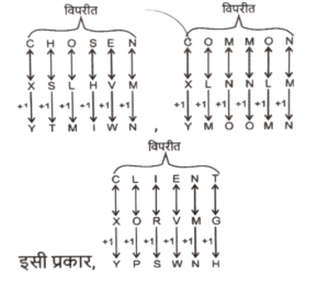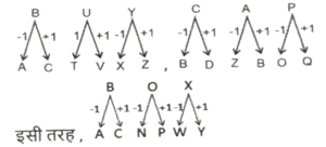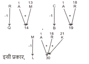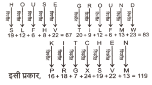 कोडिंग डिकोडिंग (भाग-II)Total Questions: 5041. एक निश्चित कूट भाषा में, 'I swim fast' को 'cp Ik bs' के रूप में कूटबद्ध किया जाता है और 'may । go' को 'ap sb Ik' के रूप में कूटबद्ध किया जाता है। उस कूट भाषा में" को किस प्रकार कूटबद्ध किया जाता है ? [SSC MTS 30/09/2024 (Morning)](a) bs(b) lk(c) sb(d) cpCorrect Answer: (b) lkSolution:I swim fast :- cp lk bs......(i) may I go :- ap sb lk.........(ii) (i) और (ii) से 'I' और 'Ik' उभयनिष्ठ हैं। कोड'।' = 'lk' है।42. एक कूट भाषा में, 'COLONY' को '48' के रूप में कूटबद्ध किया जाता है और 'INTERCHANGE' को '88' के रूप में कूटबद्ध किया जाता है। उसी भाषा में 'MOUNTAIN' को किस प्रकार कूटबद्ध किया जाएगा ? [SSC MTS 30/09/2024 (Morning)](a) 64(b) 86(c) 66(d) 84Correct Answer: (a) 64Solution:तर्क :- (अक्षरों की संख्या) × 8 COLONY :- (6) × 8 = 48 INTERCHANGE :- (11) × 8 = 88 इसी प्रकार, MOUNTAIN :- (8) × 8 = 6443. एक निश्चित कूट भाषा में, 'DONER' को '52369' लिखा जाता है और 'DROVE' को '32957' लिखा जाता है। उसी कूट भाषा में 'N' को कैसे लिखा जाएगा? [SSC MTS 30/09/2024 (Afternoon)](a) 7(b) 9(c) 6(d) 5Correct Answer: (c) 6Solution:DONER :- 52369...... (i) DROVE :- 32957......(ii) (i) और (ii) से 'DROE' और '3259' उभयनिष्ठ हैं। 'N' का कोड = '6' है।44. एक निश्चित कूट भाषा में, 'TALE को '5173' के रूप में कूटबद्ध किया जाता है और 'AIDS' को '6452' के रूप में कूटबद्ध किया जाता है। दी गई कूट भाषा में 'A' के लिए कूट क्या है ? [SSC MTS 01/10/2024 (Morning)](a) 6(b) 5(c) 1(d) 2Correct Answer: (b) 5Solution:TALE :- 5173.....(i) AIDS :- 6452......(ii) (i) और (ii) से 'A' और '5' उभयनिष्ठ हैं। 'A' का कोड = '5' है45. एक निश्चित कूट भाषा में, 'BUY' को 'ACTVXZ' के रूप में लिखा जाता है और 'CAP' को 'BDZBOQ' के रूप में लिखा जाता है। उसी भाषा में 'BOX' को किस प्रकार लिखा जाएगा? [SSC MTS 07/10/2024 (Afternoon)](a) ACNPWY(b) ACMPUY(c) CDPQYZ(d) ACMPWYCorrect Answer: (a) ACNPWYSolution:46. एक निश्चित कूट भाषा में, 'toy is new' को 'bz tq gl' के रूप में कूटबद्ध किया जाता है और 'give me toy' को 'hx vm tq' के रूप में कूटबद्ध किया जाता है। दी गई भाषा में 'toy को किस प्रकार कूटबद्ध किया गया है ? [SSC MTS 08/10/2024 (Afternoon)](a) bz(b) hx(c) tq(d) vmCorrect Answer: (c) tqSolution:toy is new :- bz tą gl ...... (i) give me toy :- hx vm tq .......(ii) (i) और (ii) से 'toy' और 'tq' उभयनिष्ठ हैं। 'toy' का कोड = 'tq' है।47. किसी निश्चित कूट भाषा में 'CHOSEN' को 'YTMIWN' के रूप में कूटबद्ध किया जाता है और 'COMMON' को 'YMOOMN' के रूप में कूटबद्ध किया जाता है। उसी भाषा में 'CLIENT' को किस प्रकार कूटबद्ध किया जाएगा ? [SSC MTS 08/10/2024 (Afternoon)](a) YPSVNF(b) YPSXNG(c) YPTXNG(d) YPSWNHCorrect Answer: (d) YPSWNHSolution:48. एक निश्चित कूट भाषा में, यदि 'HOUSE' को '67' लिखा जाता है तथा 'GROUND' को '83' लिखा जाता है, तो उसी कूट भाषा में 'KITCHEN को कैसे लिखा जाएगा ? [SSC MTS 08/10/2024 (Evening)](a) 119(b) 110(c) 130(d) 122Correct Answer: (a) 119Solution:49. एक निश्चित कूट भाषा में, 'PINK' को 15 के रूप में कूटबद्ध किया जाता है और 'PAINT' को 24 के रूप में कूटबद्ध किया जाता है। उसी भाषा में 'WILDNESS' को किस प्रकार कूटबद्ध किया जाएगा ? [SSC MTS 09/10/2024 (Afternoon)](a) 63(b) 52(c) 48(d) 51Correct Answer: (a) 63Solution:तर्कः (अक्षरों की संख्या)² - 1 PINK → (4)² - 1 = 15 PAINT → (5)² - 1 = 24 इसी प्रकार WILDNESS → (8)² - 1 = 6350. एक कूट भाषा में, 'RAM' को 'Q14' के रूप में लिखा जाता है और 'CAR' को 'B19' के रूप में लिखा जाता है। इसी कूट भाषा में 'MARK को कैसे लिखा जाएगा ? [SSC MTS 09/10/2024 (Evening)](a) L26(b) M29(c) M30(d) L30Correct Answer: (d) L30Solution:Submit Quiz« Previous12345