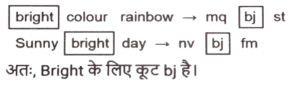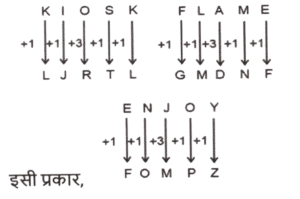 कोडिंग डिकोडिंग (भाग-IV)Total Questions: 5021. एक निश्चित कूट भाषा में, 'D' को '16' के रूप में कूटबद्ध किया जाता है, 'B' को '4' के रूप में कूटबद्ध किया जाता है और 'T' को '400' के रूप में कूटबद्ध किया जाता है। उसी भाषा में 'H' को किस प्रकार कूटबद्ध किया जाएगा ? [SSC CGL 26/09/2024 (2nd Shift)](a) 8(b) 64(c) 25(d) 36Correct Answer: (b) 64Solution:तर्क :- संख्या = (वर्णमाला में स्थानीय )² D → (4)² = 16 B → (2)² = 4 T→ (20)² = 400 इसी प्रकार, H→ (8)² = 6422. एक निश्चित कूट भाषा में, 'FUTURE' को 'IXWXUH' के रूप में लिखा जाता है और 'ISLAND' को 'LVODQG' के रूप में लिखा जाता है। उसी भाषा में 'JERSEY' को किस प्रकार लिखा जाएगा ? [SSC CGL 26/09/2024 (2nd Shift)](a) KGTVGA(b) KHTUHA(c) MHTVGB(d) MHUVHBCorrect Answer: (d) MHUVHBSolution:23. एक निश्चित कूट भाषा में, 'bright colour rainbow' को 'mq bj st' के रूप में कूटबद्ध किया जाता है और 'sunny bright day' को 'nv bj fm' के रूप में कूटबद्ध किया जाता है। उस भाषा में 'bright' को किस प्रकार कूटबद्ध किया है? [SSC CGL 26/09/2024 (2nd Shift)](a) bj(b) nv(c) st(d) mqCorrect Answer: (a) bjSolution:24. एक निश्चित कूट भाषा में 'strong and mighty' को 'ui yv tk' लिखा जाता है और 'soft yet strong' को 'hd tk bw' लिखा जाता है। उसी कूट भाषा में 'strong' को कैसे लिखा जाएगा ? [SSC CHSL 01/07/2024 (1st Shift)](a) ui(b) bw(c) hd(d) tkCorrect Answer: (d) tkSolution:strong and mighty → ui yv tk..... (i) soft yet strong → hd tk bw...... (ii) (i) और (ii) से 'strong' और 'tk' उभयनिष्ठ हैं। 'strong' का कोड = 'tk'।25. एक निश्चित कूट भाषा में, 'BEAM' को '2349' लिखा जाता है और 'MEAN' को '4327' लिखा जाता है। उस कूट भाषा में 'N' को कैसे लिखा जाएगा ? [SSC CHSL 01/07/2024 (1st Shift)](a) 2(b) 3(c) 7(d) 4Correct Answer: (c) 7Solution:BEAM → 2349 ...... (i) ΜΕΑΝ → 4327 .......(ii) (i) और (ii) से 'E', 'A' 'M' और '2', '3' '4' उभयनिष्ठ हैं। 'N' का कोड = '7'।26. एक निश्चित कूट भाषा में, 'KIOSK' को 'LJRTL' लिखा जाता है और 'FLAME' को 'GMDNF' लिखा जाता है। उस कूट भाषा में 'ENJOY' को कैसे लिखा जाएगा ? [SSC CHSL 01/07/2024 (2nd Shift)](a) FOMPZ(b) ENOQZ(c) GNMRY(d) EMOQYCorrect Answer: (a) FOMPZSolution:27. एक निश्चित कूट भाषा में, 'this is music' को Ta Bu Ka' लिखा जाता है और who touched this' को 'Pi Ka Bi' लिखा जाता है। उस कूट भाषा में 'this' को कैसे लिखा जाएगा ? [SSC CHSL 01/07/2024 (3rd Shift)](a) Bu(b) Ta(c) Bi(d) KaCorrect Answer: (d) KaSolution:this is music → Ta Bu Ka....... (i) who touched this → Pi Ka Bi..... (ii) (i) और (ii) से 'this' और 'Ka' उभयनिष्ठ हैं। 'this' का कूट = 'Ka'.28. एक निश्चित कूट भाषा में, 'CERTAIN' को '9643821' लिखा जाता है और 'UNCERTAIN' को '964382117' लिखा जाता है। तो उस कूट भाषा में 'U' को कैसे लिखा जाएगा ? [SSC CHSL 01/07/2024 (3rd Shift)](a) 6(b) 7(c) 1(d) 4Correct Answer: (b) 7Solution:CERTAIN → 9643821..... (i) UNCERTAIN → 964382117....(ii) (i) और (ii) से CERTAIN और 9643821 उभय-निष्ठ हैं क्योंकि अक्षरों को सीधे उनकी संबंधित संख्या के रूप में कोडित किया जाता है। 'U' का कोड = '7' होगा क्योंकि 'N' = 1 का कोड पहले ही दिया गया है।29. एक निश्चित कूट भाषा में, 'make someone happy' को 'Ab Te Dp' लिखा जाता है और 'someone robbed him' को 'Te Ko Vi' लिखा जाता है। उस कूट भाषा में 'someone' को कैसे लिखा जाएगा ? [SSC CHSL 01/07/2024 (4th Shift)](a) Ko(b) Ab(c) Te(d) ViCorrect Answer: (c) TeSolution:make someone happy → Ab Te Dp........ (i) someone robbed him → Te Ko Vi......... (ii) (i) और (ii) से 'someone' और 'Te' उभयनिष्ठ हैं। 'someone' का कूट = 'Te.30. एक निश्चित कूट भाषा में, 'art of war' को 'gb pr ml' लिखा जाता है और 'the lost art' को 'ml sj ak' लिखा जाता है। उसी कूट भाषा में 'art' को कैसे लिखा जाएगा ? [SSC CHSL 02/07/2024 (1st Shift)](a) ak(b) gb(c) pr(d) mlCorrect Answer: (d) mlSolution:art of war → gb pr ml...... (i) the lost art → ml sj ak.......(ii) (i) और (ii) दोनों से 'art' का कोड = 'ml'.Submit Quiz« Pre
