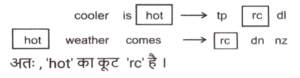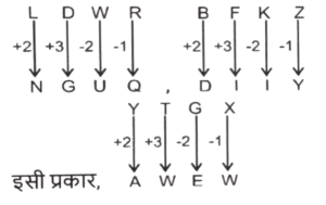 कोडिंग डिकोडिंग (भाग-IV)Total Questions: 5041. एक निश्चित कूट भाषा में, 'hands are dirty' को 'ca bx vp' लिखा जाता है और 'dirty things flies' को 'by vp cb' लिखा जाता है। उसी कूट भाषा में 'dirty' को कैसे लिखा जाएगा ? [SSC CHSL 04/07/2024 (2nd Shift)](a) vp(b) by(c) cb(d) bxCorrect Answer: (a) vpSolution:hands are dirty → ca bx vp......(i) dirty things flies → by vp cb......(ii) (i) और (ii) से 'dirty' और 'vp' उभय-निष्ठ हैं। 'dirty' का कूट = 'vp'42. एक निश्चित कूट भाषा में, 'CODE' को 1573' लिखा जाता है और DICE' को 7185' लिखा जाता है। उसी कूट भाषा में 'O' को कैसे लिखा जाएगा ? [SSC CHSL 05/07/2024 (1st Shift)](a) 8(b) 3(c) 7(d) 5Correct Answer: (b) 3Solution:CODE → 1 5 7 3......(i) DICE → 7 1 8 5.......(ii) (i) और (ii) से 'C', 'D', 'E' और '1', '5' और '7' उभयनिष्ठ हैं। '0' का कोड = '3'.43. एक निश्चित कूट भाषा में, 'BAKE' को '2496' लिखा जाता हैऔर 'CAKE' को '4369' लिखा जाता है। [SSC CHSL 05/07/2024 (1st Shift)]उसी कूट भाषा में 'B' को कैसेलिखा जाएगा ? (a) 2(b) 4(c) 6(d) 9Correct Answer: (a) 2Solution:BAKE → 2496....... (i) CAKE → 4369.......(ii) (i) और (ii) से 'A', 'K', 'E' और '4', '6' और '9' उभयनिष्ठ हैं। 'B' का कोड = '2'.44. एक निश्चित कूट भाषा में, 'sanitiser saves us' को 'ra kl mq' लिखा जाता है और 'let us go' को 'ki mt ax' लिखा जाता है। उसी कूट भाषा में 'us' को कैसे लिखा जाएगा ? [SSC CHSL 05/07/2024 (4th Shift)](a) ra(b) mt(c) kl(d) mqCorrect Answer: (c) klSolution:sanitiser saves us → ra kl mq......(i) let us go → kl mt ax......(ii) (i) और (ii) से 'us' और 'ki' उभयनिष्ठ हैं। 'us' का कूट = 'kl'।45. एक निश्चित कूट भाषा में, 'FORK' को '6851' लिखा जाता है और 'FROG' को 5981' लिखा जाता है। उसी कूट भाषा में 'K' को कैसे लिखा जाएगा ? [SSC CHSL 08/07/2024 (2nd Shift)](a) 5(b) 9(c) 6(d) 1Correct Answer: (c) 6Solution:FORK → 6851..... (i) FROG → 5981....... (ii) (i) और (ii) से 'F', 'R', 'O' और '5', '8', '1' उभयनिष्ठ हैं। 'K' का कोड = '6'46. एक निश्चित कूट भाषा में, 'LDWR' को 'NGUQ' लिखा जाता है और BFKZ' को DIIY' लिखा जाता है। उस कूट भाषा में 'YTGX' को कैसे लिखा जाएगा ? [SSC CHSL 08/07/2024 (4th Shift)](a) AWEW(b) BWFV(c) YWFV(d) ZVFVCorrect Answer: (a) AWEWSolution:47. एक निश्चित कूट भाषा में, 'future is bright' को 'pl mk ni' लिखा जाता है और 'bright shooting star' को dg rz pl' लिखा जाता है। उसी कूट भाषा में 'bright' को कैसे लिखा जाएगा? [SSC CHSL 09/07/2024 (3rd Shift)](a) ni(b) dg(c) pl(d) mkCorrect Answer: (c) plSolution:future is bright → pl mk ni.......(i) bright shooting star → dg rz pl.......(ii) (i) और (ii) से 'bright' और 'pl' उभयनिष्ठ हैं। 'bright' का कूट = 'pl'48. एक निश्चित कूट भाषा में, 'DIVERT' को '36' लिखा जाता है और DOLDRUMS को 64' लिखा जाता है। उस कूट भाषा में 'DOGMA' को कैसे लिखा जाएगा ? [SSC CHSL 10/07/2024 (1st Shift)](a) 64(b) 49(c) 25(d) 36Correct Answer: (c) 25Solution:तर्क :- (अक्षरों की संख्या)² DIVERT :- (6)² = 36 DOLDRUMS :- (8)² = 64 इसी प्रकार, DOGMA : - (5)² = 2549. एक निश्चित कूट भाषा में, 'PBI' को '27' लिखा जाता है और 'ZEBRA' को '125' लिखा जाता है। उस कूट भाषा में 'BIRD' को कैसे लिखा जाएगा ? [SSC CHSL 10/07/2024 (2nd Shift)](a) 37(b) 64(c) 25(d) 49Correct Answer: (b) 64Solution:तर्क :- (अक्षरों की संख्या)³ PBI :- (3)³ = 27 ZEBRA :- (5)³ = 125 इसी प्रकार, BIRD :- (4)³ = 6450. एक निश्चित कूट भाषा में, 'cooler is hot' को 'tp rc di' लिखा जाता है और 'hot weather comes' को 'rc dn nz' लिखा जाता है। उसी कूट भाषा में 'hot' को कैसे लिखा जाएगा ? [SSC CHSL 10/07/2024 (2nd Shift)](a) nz(b) dl(c) rc(d) dnCorrect Answer: (c) rcSolution:Submit Quiz« Previous12345