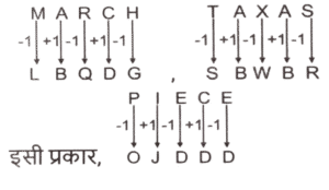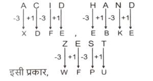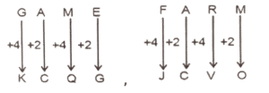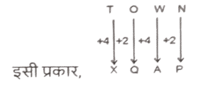 कोडिंग डिकोडिंग (भाग-V)Total Questions: 5021. एक निश्चित कूट भाषा में 'MAP' को '102' और 'ROT' को '56' के रूप में लिखा जाता है। उस भाषा में 'SEC' कैसे लिखा जाएगा ? [SSC CPO 27/06/2024 (3rd Shift)](a) 108(b) 98(c) 84(d) 112Correct Answer: (a) 108Solution:तर्क :- (विपरीत अक्षर के स्थानीय मान का योग) × 2 22. एक कूट भाषा में, 'PIG' को 29 के रूप में कूटबद्ध किया जाता है और 'COW' को 38 के रूप में कूटबद्ध किया जाता है। उसी भाषा में 'CAMEL' को किस प्रकार कूटबद्ध किया जाएगा ? [SSC CPO 27/06/2024 (3rd Shift)](a) 22(b) 27(c) 29(d) 34Correct Answer: (c) 29Solution:तर्क :- (अक्षर के स्थानीय मान का योग) - (अक्षर की संख्या) PIG:- (16 + 9 + 7) - 3 ⇒ (32) - 3 = 29 COW:- (3 + 15 + 23) - 3 ⇒ (41) - 3 = 38 इसी प्रकार, CAMEL :- (3 + 1 + 13 + 5 + 12) - 5 ⇒ (34) - 5 = 2923. एक कूट भाषा में 'GAME' को 'KCQG' के रूप में लिखा जाता है और 'FARM' को 'JCVO' के रूप में लिखा जाता है। इसी कूट भाषा में 'TOWN' को कैसे लिखा जाएगा ? [SSC CPO 28/06/2024](a) XAPQ(b) AXQP(c) PAXQ(d) XQAPCorrect Answer: (d) XQAPSolution: 24. एक निश्चित कूट भाषा में 'JAM' को '24' और 'GEL' को '24' के रूप में लिखा जाता है। उस भाषा में 'LAW' कैसे लिखा जाएगा ? [SSC CPO 28/06/2024 (1st Shift)](a) 24(b) 36(c) 28(d) 32Correct Answer: (b) 36Solution:तर्क :- (अक्षर के स्थानीय मान का योग) JAM :- (10 + 1 + 13) = 24 GEL :- (7 + 5 + 12) = 24 इसी प्रकार, LAW :- (12 + 1 + 23) = 3625. एक कूट भाषा में, 'PEN' को '70' और 'NEST' को '116' के रूप में कूटबद्ध किया जाता है। उसी भाषा में 'PEON' को कैसे कूटबद्ध किया जाएगा ? [SSC CPO 28/06/2024 (1st Shift)](a) 46(b) 99(c) 162(d) 100Correct Answer: (d) 100Solution:तर्क :- (अक्षर के स्थानीय मान का योग) × 2 PEN:- (16 + 5 + 14) × 2 ⇒ (35) × 2 = 70 NEST:- (14 + 5 + 19 + 20) × 2 ⇒ (58) × 2 = 116 इसी प्रकार, PEON :- (16 + 5 + 15 + 14) × 2 ⇒ (50) × 2 = 10026. एक निश्चित कूट भाषा में 'CITY' को '241872' के रूप में लिखा जाता है और 'DRUG' को '239620' के रूप में लिखा जाता है। उसी भाषा में 'GOLF' को किस प्रकार लिखा जाएगा ? [SSC CPO 28/06/2024 (1st Shift)](a) 18151215(b) 20121521(c) 7151212(d) 7121521Correct Answer: (b) 20121521Solution:27. एक निश्चित कूट भाषा में, 'MARCH' को 'LBQDG' लिखा जाता है और 'TAXAS' को 'SBWBR' लिखा जाता है। दी गई भाषा में 'PIECE' को किस प्रकार लिखा जाएगा ? [SSC CPO 28/06/2024 (2nd Shift)](a) OJDDD(b) OJDED(c) QJDDF(d) QHCEDCorrect Answer: (a) OJDDDSolution:28. एक निश्चित कूट भाषा में, 'HEMANT' को 24 - 15 - 39 - 3 - 42 - 60 और 'VINAY' को 66 - 27 - 42 - 3 - 75 के रूप में कूटबद्ध किया जाता है। उसी भाषा में 'MOHAN' को किस रूप में कूटबद्ध किया जाएगा ? [SSC CPO 28/06/2024 (2nd Shift)](a) 43 - 24 - 3 - 56 - 7(b) 36 - 3 - 41 - 24 - 39(c) 24 - 39 - 4 - 42 - 27(d) 39 - 45 - 24 - 3 - 42Correct Answer: (d) 39 - 45 - 24 - 3 - 42Solution:29. एक कूट भाषा में 'ACID' को 'XDFE' के रूप में लिखा जाता है और 'HAND' को 'EBKE' के रूप में लिखा जाता है। इसी कूट भाषा में 'ZEST' को कैसे लिखा जाएगा ? [SSC CPO 28/06/2024 (2nd Shift)](a) PUWF(b) WPUF(c) UWPF(d) WFPUCorrect Answer: (d) WFPUSolution:30. एक निश्चित कूट भाषा में, 'HEN' को '9' के रूप में कूटबद्ध किया जाता है और 'AFTER' को '25' के रूप में कूटबद्ध किया जाता है। उसी भाषा में 'SMALLEST' को किस प्रकार कूटबद्ध किया जाएगा ? [SSC CPO 28/06/2024 (2nd Shift)](a) 31(b) 56(c) 81(d) 64Correct Answer: (d) 64Solution:तर्क :- (अक्षर की संख्या)² HEN:- (3)² = 9 AFTER :- (5)² = 25 इसी प्रकार, SMALLEST :- (8)² = 64Submit Quiz« Previous12345Next »