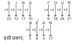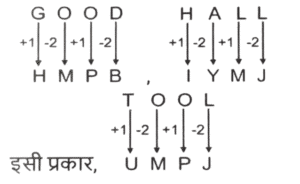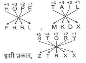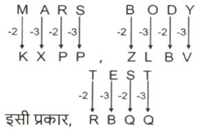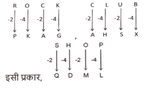 कोडिंग डिकोडिंग (भाग-V)Total Questions: 5031. एक कूट भाषा में 'GOOD' को 'HMPB' के रूप में लिखा जाता है और 'HALL' को 'IYMJ' के रूप में लिखा जाता है। इसी कूट भाषा में 'TOOL' को कैसे लिखा जाएगा ? [SSC CPO 28/06/2024 (3rd Shift)](a) UPJM(b) JUMP(c) UMPJ(d) PUMJCorrect Answer: (c) UMPJSolution:32. एक निश्चित कूट भाषा में, 'APPLE' को 250 के रूप में कूटबद्ध किया जाता है और 'BERRY' को 340 के रूप में कूटबद्ध किया जाता है। उसी भाषा में 'LITCHI' को किस रूप में कूटबद्ध किया जाएगा ? [SSC CPO 28/06/2024 (3rd Shift)](a) 305(b) 306(c) 350(d) 330Correct Answer: (a) 305Solution:तर्क :-(अक्षर के स्थानीय मान का योग) × 5 APPLE:- (1 + 16 + 16 + 12 + 5) × 5 ⇒ (50) × 5 = 250 BERRY:- (2 + 5 + 18 + 18 + 25) × 5 ⇒ (68) × 5 = 340 इसी प्रकार, LITCHI:- (12 + 9 + 20 + 3 + 8 + 9) × 5 ⇒ (61) × 5 = 30533. एक कूट भाषा में 'MARS' को 'KXPP' के रूप में लिखा जाता है और 'BODY' को 'ZLBV' के रूप में लिखा जाता है। इसी कूट भाषा में 'TEST' को कैसे लिखा जाएगा ? [SSC CPO 28/06/2024 (3rd Shift)](a) QRQB(b) RBQQ(c) RQBQ(d) QQRBCorrect Answer: (b) RBQQSolution:34. एक कूट भाषा में, 'HOPE' को 'FRRL' और 'TAIL' को 'MKDX' के रूप में कूटबद्ध किया जाता है। उसी भाषा में 'STORY' को कैसे कूटबद्ध किया जाएगा ? [SSC CPO 28/06/2024 (3rd Shift)](a) ZTRYY(b) ZTRXX(c) ZRTYY(d) ZRTXXCorrect Answer: (b) ZTRXXSolution:35. एक निश्चित कूट भाषा में 'FEED' को '24' के रूप में लिखा जाता है और 'ACCOUNT' को '42' के रूप में लिखा जाता है। उसी भाषा में 'PIZZA' को किस प्रकार लिखा जाएगा ? [SSC CPO 28/06/2024 (3rd Shift)](a) 40(b) 38(c) 30(d) 36Correct Answer: (c) 30Solution:तर्क :- (अक्षरो की संख्या) × 6 FEED:- (4) × 6 = 24 ACCOUNT :- (7) × 6 = 42 इसी प्रकार, PIZZA :- (5) × 6 = 3036. एक कूट भाषा में, 'DILIP' को 46 - 36 - 30 - 36 - 22 के रूप में कूटबद्ध किया जाता है और 'PRINCE' को 22 - 18 - 36 - 26 - 48 - 44 के रूप में कूटबद्ध किया जाता है। उसी भाषा में 'FIROZ' को किस प्रकार कूटबद्ध किया जाएगा ? [SSC CPO 29/06/2024 (1st Shift)](a) 48 - 36 - 18 - 38 - 6(b) 56 - 36 - 18 - 32 - 52(c) 42 - 36 - 18 - 24 - 2(d) 2 - 36 - 18 - 42 - 52Correct Answer: (c) 42 - 36 - 18 - 24 - 2Solution:तर्क :- (विपरीत अक्षर का स्थानीय मान) × 2 37. एक निश्चित कूट भाषा में 'revise the lesson' को 'rx cd st' लिखा जाता है और 'the lesson plan' को 'cd nq rx' लिखा जाता है। दी गई भाषा में 'revise' कैसे लिखा जाता है ? [SSC CPO 29/06/2024 (1st Shift)](a) nq(b) cd(c) st(d) rxCorrect Answer: (c) stSolution:revise the lesson → rx cd st........(i) the lesson plan → cd nq rx........(ii) (i) और (ii) से 'the lesson' और 'cd rx' उभय-निष्ठ हैं। 'revise' का कोड = 'st'38. एक कूट भाषा में 'ROCK' को 'PKAG' के रूप में लिखा जाता है और 'CLUB' को 'AHSX' के रूप में लिखा जाता है। इसी कूट भाषा में 'SHOP' को कैसे लिखा जाएगा ? [SSC CPO 29/06/2024 (1st Shift)](a) QDML(b) QMLD(c) MQDL(d) QMDLCorrect Answer: (a) QDMLSolution:39. एक कूट भाषा में, 'COOL' को '180' के रूप में कूटबद्ध किया जाता है और 'MAN' को '84' के रूप में कूटबद्ध किया जाता है। उसी भाषा में 'QUIET' को कैसे कूटबद्ध किया जाएगा ? [SSC CPO 29/06/2024 (2nd Shift)](a) 360(b) 56(c) 36(d) 284Correct Answer: (a) 360Solution:d40. एक निश्चित कूट भाषा में 'SING' को '22121710' और 'FOUR' को '9182421' के रूप में लिखा जाता है। उस भाषा में 'BEAN' कैसे लिखा जाएगा ? [SSC CPO 29/06/2024 (2nd Shift)](a) 68418(b) 58417(c) 69516(d) 57413Correct Answer: (a) 68418Solution:Submit Quiz« Previous12345Next »