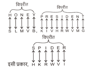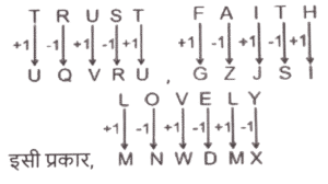 कोडिंग डिकोडिंग (भाग-VI)Total Questions: 5011. एक निश्चित कूट भाषा में 'CONTEXT' को 'DNOSFWU' लिखा जाता है और 'OUTLOOK' को 'PTUKPNL' लिखा जाता है। उसी भाषा में 'CLIMATE' कैसे लिखा जाएगा ? [Matriculation Level 20/06/2024 (Shift - 1)](a) DKKLCSF(b) EKJLCSE(c) EKJLCSG(d) DKJLBSFCorrect Answer: (d) DKJLBSFSolution:12. यदि ROW को 3 के रूप में और LAND को 4 के रूप में कूट बद्ध किया जाता है, तो FRIGHTENED को________ के रूप में कूट बद्ध किया जाएगा। [Matriculation Level 20/06/2024 (Shift - 1)](a) 25(b) 20(c) 10(d) 15Correct Answer: (c) 10Solution:तर्क :- शब्द में अक्षरों की संख्या ROW :- 3 अक्षर LAND :- 4 अक्षर इसी प्रकार, FRIGHTENED :- 10 अक्षर13. एक निश्चित कूट भाषा में, HONEY को SLMVB के रूप में और PRESIDENT को KIVHRWVMG के रूप में कूट बद्ध किया जाता है। SPIDER के लिए कूट क्या है ? [Matriculation Level 21/06/2024 (Shift - 4)](a) TQJEFS(b) URKFGT(c) HKRWVI(d) REDIPSCorrect Answer: (c) HKRWVISolution:14. यदि एक कूट भाषा में, 'EAR' को JFW के रूप में कूटबद्ध किया जाता है और 'CUP' को HZU के रूप में कूटबद्ध किया जाता है, तो 'LIGHT' को किस रूप में कूटबद्ध किया जाएगा ? [Matriculation Level 21/06/2024 (Shift - 4)](a) JGEFR(b) ORTSG(c) QNLMY(d) NKIJVCorrect Answer: (c) QNLMYSolution:15. एक निश्चित कूट भाषा में 'driving is fun' को 'xe ru vt' और 'too much fun' को 'ru py re' के रूप में लिखा जाता है। उसी भाषा में 'fun' के लिए क्या कूट है ? [Matriculation Level 21/06/2024 (Shift - 4)](a) vt(b) xe(c) py(d) ruCorrect Answer: (d) ruSolution:driving is fun → xe ru vt... (i) too much fun → ru py re........ (ii) (i) और (ii) से 'fun' और 'ru' उभय-निष्ठ हैं। 'fun' का कूट = 'ru'16. एक कूट भाषा में 'TRUST' को 'UQVRU' और 'FAITH' को 'GZJSI' लिखा जाता है। उसी भाषा में 'LOVELY' को किस प्रकार लिखा जाएगा ? [Matriculation Level 21/06/2024 (Shift - 4)](a) MNWDMX(b) MNWDMZ(c) KPUFKZ(d) MPUFKXCorrect Answer: (a) MNWDMXSolution:17. एक निश्चित कूट भाषा में 'STUD' को '8469' के रूप में कूटबद्ध किया जाता है और 'MUST' को '9764' के रूप में कूटबद्ध किया जाता है। उस भाषा में 'M' के लिए कूट क्या है ? [Matriculation Level 21/06/2024 (Shift - 4)](a) 6(b) 7(c) 8(d) 9Correct Answer: (d) 9Solution:STUD → 8 4 6 9....... (i) MUST → 9 7 6 4........ (ii) (i) और (ii) से 'U' 'S' और 'T' और '6', '9' और '4' उभयनिष्ठ हैं। केवल 'M' और '7' भिन्न हैं। 'M' का कोड = '7'18. एक निश्चित कूट भाषा में 'TRUST' को 'UTXWY' लिखा जाता है और 'GROUP' को 'HTRYU' लिखा जाता है। उस भाषा में 'VISIT' कैसे लिखा जाएगा ? [Matriculation Level 21/06/2024 (Shift - 4)](a) WLUNY(b) XKUNY(c) WKUNZ(d) WKVMYCorrect Answer: (b) XKUNYSolution:19. एक निश्चित कूट भाषा में 'served her people' को 'vt yc df' के रूप में कूटबद्ध किया जाता है और 'dinner is served' को 'kp df hu के रूप में कूटबद्ध किया जाता है। उस भाषा में 'served' को किस प्रकार कूटबद्ध किया जाएगा ? [Matriculation Level 24/06/2024 (Shift - 1)](a) kp(b) df(c) yc(d) vtCorrect Answer: (b) dfSolution:served her people → vt yc df...... (i) dinner is served → kp df hu....... (ii) (i) और (ii) से 'served' और 'df' उभयनिष्ठ हैं। 'served' का कोड = 'df'20. एक निश्चित कोड भाषा में 'RULE' को 'VXNF' लिखा जाता है और 'LEAD' को 'PHCE' लिखा जाता है। उसी भाषा में 'HERO' कैसे लिखा जाएगा ? [Matriculation Level 24/06/2024 (Shift - 1)](a) MITP(b) MHUP(c) LHTP(d) LHUQCorrect Answer: (c) LHTPSolution:Submit Quiz« Previous12345Next »
