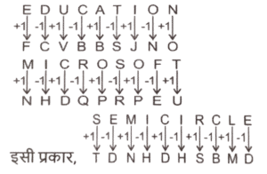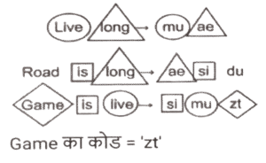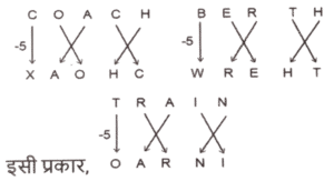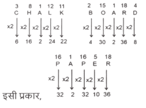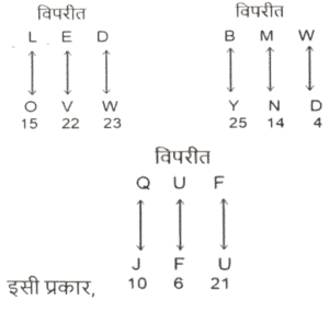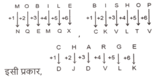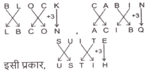 कोडिंग डिकोडिंग (भाग-VIII)Total Questions: 5011. एक निश्चित कूट भाषा में, "HORSE" को 75 और "MOVE" को 63 के रूप में कूटबद्ध किया गया है। उसी कूट भाषा में "RACE" को किस प्रकार कूटबद्ध किया जाएगा ? [SSC CPO 04/10/2023 (3rd Shift)](a) 35(b) 46(c) 48(d) 32Correct Answer: (a) 35Solution:तर्क : (अक्षरों के स्थानीय मान का योग) + 2 × (शब्द में अक्षरों की संख्या) HORSE :- (8 + 15 + 18 + 19 + 5) + 2 × (5) ⇒ 65 + 10 = 75 MOVE :- (13 + 15 + 22 + 5) + 2 × (4) ⇒ 55 + 8 = 63 इसी प्रकार, RACE :- (18 + 1 + 3 + 5) + 2 × (4) ⇒ 27 + 8 = 3512. एक निश्चित कूट भाषा में "COACH" को XAOHC के रूप में कूटबद्ध किया गया है, और "BERTH" को WREHT के रूप में कूटबद्ध किया गया है। उसी कूट भाषा में "TRAIN" को किस प्रकार कूटबद्ध किया जाएगा ? [SSC CPO 04/10/2023 (3rd Shift)](a) OARNI(b) PARIN(c) ONIAR(d) PARNICorrect Answer: (a) OARNISolution:13. एक निश्चित कूट भाषा में "EDUCATION" को "FCVBBSJNO" लिखा गया है, और "MICROSOFT" को "NHDQPRPEU" लिखा गया है। उसी कूट भाषा में "SEMICIRCLE को किस प्रकार लिखा जाएगा ? [SSC CPO 05/10/2023 (1st Shift)](a) TDNHHDSBFD(b) TDNHHDSBFM(c) TDHNDHSFBD(d) TDNHDHSBMDCorrect Answer: (d) TDNHDHSBMDSolution:14. एज निश्चित कूट भाषा में 'STORY' को '97' और 'PULL' को '61' के रूप में कूटबद्ध किया गया है। उसी कूट भाषा में 'INCOME' को किस प्रकार कूटबद्ध किया जाएगा ? [SSC CPO 05/10/2023 (1st Shift)](a) 54(b) 47(c) 59(d) 49Correct Answer: (c) 59Solution:तर्क : अक्षरों के स्थानीय मानों का योग = दी गई संख्या। STORY :- (19 + 20 +15 +18 + 25) = 97 PULL :- (16 + 21+12 +12) = 61 इसी प्रकार INCOME :- (9 +14 + 3 +15 +13 + 5) = 5915. एक निश्चित कूट भाषा में "CHALK" को 6 - 16 - 2 - 24 - 22 के रूप में कूटबद्ध किया गया है, और "BOARD" को 4 - 30 - 2 - 36 - 8 के रूप में कूटबद्ध किया गया है। उसी कूट भाषा में "PAPER" को किस प्रकार कूटबद्ध किया जाएगा ? [SSC CPO 05/10/2023 (2nd Shift)](a) 32 - 2 - 32 - 12 - 36(b) 36 - 2 - 36 - 10 - 32(c) 32 - 2 - 32 - 10 - 36(d) 36 - 2 - 36 - 12 - 32Correct Answer: (c) 32 - 2 - 32 - 10 - 36Solution:16. एक निश्चित कूट भाषा में "BLOCK" को LBCON के रूप में कूटबद्ध किया गया है, और "CABIN" को ACIBQ के रूप में कूटबद्ध किया गया है। उसी कूट भाषा में "SUITE" को किस प्रकार कूटबद्ध किया जाएगा ? [SSC CPO 05/10/2023 (3rd Shift)](a) USTIH(b) ETHUS(c) USHTI(d) UTSEHCorrect Answer: (a) USTIHSolution:17. एक निश्चित कूट भाषा में "MOBILE" को "NQEMQK" लिखा गया है, और "BISHOP" को "CKVLTV" लिखा गया है। उसी कूट भाषा में "CHARGE" को किस प्रकार लिखा जाएगा ? [SSC CPO 05/10/2023 (3rd Shift)](a) DJEVLJ(b) DJDVKL(c) DJDWLK(d) DJDVLKCorrect Answer: (d) DJDVLKSolution:18. एक निश्चित कूट भाषा में, "Live long" को "mu ae" के रूप में कूटबद्ध किया गया है, "Road is long" को "ae si du" के रूप में कूटबद्ध किया गया है, और "Game is live" को "si mu zt" के रूप में कूटबद्ध किया गया है। शब्द "Game" के लिए कूट क्या होगा ? [SSC CPO 05/10/2023 (3rd Shift)](a) mu(b) zt(c) ae(d) siCorrect Answer: (b) ztSolution:19. एक निश्चित कूट भाषा में, 'BLUE' को '1542' लिखा गया है और 'ABLE' को '1745' लिखा गया है। उसी कूट भाषा में 'A' को कैसे लिखा जाएगा ? [SSC MTS 01/09/2023 (1st Shift)](a) 7(b) 1(c) 4(d) 5Correct Answer: (a) 7Solution:'BLUE' → '1542' (I) 'ABLE'→'1745' .......(II) i और ii से B, L,E(1, 4, 5) उभयनिष्ठ हैं इसलिए 'A' का कोड '7' है।20. एक निश्चित कूट भाषा में, 'LED' को '15 - 22 - 23' लिखा गया है और 'BMW' को '25 - 14 - 4' लिखा गया है। उस कूट भाषा में 'QUF' को कैसे लिखा जाएगा ? [SSC MTS 01/09/2023 (3rd Shift)](a) 9 - 4 - 21(b) 10 - 6 - 21(c) 11 - 5 - 20(d) 9 - 5 - 20Correct Answer: (b) 10 - 6 - 21Solution:Submit Quiz« Previous12345Next »