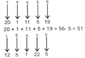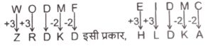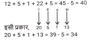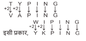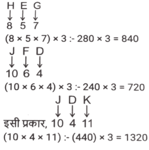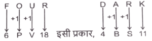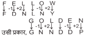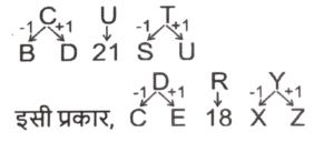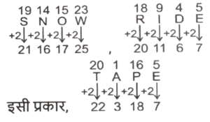 कोडिंग डिकोडिंग (भाग-X)Total Questions: 5021. एक निश्चित कूट भाषा में, 'CUT' को 'BD21SU' लिखा गया है। उस कूट भाषा में 'DRY' को कैसे लिखा जाएगा ? [SSC MTS 03/05/2023 (Evening)](a) C18EXZ(b) CE18XZ(c) CZ18EX(d) CE18ZXCorrect Answer: (b) CE18XZSolution:22. एक निश्चित कूट भाषा में, 'TAKES' को '51' लिखा गया है, 'LEAVE' को '40' लिखा गया है। उस कूट भाषा में 'TEAM' को कैसे लिखा जाएगा ? [SSC MTS 04/05/2023 (Afternoon)](a) 49(b) 34(c) 36(d) 39Correct Answer: (b) 34Solution:तर्क :- (अक्षरों के स्थानीय मान का योग) - 5 23. एक निश्चित कूट भाषा में, 'FOUR' को '6PV18' लिखा गया है। उस कूट भाषा में 'DARK' को कैसे लिखा जाएगा। [SSC MTS 04/05/2023 (Evening)](a) 4B1S1(b) 4SB11(c) 4BS11(d) 4BS12Correct Answer: (c) 4BS11Solution:24. एक निश्चित कूट भाषा में, 'PROFIT' को 'VIHOTP' लिखा गया है। उस कूट भाषा में 'RACING' को कैसे लिखा जाएगा ? [SSC MTS 04/05/2023 (Evening)](a) INKCCR(b) INKCRC(c) INKRCC(d) ILNCCRCorrect Answer: (a) INKCCRSolution:25. एक निश्चित कूट भाषा में, 'WODMF' को 'ZRDKD' लिखा गया है। उस भाषा में 'EIDMC' को कैसे लिखा जाएगा ? [SSC MTS 08/05/2023 (Morning)](a) HLDKA(b) HDLKA(c) HALDA(d) HDLAKCorrect Answer: (a) HLDKASolution:26. एक निश्चित कूट भाषा में, 'HEG' को '840' लिखा गया है, 'JFD' को '720' लिखा गया है। उस कूट भाषा में 'JDK' को कैसे लिखा जाएगा ? [SSC MTS 08/05/2023 (Afternoon)](a) 1380(b) 1320(c) 1280(d) 1400Correct Answer: (b) 1320Solution:तर्क :- (अक्षरों के स्थानीय मान का गुणनफल) × 3 27. एक निश्चित कूट भाषा में, 'SNOW' को '21, 16, 17, 25' लिखा गया है, 'RIDE' को '20, 11, 6, 7' लिखा गया है। उस कूट भाषा में 'TAPE' को कैसे लिखा जाएगा ? [SSC MTS 08/05/2023 (Afternoon)](a) 22, 3, 17, 7(b) 22, 3, 18, 6(c) 20, 3, 18, 7(d) 22, 3, 18, 7Correct Answer: (d) 22, 3, 18, 7Solution:28. एक निश्चित कूट भाषा में, 'FELLOW' को 'FDNLNY' लिखा गया है। उस कूट भाषा में 'GOLDEN' को कैसे लिखा जाएगा ? [SSC MTS 09/05/2023 (Morning)](a) GNNEDQ(b) DNNDDQ(c) GNNDDP(d) GNMDEPCorrect Answer: (c) GNNDDPSolution:29. एक निश्चित कूट भाषा में, 'DEEPAK' को '3' लिखा गया है और 'MEME' को '2' लिखा गया है। उस भाषा में 'PLAIN' को कैसे लिखा जाएगा ? [SSC MTS 09/05/2023 (Evening)](a) 11(b) 2(c) 5(d) 4Correct Answer: (b) 2Solution:तर्क :- शब्द में स्वरों की संख्या DEEPAK :- तीन स्वर, MEME :- दो स्वर इसी प्रकार, PLAIN :- दो स्वर30. एक निश्चित कूट भाषा में, 'TYPING' को 'VAPING' लिखा गया है। उस भाषा में 'WIPING' को कैसे लिखा जाएगा ? [SSC MTS 10/05/2023 (Morning)](a) YKPING(b) VKPJNG(c) VIPING(d) VKPGNGCorrect Answer: (a) YKPINGSolution:तर्क :- पहले दो अक्षरों में (+2) को वर्णमाला के अनुसार स्थानीय मान में जोड़ें और बाकी अक्षरों को उसी स्थिति में लिखें Submit Quiz« Previous12345Next »