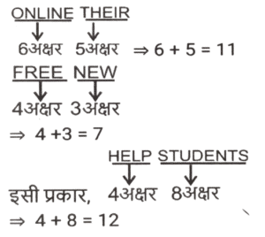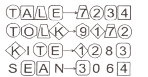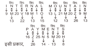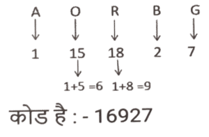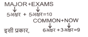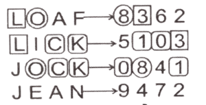 कोडिंग डिकोडिंग (भाग-XI)Total Questions: 5031. किसी एक खास कूट भाषा में, 'WOULD + ALL' को '8' लिखा गया है, 'MAJOR + EXAMS' को '10' लिखा गया है। इस कूट भाषा में 'COMMON + NOW को क्या लिखा जाएगा ? [SSC CHSL 16/03/2023 (2nd Shift)](a) 2(b) 5(c) 9(d) 6Correct Answer: (c) 9Solution:32. किसी एक खास कूट भाषा में, 'BACK' को '2325215' लिखा गया है, 'CAME' को '2125117' लिखा गया है। उस कूट भाषा में 'GBJH' को क्या लिखा जाएगा ? [SSC CHSL 16/03/2023 (3rd Shift)](a) 1332711(b) 1323711(c) 1323771(d) 1323111Correct Answer: (b) 1323711Solution:कोड इस रूप में लिखा गया है: उपरोक्त कोडिंग के अनुसार- BACK को 2325215 के रूप में कोडित किया गया है CAME को 2125117 के रूप में कोडित किया गया है इसी प्रकार, GBJH को 1323711 लिखा जाएगा।33. एक खास कूट भाषा में, 'AWAKED' को 'FPFDJW' लिखा गया है। इस कूट भाषा में 'FACEUP' को कैसे लिखा जाएगा ? [SSC CHSL 17`/03/2023 (2nd Shift)](a) KTHYZI(b) KTHXZI(c) KTHZXI(d) TKHXZICorrect Answer: (b) KTHXZISolution:34. एक खास कूट भाषा में, 'TALE' को '7234' लिखा गया है, TOLK' को '9172' लिखा गया है, 'KITE' को '1283' लिखा गया है, 'SEAN को 3064' लिखा गया है। इस कूट भाषा में 'SON' को कैसे लिखा जाएगा ? [SSC CHSL 17/03/2023 (3rd Shift)](a) 906(b) 916(c) 896(d) 914Correct Answer: (a) 906Solution:दूसरी लाइन से हमें ' 0' = 9 का कोड मिलता है अंतिम पंक्ति से हमें S और N = 0/6 का कोड मिलता है विकल्प के माध्यम से जाने पर, केवल विकल्प (a) शर्त को संतुष्ट करता है। SON का कोड = 90635. एक खास कूट भाषा में, "LANDS' को '10' और 'TRAM' को '13' लिखा गया है। उस कूट भाषा में 'TASTE' को कैसे लिखा जाएगा ? [SSC CHSL 20/03/2023 (1st Shift)](a) 17(b) 12(c) 13(d) 15Correct Answer: (c) 13Solution:तर्क : - (अक्षर की स्थानीय मान का योग) ÷ (अक्षर की संख्या) ⇒ LANDS → 12 + 1 + 14 + 4 + 19 = 50 ⇒ 50 ÷ 5 = 10 ⇒ TRAM → 20 + 18 + 1 + 13 = 52 ⇒ 65 ÷ 5 = 13 इसी प्रकार, ⇒ TASTE → 20 + 1 + 19 + 20 + 5 = 65 ⇒ 52 ÷ 4 = 1336. एक खास कूट भाषा में, 'LOAF' को '8362' लिखा गया है, 'LICK' को '5103' लिखा गया है, 'JOCK' को '0841' लिखा गया है, 'JEAN' को '9472' लिखा गया है। इस कूट भाषा में 'LOC' को कैसे लिखा जाएगा ? [SSC CHSL 20/03/2023 (2nd Shift)](a) 385(b) 341(c) 381(d) 480Correct Answer: (c) 381Solution:ऊपर चित्र से हम देख सकते हैं L = 3 O = 8 C या K = 1 या 0 क्रमशः या 0,1 जाने पर, हम पाते हैं कि विकल्पों पर विचार किये कोड LOC = 381 होगा37. एक खास कूट भाषा में, 'DESIRE' को 'GSKTGE' लिखा गया है। इस कूट भाषा में 'DIRECT को कैसे लिखा जाएगा ? [SSC CHSL 20/03/2023 (2nd Shift)](a) VGDSKE(b) VDKKSE(c) VDGKSE(d) VDGSKECorrect Answer: (d) VDGSKESolution:38. यदि एक कूट प्रणाली में EDEKA को 54521 लिखा गया है, तो उसी कूट प्रणाली में AORBG को कैसे लिखा जाएगा ? [SSC CHSL 20/03/2023 (4th Shift)](a) 16927(b) 19672(c) 16279(d) 17269Correct Answer: (a) 16927Solution: 39. किसी एक खास कूट भाषा में, INTERNAL' को '91320221813115' लिखा गया है, 'MOUNTAIN' को '131221132026913' लिखा गया है। इस कूट भाषा में 'PAYMENTS' को कैसे लिखा जाएगा ? [SSC CHSL 21/03/2023 (2nd Shift)](a) 16262514413208(b) 16262514513280(c) 16262514513208(d) 16252614513208Correct Answer: (c) 16262514513208Solution:40. किसी एक खास कूट भाषा में, 'ONLINE + THEIR' को '11' लिखा गया है, 'FREE + NEW' को '7' लिखा गया है। इस कूट भाषा में 'HELP + STUDENTS' को क्या लिखा जाएगा ? [SSC CHSL 21/03/2023 (3rd Shift)](a) 10(b) 12(c) 8(d) 6Correct Answer: (b) 12Solution:तर्क :- अक्षरों की संख्या का योग Submit Quiz« Previous12345Next »