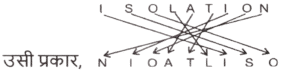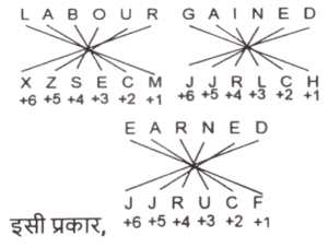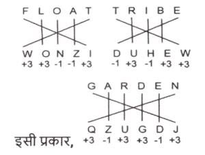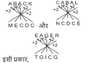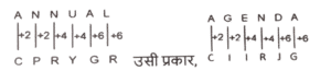 कोडिंग डिकोडिंग (भाग-XII)Total Questions: 5021. एक निश्चित कूट भाषा में, 'FLOAT' को 'WONZI' के रूप में लिखा गया है और 'TRIBE' को 'DUHEW' के रूप में लिखा गया है। उसी भाषा में 'GARDEN' को कैसे लिखा जाएगा ? [SSC CGL 09/12/2022 (4th Shift)](a) QZQGDJ(b) QZUHDJ(c) QZUGDJ(d) QDUGHJCorrect Answer: (c) QZUGDJSolution:22. एक निश्चित कूट भाषा में, 'LABOUR' को 'XZSECM' लिखा गया है और 'GAINED' को 'JJRLCH' लिखा गया है। उसी भाषा में 'EARNED' को कैसे लिखा जाएगा ? [SSC CGL 12/12/2022 (1st Shift)](a) JJRUCF(b) KJRVCF(c) FCVRJJ(d) JIRVCFCorrect Answer: (a) JJRUCFSolution:23. एक निश्चित कूट भाषा में, 'ABACK' को 'MECDC' के रूप में लिखा गया है और 'CABAL' को 'NCDCE' के रूप में लिखा गया है। उसी भाषा में 'EAGER' को कैसे लिखा जाएगा ? [SSC CGL 12/12/2022 (2nd Shift)](a) TGICG(b) TGCIG(c) TCIDG(d) TFICGCorrect Answer: (a) TGICGSolution:24. एक निश्चित कूट भाषा में, 'HAIRCAP' को IAHRPAC' और 'LEADMAN' को 'AELDNAM' लिखा गया है। उसी भाषा में 'FACTFUL कैसे लिखा जाएगा ? [SSC CGL 12/12/2022 (4th Shift)](a) CAFTLUF(b) CAFTLFU(c) CATFLUF(d) CAFTULFCorrect Answer: (a) CAFTLUFSolution:25. एक निश्चित कूट भाषा में, 'COMMUNITY' को 'YITUNMCOM' लिखा गया है और 'AUTHORITY' को 'YITORHAUT' लिखा गया है। उसी भाषा में ISOLATION' कैसे लिखा जाएगा ? [SSC CGL 13/12/2022 (1st Shift)](a) NIAOTLISO(b) NIOATILSO(c) NIOATLIOS(d) NIOATLISOCorrect Answer: (d) NIOATLISOSolution:26. एक निश्चित कूट भाषा में 'BOTTLE' को '148' के रूप में लिखा गया है, 'SIPPER' को '166' के रूप में लिखा गया है। उसी भाषा में 'BUMPER' को किस प्रकार लिखा जाएगा ? [SSC CGL 13/12/2022 (1st Shift)](a) 160(b) 170(c) 150(d) 180Correct Answer: (c) 150Solution:तर्कः (अक्षरों के स्थानीय मान का योग) × 2 BOTTLE में ⇒ (2 + 15 + 20 + 20 + 12 + 5) × 2 = 148 SIPPER में ⇒ (19 + 9 +16 +16 + 5 +18) × 2 = 166 उसी प्रकार, BUMPER में ⇒ (2 + 21 + 13 + 16 + 5 +18) × 2 = 15027. एक निश्चित कूट भाषा में, 'ANNUAL' को 'CPRYGR' और 'AMOUNT को 'COSYTZ' लिखा गया है। उसी भाषा में 'AGENDA' को कैसे लिखा जाएगा ? [SSC CGL 13/12/2022 (2nd Shift)](a) CIIRHE(b) CIIRJG(c) CIKTJG(d) CIGPFCCorrect Answer: (b) CIIRJGSolution:28. एक निश्चित कूट भाषा में 'ANYWAY' को 'YNAYAW' लिखा गया है और 'BATTLE' को 'TABELT' लिखा गया है। उस भाषा में 'COSTLY' को कैसे लिखा जाएगा ? [SSC CPO 09/11/2022 (Morning)](a) SOCYLT(b) SCTOLY(c) OCTSLY(d) YLTSOCCorrect Answer: (a) SOCYLTSolution:29. एक निश्चित कूट भाषा में, 'food is fresh' को 'dy in pq' के रूप में कूटबद्ध किया गया है, 'bring fresh food' को 'tq pq dy' के रूप में कूटबद्ध किया गया है, और 'food is not को 'dy in to' के रूप में कूटबद्ध किया गया है। शब्द 'fresh' के लिए किस कूट का उपयोग किया गया है ? [SSC CPO 09/11/2022 (Evening)](a) In(b) to(c) pq(d) dyCorrect Answer: (c) pqSolution:उपरोक्त आकृति से, हम स्पष्ट रूप से देख सकते हैं कि, pq शब्द 'fresh' के लिए कूट है। 30. एक निश्चित कूट भाषा में, GOA को 7151 के रूप में लिखा गया है और DOG को 4157 के रूप में लिखा गया है। उसी भाषा में, MAN को किस प्रकार लिखा जाएगा ? [SSC CPO 10/11/2022 (Morning)](a) 13114(b) 31114(c) 12113(d) 11113Correct Answer: (a) 13114Solution:प्रयुक्त तर्क :- प्रत्येक शब्द की वर्णानुक्रमिक स्थिति 'GOA' ⇒ 7151 और 'DOG' ⇒ 4157 इसी तरह 'ΜΑΝ' ⇒ 13114Submit Quiz« Previous12345Next »