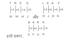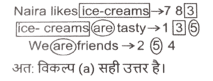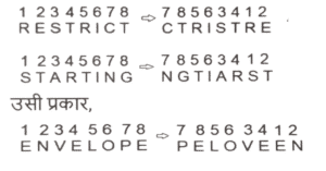 कोडिंग डिकोडिंग (भाग-XIII)Total Questions: 451. एक कूट भाषा में, 'PALM' को 16 - 1 - 12 - 13 के रूप में कूटबद्ध किया गया है और 'HEAD' को 8 - 5 - 1 - 4 के रूप में कूटबद्ध किया गया है। उसी भाषा में 'NECK' को किस प्रकार कूटबद्ध किया जाएगा ? [Higher Secondary 04/08/2022 (Shift - 3)](a) 13 - 5 - 3 - 11(b) 14 - 5 - 3 - 10(c) 14 - 5 - 3 - 11(d) 13 - 5 - 3 - 10Correct Answer: (c) 14 - 5 - 3 - 11Solution:तर्क : अक्षरों को उनके स्थानीय मान पर कूटबद्ध किया गया है। PALM 16 - 1 - 12 - 13 HEAD 8 - 5 - 1 - 4 उसी प्रकार, NECK 14 - 5 - 3 - 112. एक निश्चित कूट भाषा में, 'TREE' को WWHJ के रूप में लिखा गया है, और 'LEAF' को OJDK के रूप में लिखा गया है। उसी भाषा में, 'BARK' को कैसे लिखा जाएगा ? [Higher Secondary 04/08/2022 (Shift - 3)](a) GFUN(b) EFTP(c) EFUP(d) GDWNCorrect Answer: (c) EFUPSolution:3. एक निश्चित कोड भाषा में, 'RESTRICT' को 'CTRISTRE', 'STARTING' को'NGTIARST' और 'MOUNTAIN' को 'INTAUNMO' लिखा गया है। उस कोड भाषा में 'ENVELOPE' शब्द के लिए कोड क्या है ? [SSC MTS 05/07/2022 (Morning)](a) ELOOEENP(b) PELOVEEN(c) PEELOVEN(d) EPOLEVNECorrect Answer: (b) PELOVEENSolution:4. एक निश्चित कूट भाषा में, '476' को 'wrong and sharp' के रूप में लिखा गया है, '428' को 'knife is sharp' के रूप में लिखा गया है, और '859' को 'right is good' के रूप में लिखा गया है। उस भाषा में 'knife' शब्द के लिए कौन सा कूट होगा ? [SSC MTS 05/07/2022 (Afternoon)](a) 4(b) 2(c) 5(d) 8Correct Answer: (b) 2Solution:'knife is sharp' और 'right is good' से, हमें 'is' = '8' मिलता है। 'wrong and sharp' और 'knife is sharp' से, हमें 'sharp' = '4' प्राप्त होता है। प्राप्त कूटों को 'knife is sharp' में रखने पर हमें 'knife' = '2' प्राप्त होता है। अतः विकल्प (b) सही उत्तर है।5. एक निश्चित कूट भाषा में, यदि 'पीले' को 'नीला' लिखा गया है, 'नीले' को 'लाल' लिखा गया है, 'लाल' को 'हरा' लिखा गया है, 'हरे' को 'सफ़ेद' लिखा गया हैऔर 'सफ़ेद' को 'नारंगी' लिखा गया है, तो उसी कूट भाषा में मनुष्य के रक्त का रंग क्या होगा ? [SSC MTS 05/07/2022 (Evening)](a) नारंगी(b) सफेद(c) लाल(d) हराCorrect Answer: (d) हराSolution:आमतौर पर मानव रक्त का रंग लाल होता है और यहाँ लाल को हरा कहा गया है। इसलिए, विकल्प (d) सही उत्तर है।6. कुछ कोड भाषा में, 'CYLINDER' को 'CYLJNDFR' लिखा गया है, 'CERTAIN' को 'CFRTBJN' लिखा गया है, और 'PURPOSE' को 'PVRPPSF' लिखा गया है। उन भाषाओं में QUEUEING' कैसे लिखा जाएगा ? [SSC MTS 06/07/2022 (Morning)](a) QFVFVJNG(b) QVFVEJNG(c) RVEVEJNG(d) QVFVFJNGCorrect Answer: (d) QVFVFJNGSolution:पैटर्न का अध्ययन करने पर, केवल Vowels में 1 की वृद्धि हो रही है, अतः 7. एक निश्चित कूट भाषा में, '587' को 'see good pictures' के रूप में लिखा गया है, '539' को good and beautiful' के रूप में लिखा गया है, और '967' को 'pictures are beautiful' के रूप में लिखा गया है। उस भाषा में 'see' शब्द के लिए कौन सा कूट होगा ? [SSC MTS 06/07/2022 (Morning)](a) 8(b) 7(c) 6(d) 5Correct Answer: (a) 8Solution:'see good pictures' और 'good and beautiful' से, हमें 'good' = '5' मिलता है 'see good pictures' और 'pictures are beautiful' से हमें 'pictures' = '7' प्राप्त होता है। प्राप्त कूटों को 'see good pictures' में रखने पर हमें 'see' = '8' प्राप्त होता है।8. एक निश्चित कूट भाषा में, '7 8 3' का अर्थ 'Naira likes ice-creams' है, '1 3 5' का अर्थ 'ice-creams are tasty' है, '25 4' का अर्थ 'we are friends' है, तो उसी कूट भाषा में 'tasty' का कूट क्या होगा ? [SSC MTS 06/07/2022 (Afternoon)](a) 1(b) 3(c) 2(d) 5Correct Answer: (a) 1Solution:9. एक निश्चित कूट भाषा में, यदि किसी पोशाक को कंघी कहा गया है, कंघी को हेअर ड्रायर कहा गया है, हेअर ड्रायर को लिपस्टिक कहा गया है, लिपस्टिक को सैंडल कहा गय