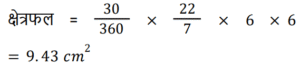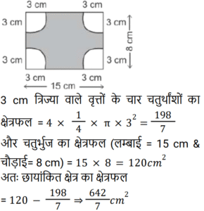 क्षेत्रमितिTotal Questions: 5011. छायांकित क्षेत्र का क्षेत्रफल ज्ञात कीजिए ? [NTPC CBT - I 10/01/2021 (Morning)](a) 588/7 cm² (b) 12/7 cm²(c) 78/7 cm² (d) 642/7 cm²Correct Answer: (d) 642/7 cm²Solution:12. एक आयत की लम्बाई उसकी चौड़ाई से 3m अधिक है और परिमाप संख्यामक रूप से उसके क्षेत्रफल के बराबर है। इसके विपरीत के मान का समाकलन भाग कितना होगा ? [NTPC CBT - I 13/01/2021 (Morning)](a) 6 (b) 8 (c) 7 (d) 9Correct Answer: (a) 6 Solution:13. एक कमरे के लिए, यदि लम्बाई और चौड़ाई L = (3x + 10) m और B = (2x + 5) m द्वारा दी गई है और इसकी 4 दीवारों का क्षेत्रफल (60x + 180) दिया है, तो कमरे की ऊँचाई क्या है? [NTPC CBT - I 19/01/2021 (Morning)](a) 9 m (b) 5 m (c) 8 m (d) 6 mCorrect Answer: (d) 6 mSolution:14. यदि त्रिज्या r = 36 cm के एक वृत्त में चाप लम्बाई l = एक त्रिज्यांश, 4l = 3r के संज्ञु करता है, तो त्रिज्यखंड का क्षेत्रफल कितना है? [NTPC CBT - I 21/01/2021 (Evening)](a) 496 cm² (b) 486 cm²(c) 476 cm² (d) 461 cm²Correct Answer: (b) 486 cm²Solution:15. एक आयताकार आंगन 18m × 72cm लंबा और 13m × 20cm चौड़ा है। इसे सभी समान आकार की चौके टाइल्स से पक्का किया जाता है। ऐसी टाइल्स की न्यूनतम आवश्क संख्या ज्ञात कीजिए। [NTPC CBT - I 28/01/2021 (Morning)](a) 4290 (b) 4295 (c) 4292 (d) 4294Correct Answer: (a) 4290 Solution:16. चार गायों को 28 मीटर लंबे एक वर्गाकार खेत के चारों कोनों से बांध दिया है ताकि प्रत्येक गाय बागल के कोनों में दो गायों को छू सके। यदि वर्गाकार खेत के अंदर के क्षेत्र में गायों के लिए उपलब्ध घास 22 दिनों के लिए पर्याप्त थी, तो इन गायों की पहुंच से बाहर की घास कितने दिनों तक उन्हें खिलाई जा सकेगी और इस घास को काटने के और चरने योग भाग को अंदर छोड़ देती है? (π = 22/7 का प्रयोग करें) [NTPC CBT - I 02/02/2021 (Morning)](a) 6 (b) 5 (c) 4 (d) 7Correct Answer: (a) 6 Solution:17. एक वृत्त की न्यूनतम त्रिज्या (>1) क्या है जिसकी परिधि पूर्णांक है। [NTPC CBT - I 10/02/2021 (Morning)](a) 3/π (b) 6/π (c) 4/π(d) 2Correct Answer: (c) 4/πSolution:18. 90 मीटर × 40 मीटर के एक स्विमिंग पूल में 150 आदती डुबकी लगाते हैं। यदि एक व्यक्ति द्वारा पानी का औसत विस्थापन 8 क्यूबिक मीटर है, तो पूल के जल स्तर में क्या वृद्धि होगी? [NTPC CBT - I 10/02/2021 (Evening)](a) 33.33cm (b) 30cm(c) 25cm (d) 20cmCorrect Answer: (a) 33.33cm Solution:19. एक वर्गाकार क्षेत्र में बाड़ लगाने के लिए मशीनी 48 खंभे गढ़ाता है। यदि 2 खंभों के बीच की दूरी 5m है, तो इस प्रकार निर्मित वर्ग का क्षेत्रफल ज्ञात कीजिए। [NTPC CBT - I 11/02/2021 (Morning)](a) 3200 m² (b) 3600 m²(c) 3500 m² (d) 4000 m²Correct Answer: (b) 3600 m²Solution:20. 5 मिनट के अंतराल में, दीवार घड़ी की 6 cm लंबी मिनट की सूई की स्थिति से संबंधित होने वाले क्षेत्र का क्षेत्रफल कितना है? [NTPC CBT - I 23/02/2021 (Morning)](a) 9.8 cm² (b) 9.63 cm²(c) 9.6 cm² (d) 9.43 cm²Correct Answer: (d) 9.43 cm²Solution:Submit Quiz« Previous12345Next »