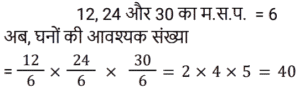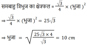 क्षेत्रमितिTotal Questions: 5041. एक चतुर्भुज का विकर्ण 32 मीटर लंबा है, और इसके दो अंतरलंब (offsets) 6 मीटर और 10 मीटर हैं। तो चतुर्भुज का क्षेत्रफल क्या होगा? [Group D 22/08/2022 (Morning)](a) 256 m² (b) 220 m²(c) 276 m² (d) 250 m²Correct Answer: (a) 256 m² Solution:42. एक त्रिभुज की भुजाओं की लंबाई 5 cm, 7 cm और 10 cm है। त्रिभुज का क्षेत्रफल (cm² में) ज्ञात कीजिए। [Group D 22/08/2022 (Morning)](a) 350 (b) 2√66(c) 25 (d) 7√10Correct Answer: (b) 2√66Solution:43. एक समकोण त्रिभुज में, यदि कर्ण एक भुजा से 4 इंच बढ़ा है, तो दूसरी भुजा 8 इंच बढ़ा है, तो त्रिभुज का क्षेत्रफल ज्ञात कीजिए। [Group D 22/08/2022 (Afternoon)](a) 100 वर्ग इंच (b) 32 वर्ग इंच (c) 96 वर्ग इंच(d) 16 वर्ग इंचCorrect Answer: (c) 96 वर्ग इंचSolution:44. एक गोलो की त्रिज्या में 2 cm की वृद्धि करने पर, उसके पुष्टि क्षेत्रफल में 704 cm² की वृद्धि होती है। (π = 22/7) का उपयोग करते हुए) वृद्धि से पहले गोलो की त्रिज्या ज्ञात कीजिए। [Group D 22/08/2022 (Evening)](a) 16 cm (b) 14 cm(c) 15 cm (d) 13 cmCorrect Answer: (d) 13 cmSolution:45. एक घनाभाकार ब्लॉक, 12 सेमी × 24 सेमी × 30 सेमी, को समान घनों की संख्या में काटा जाता है। ऐसे घनों की न्यूनतम संख्या ज्ञात कीजिए। [Group D 22/08/2022 (Evening)](a) 45 (b) 50(c) 55 (d) 60Correct Answer: (b) 50Solution:46. एक समचतुर्भुज का क्षेत्रफल ज्ञात कीजिए जिसके विकर्ण की लंबाइयाँ 12 cm और 15 cm हैं। [Group D 23/08/2022 (Morning)](a) 45 cm² (b) 60 cm² (c) 90 cm²(d) 80 cm²Correct Answer: (c) 90 cm²Solution:47. यदि एक समभुज त्रिभुज का क्षेत्रफल 25√3 cm² है, तो त्रिभुज की प्रत्येक भुजा की लंबाई ________ होगी। [Group D 23/08/2022 (Afternoon)](a) 12 cm (b) 5 cm(c) 8 cm (d) 10 cmCorrect Answer: (d) 10 cmSolution:48. यदि एक गोले का पुष्टि क्षेत्रफल 36πcm² है, तो गोले की त्रिज्या ________ है। [Group D 23/08/2022 (Afternoon)](a) 3 cm (b) 4 cm(c) 5 cm (d) 2 cmCorrect Answer: (a) 3 cm Solution:49. उस समभुज त्रिभुज की भुजा की लंबाई ज्ञात कीजिए, जिसका क्षेत्रफल 4√3 वर्ग इंच है। [Group D 23/08/2022 (Evening)](a) 2 इंच (b) √3 इंच(c) 16 इंच (d) 4 इंचCorrect Answer: (d) 4 इंचSolution:50. किसी घनाभाकार कमरे की लंबाई 15m चौड़ाई 17m और ऊँचाई 21m है। ₹40/m² की दर से इसकी दीवारों और छत को पेंट करने की लागत ज्ञात कीजिए। [Group D 23/08/2022 (Evening)](a) ₹44,250 (b) ₹63,960(c) ₹58,912 (d) ₹285,126Correct Answer: (b) ₹63,960Solution:Submit Quiz« Previous12345