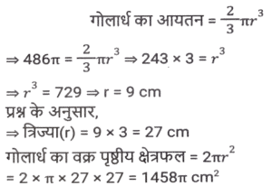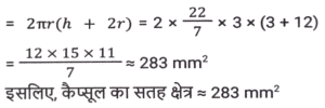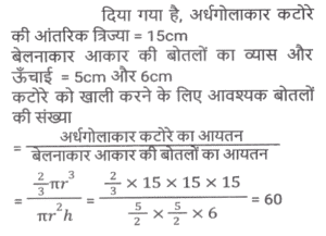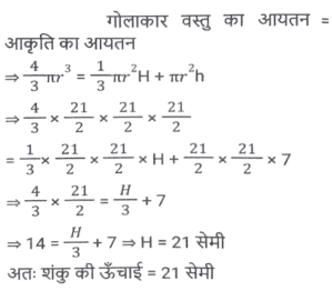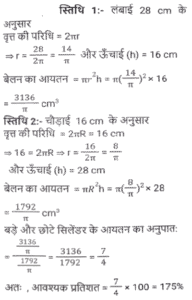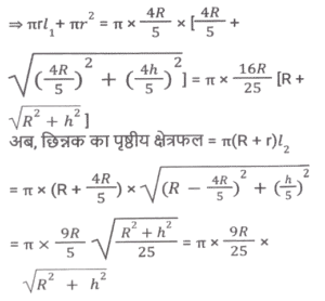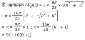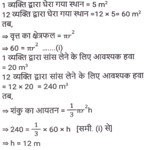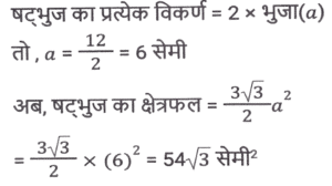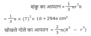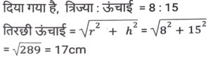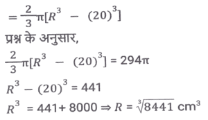क्षेत्रमिति (Part-III)Total Questions: 5011. एक अर्धगोले का आयतन 486π cm³ है। यदि त्रिज्या को तीन गुना कर दिया जाए, तो इसका वक्र पृष्ठीय क्षेत्रफल (cm² में) कितना होगा ? [SSC MTS 07/10/2024 (Afternoon)](a) 1458(b) 1025π(c) 1458π(d) 1546Correct Answer: (c) 1458πSolution:12. 15 cm आंतरिक त्रिज्या वाले एक अर्धगोलाकार कटोरे में एक तरल पदार्थ भरा है। तरल पदार्थ को 5 cm व्यास और 6 cm ऊँचाई वाली बेलनाकार बोतलों में भरा जाना है। कटोरे को खाली करने के लिए आवश्यक बोतलों की संख्या कितनी है ? [SSC MTS 08/10/2024 (Morning)](a) 40(b) 30(c) 60(d) 50Correct Answer: (c) 60Solution:13. 7 cm आधार त्रिज्या और 18 cm ऊँचाई वाले एक ठोस शंकु को पिघलाया जाता है और क्रमशः 20 cm और R cm आंतरिक और बाहरी त्रिज्या के खोखले धातु के अर्धगोले में पुनः ढाला जाता है। R का मान (cm में) कितना है? [SSC MTS 08/10/2024 (Afternoon)](a)(b)(c)(d)Correct Answer: (b)Solution:14. एक ठोस गोलाकार वस्तु को बेलन के आकार में पिघलाया जाता है। जिस पर समान त्रिज्या वाला शंकु लगाया जाता है, बेलन और गोले, प्रत्येक का व्यास 21 cm है। यदि बेलन की ऊंचाई 7 cm है तो शंकु की ऊंचाई (cm में) क्या है? π = 22 लीजिए। [SSC MTS 08/10/2024 (Evening)](a) 21(b) 10.5(c) 14(d) 7Correct Answer: (a) 21Solution:15. ABCDEF एक सम षट्भुज है, और m (AD )=12 cm है। दिए गए षट्भुज का क्षेत्रफल (cm²में) क्या है ? [SSC MTS 09/10/2024 (Morning)](a) 216√3(b) 54√3(c) 108√3(d) 162√3Correct Answer: (b) 54√3Solution:16. ऊँचाई h और त्रिज्या R का एक लंब वृत्तीय शंकु आधार के समानांतर एक समतल द्वारा आधार से h/5 की दूरी पर काटा जाता है। छिन्नक के वक्र पृष्ठीय क्षेत्रफल और परिणामी शंकु के कुल पृष्ठीय क्षेत्रफल का अनुपात क्या है ? [SSC MTS 09/10/2024 (Afternoon)](a) 16 (R+L) : 9L(b) 9 (R+L) : 16L(c) 16L : 9 (R+L)(d) 9L : 16 (R+L)Correct Answer: (d) 9L : 16 (R+L)Solution:17. एक लंब वृत्तीय शंकु के आधार की त्रिज्या और ऊँचाई का अनुपात 8: 15 है। यदि शंकु का आयतन (1005)5/7 cm³ हो, तो शंकु की तिर्यक ऊँचाई ज्ञात कीजिए। [SSC MTS 09/10/2024 (Afternoon)](a) 12 cm(b) 17 cm(c) 21 cm(d) 15 cmCorrect Answer: (b) 17 cmSolution:18. 28 cm लंबाई और 16 cm चौड़ाई की एक आयताकार शीट के किनारों को मिलाने के लिए इस प्रकार मोड़ा जाता है कि यह दो संभावित तरीकों कों एक लंबाई के अनुदिश और दूसरा चौड़ाई के अनुदिश - से एक बेलनाकार पाइप बन जाए । बड़ा आयतन, छोटे आयतन का कितने प्रतिशत है ? [SSC MTS 09/10/2024 (Evening)](a) 165%(b) 180%(c) 185%(d) 175%Correct Answer: (d) 175%Solution:19. एक शंक्वाकार तम्बू में 12 व्यक्ति बैठ सकते हैं। प्रत्येक व्यक्ति के पास जमीन पर 5 m² का स्थान और सांस लेने के लिए 20 m³ हवा होनी चाहिए। तम्बू की ऊंचाई कितनी होनी चाहिए ? [SSC MTS 09/10/2024 (Evening)](a) 12m(b) 13m(c) 12.5m(d) 22 mCorrect Answer: (a) 12mSolution:20. दवा का एक कैप्सूल बेलन के आकार का है, जिसके प्रत्येक सिरे पर दो अर्धगोले जुड़े हुए हैं। इस पूरे कैप्सूल की लंबाई 15 mm और इसका व्यास 6 mm है। इस कैप्सूल के पृष्ठीय क्षेत्रफल (mm² में, निकटतम पूर्णांक तक) की गणना कीजिए। (π = 22/7 का उपयोग कीजिए) [ SSC MTS 14/10/2024 (Afternoon)](a) 286(b) 283(c) 289(d) 280Correct Answer: (b) 283Solution:Submit Quiz« Previous12345Next »