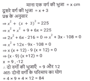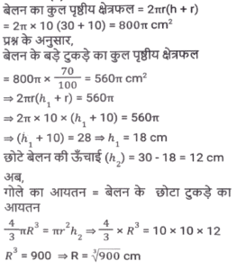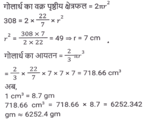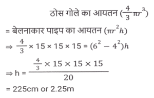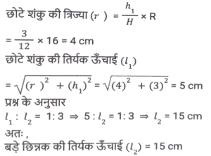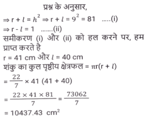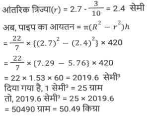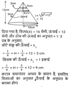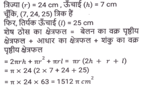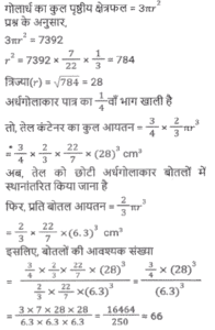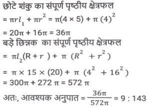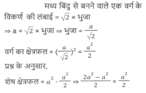 क्षेत्रमिति (Part-III)Total Questions: 5021. 7392 cm² संपूर्ण पृष्ठीय क्षेत्रफल वाले एक अर्धगोलाकार पात्र को तेल से भरा जाता है। हालांकि, पात्र का 1/4 भाग खाली है। इस तेल को 6.3 cm त्रिज्या वाली छोटी अर्धगोलाकार बोतलों में स्थानांतरित करना है। कितनी बोतलों की आवश्यकता होगी (निकटतम पूर्णांक तक पूर्णांकित) ? (मान लीजिए, π =22/7) [SSC MTS 14/10/2024 (Evening)](a) 351(b) 66(c) 75(d) 156Correct Answer: (b) 66Solution:22. 16 cm त्रिज्या और 12 cm ऊंचाई वाले एक शंकु को, आधार के समानांतर, शीर्ष के निकट किसी ऊंचाई पर काटा जाता है। यदि ठोसों की ऊंचाई का अनुपात 1 : 3 है, तो निर्मित दोनों ठोसों के संपूर्ण पृष्ठीय क्षेत्रफल का अनुपात लगभग ______________ होगा। [SSC MTS 17/10/2024 (Morning)](a) 9 : 143(b) 1 : 8(c) 2 :15(d) 7 : 180Correct Answer: (a) 9 : 143Solution:23. 7 cm ऊंचाई और 48 cm आधार व्यास वाले ठोस वृत्तीय बेलन में एक शंक्वाकार गुहा (conical cavity) ड्रिल की जाती है। शंकु की ऊंचाई और आधार व्यास, बेलन की ऊंचाई और आधार व्यास के बराबर है। शेष ठोस का संपूर्ण पृष्ठीय क्षेत्रफल कितना होगा ? [SSC MTS 17/10/2024 (Afternoon)](a) 1512π cm²(b) 1076π cm²(c) 1420π cm²(d) 1654π cm²Correct Answer: (a) 1512π cm²Solution:24. एक वर्ग की भुजा, दूसरे वर्ग की भुजा से 3 cm अधिक है और दोनों वर्गों के क्षेत्रफल का योग 225 cm² है। दोनों वर्गों के परिमाप का योग (cm में) ज्ञात करें। [SSC MTS 17/10/2024 (Evening)](a) 84(b) 74(c) 64(d) 94Correct Answer: (a) 84Solution:25. एक धात्विक अर्धगोलाकार कटोरे का बाह्य वक्र पृष्ठीय क्षेत्रफल 308 cm² है। यदि धातु का घनत्व 8.7 gm प्रति cm³ है, तो कटोरे का द्रव्यमान ज्ञात कीजिए। (π = 22/7 लीजिए) [SSC MTS 18/10/2024 (Morning)](a) 6254.2 gm(b) 6252.4 gm(c) 5262.4 gm(d) 5264.2 gmCorrect Answer: (b) 6252.4 gmSolution:26. a² क्षेत्रफल वाले एक वर्ग से उस वर्ग की भुजाओं के मध्य बिंदुओं पर बने एक अन्य वर्ग को निकालकर हटा दिया जाता है। वर्ग में शेष बचा क्षेत्रफल क्या है ? [SSC MTS 18/10/2024 (Morning)](a)(b)(c)(d)Correct Answer: (a)Solution:27. लेड के 4.2 m लंबे एक पाइप का बाहरी व्यास 5.4 cm है और पाइप की मोटाई 3 mm है। यदि 1 cm³ लेड का द्रव्यमान 25 ग्राम है, तो पाइप का भार ज्ञात कीजिए। (π = 22/7 का उपयोग कीजिए) [SSC MTS 18/10/2024 (Afternoon)](a) 54.90 kg(b) 45.09 kg(c) 59.40 kg(d) 50.49 kgCorrect Answer: (d) 50.49 kgSolution:28. 15 cm त्रिज्या वाले लोहे के एक ठोस गोले को पिघलाकर एक बेलनाकार पाइप के आकार में ढाला जाना है, जिसकी आंतरिक और बाह्य त्रिज्याएँ क्रमशः 4 cm और 6 cm हैं। इस प्रकार बने पाइप की लंबाई (m में) ज्ञात करें। [SSC MTS 18/10/2024 (Evening)](a) 2.15(b) 2.25(c) 2.45(d) 2.35Correct Answer: (b) 2.25Solution:29. एक शंकु की त्रिज्या और तिर्यक ऊंचाई का योग शंकु की ऊंचाई का वर्ग है, जबकि त्रिज्या और तिर्यक ऊंचाई के बीच का अंतर केवल 1 cm है। 9 cm ऊंचाई वाले शंकु का कुल पृष्ठीय क्षेत्रफल (cm² में) क्या है ? (π = 22/7 लीजिए) (2 दशमलव स्थान तक पूर्णांकित करें) [SSC MTS 21/10/2024 (Morning)](a) 10,437.43(b) 11,282.85(c) 10,182.86(d) 10,128.85Correct Answer: (a) 10,437.43Solution:30. 10 cm त्रिज्या और 30 cm ऊंचाई वाले एक बेलन को आधार के समानांतर काटकर अलग-अलग साइज़ के दो टुकड़े बनाए जाते है। निर्मित बड़े टुकड़े का संपूर्ण पृष्ठीय क्षेत्रफल दिए गए बेलन के संपूर्ण पृष्ठीय क्षेत्रफल का 70% है। छोटे टुकड़े को पिघला