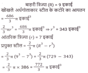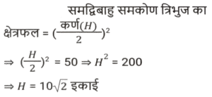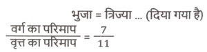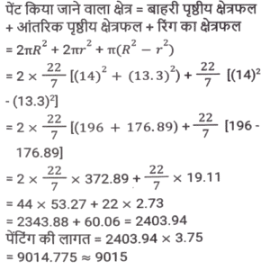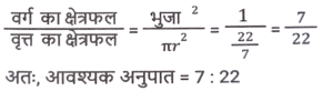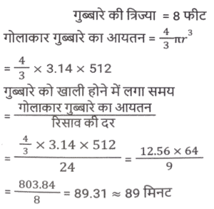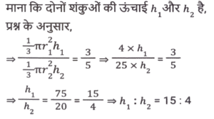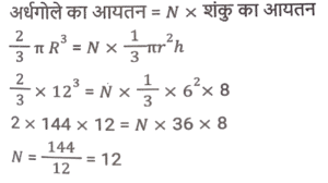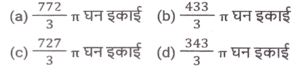 क्षेत्रमिति (Part-III)Total Questions: 5041. एक वृत्त की त्रिज्या एक वर्ग की भुजा के बराबर है। वर्ग और वृत्त के परिमापों (perimeters) का अनुपात 7:11 है, तो क्षेत्रफलों का अनुपात ____________ होगा। (π = 22/7 का प्रयोग करें) [SSC MTS 13/11/2024 (Afternoon)](a) 14:22(b) 22:14(c) 22:7(d) 7:22Correct Answer: (d) 7:22Solution:42. एक अर्धगोले के आकार वाले कटोरे का आंतरिक और बाह्य व्यास क्रमशः 26.6 cm और 28 cm है। ₹3.75/cm² की दर से, इसे पूरी तरह से पेंट करने की लागत (₹ में, निकटतम रुपये तक) क्या होगी ? (मानिए π =22/7). [SSC MTS 13/11/2024 (Afternoon)](a) 9,380(b) 9,015(c) 8,950(d) 9,000Correct Answer: (b) 9,015Solution:43. यदि दो लम्ब वृत्तीय बेलनों की त्रिज्याएँ 2 : 3 के अनुपात में हैं और उनकी ऊँचाई 5:4 के अनुपात में है, तो उनके वक्र पृष्ठीय क्षेत्रफलों का अनुपात ज्ञात करें। [SSC MTS 14/11/2024 (Morning)](a) 6:5(b) 5:6(c) 6:10(d) 10:6Correct Answer: (b) 5:6Solution:44. स्टील के एक खोखले अर्धगोलाकार कटोरे में, 686/3π घन इकाई द्रव रखा जा सकता है। इसकी बाह्य त्रिज्या 9 इकाई है। इस कटोरे को बनाने में कितना स्टील इस्तेमाल होगा ? [SSC MTS 14/11/2024 (Afternoon)](a)(b)(c)(d)Correct Answer: (a)Solution:45. एक गोलाकार विज्ञापन गुब्बारे से 24 क्यूबिक फीट प्रति मिनट की दर से हवा रिस रही है। यदि गुब्बारे की त्रिज्या 8 फीट है, तो गुब्बारे को खाली होने में कितना समय लगेगा? अपने उत्तर को निकटतम मिनट में दें। π के अनुमानित मान, जो कि 3.14 है का उपयोग करें। [SSC MTS 14/11/2024 (Afternoon)](a) 89 मिनट(b) 80 मिनट(c) 65 मिनट(d) 94 मिनटCorrect Answer: (a) 89 मिनटSolution:46. 12 cm त्रिज्या वाले एक ठोस अर्धगोले को N समान शंकुओं में पिघलाया जाता है, जिनकी प्रत्येक की त्रिज्या 6 cm और ऊंचाई 8 cm है। N का मान ज्ञात करें। [SSC MTS 14/11/2024 (Evening)](a) 12(b) 8(c) 10(d) 15Correct Answer: (a) 12Solution:47. दो शंकुओं की त्रिज्याओं का अनुपात 2: 5 और उनके आयतन का अनुपात 35 है। इनकी ऊंचाइयों का अनुपात क्या है ? [SSC CGL 09/09/2024 (1st Shift)](a) 15:4(b) 11:15(c) 13:11(d) 4:11Correct Answer: (a) 15:4Solution:48. यदि एक बेलन की त्रिज्या 8 cm और ऊँचाई 14 cm है, तो उस बेलन का आयतन (cm³ में) क्या होगा? (π = 22/7 लीजिए) [SSC CGL 09/09/2024 (2nd Shift)](a) 2686(b) 2816(c) 2784(d) 2456Correct Answer: (b) 2816Solution:49. 15.75 cm त्रिज्या वाले एक वृत्त से 11 cm की चाप लंबाई वाला त्रिज्यखंड काटा जाता है। इस त्रिज्यखंड का क्षेत्रफल (cm² में) ज्ञात कीजिए। [SSC CGL 09/09/2024 (2nd Shift)](a) 86.525(b) 86.625(c) 86.875(d) 86.125Correct Answer: (b) 86.625Solution:50. एक समकोण समद्विबाहु त्रिभुज का क्षेत्रफल 50 वर्ग इकाई है। इसके कर्ण की लंबाई (इकाई में) कितनी है? [SSC CGL 09/09/2024 (2nd Shift)](a) 10√3(b) 5√5(c) 10√2(d) 5√2Correct Answer: (c) 10√2Solution:Submit Quiz« Previous12345