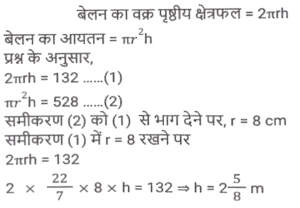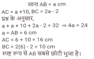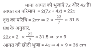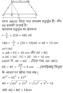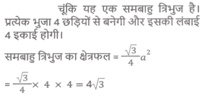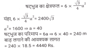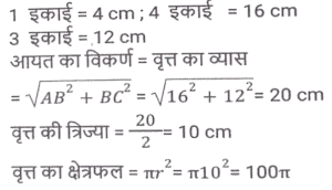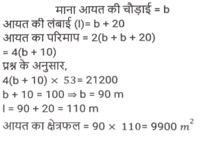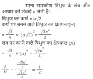 क्षेत्रमिति (Part-II)Total Questions: 5011. किसी समकोण समद्विबाहु त्रिभुज के कर्ण तथा एक लम्ब भुजा पर समबाहु त्रिभुज खींचे जाते हैं। उनके क्षेत्रफल क्रमश H और A हैं। A/H का मान किसके बराबर होगा ? [SSC CHSL 10/07/2019 (Afternoon)](a)(b)(c)(d)Correct Answer: (b)Solution:12. 12 छड़ियाँ, जिनमें से प्रत्येक की लंबाई 1 इकाई है, का इस्तेमाल किसी समबाहु त्रिभुज को बनाने के लिए किया जाता है। इस त्रिभुज का क्षेत्रफल होगा : [SSC CHSL 10/07/2019 (Morning)](a)(b)(c)(d)Correct Answer: (c)Solution:13. यदि किसी आयत की लंबाई को 11% से कम कर दिया जाए और इसकी चौड़ाई 11% से बढ़ा दी जाए, तो इसका क्षेत्रफल : [SSC CHSL 09/07/2019 (Afternoon)](a) 13.13% बढ़ जाएगा(b) 1.21% बढ़ जाएगा(c) 1.21% कम हो जाएगा(d) 13.13% कम हो जाएगाCorrect Answer: (c) 1.21% कम हो जाएगाSolution:14. त्रिभुज ABC में, BC की लंबाई AB की लंबाई के दोगुने से 2 कम है। AC की लंबाई AB की लंबाई से 10 सेमी अधिक है। यदि त्रिभुज का परिमाप 32 सेमी है। त्रिभुज की सबसे छोटी भुजा की लंबाई (सेमी में) ज्ञात करें। [SSC CHSL 05/07/2019 (Afternoon)](a) 4(b) 10(c) 8(d) 6Correct Answer: (d) 6Solution:15. एक समलंब चतुर्भुज की समानांतर भुजाएं 20 सेमी तथा 10 सेमी की हैं तथा इसकी गैर-समानांतर भुजाएं एक दूसरे के बराबर हैं। यदि इसका क्षेत्रफल 180 वर्ग सेमी है, तो प्रत्येक गैर-समानांतर भुजा की लंबाई ज्ञात करें । [SSC CHSL 04/07/2019 (Morning)](a) 11(b) 13(c) 12(d) 15Correct Answer: (b) 13Solution:16. एक आयताकार पार्क की लंबाई, इसकी चौड़ाई से 20 मीटर अधिक है। यदि 53 रु प्रति मीटर की दर से पार्क में बाड़ लगाने की लागत 21,200 है। तो पार्क का क्षेत्रफल (वर्ग मीटर में) क्या है? [SSC CHSL 03/07/2019 (Evening)](a) 9504(b) 8925(c) 9240(d) 9900Correct Answer: (d) 9900Solution:17. एक तार एक आयत के रूप में है जिसकी भुजाएं 7 : 4 के अनुपात में हैं। आरम्भ में यह वृत के आकर में था, जिसकी त्रिज्या लगभग 31.5 सेमी। आयत की छोटी भुजा की लंबाई कितनी है: [SSC CHSL 03/07/2019 (Afternoon)](a) 44 cm(b) 36 cm(c) 40 cm(d) 32cmCorrect Answer: (b) 36 cmSolution:18. एक वृत्त, एक आयत को घेरे हुए है है जिसकी भुजाएँ 4: 3 में हैं। यदि आयत की परिधि 56 सेमी है, तो वृत्त का क्षेत्रफल (वर्ग सेमी) क्या है? [SSC CHSL 03/07/2019 (Morning)](a) 70π(b) 96π(c) 90π(d) 100πCorrect Answer: (d) 100πSolution:19. एक बेलनाकार स्तम्भ का वक्र पृष्ठीय क्षेत्रफल और आयतन क्रमशः 132 वर्ग मीटर और 528 घन मीटर है। स्तम्भ की ऊंचाई (मीटर में) क्या है? [SSC CHSL 02/07/2019 (Afternoon)](a)(b)(c)(d)Correct Answer: (d)Solution:20. एक षट्भुज का क्षेत्रफल 2400/3 वर्ग मीटर है। 18.50 प्रति मीटर रुपये के हिसाब से इस पर बाड़ लगाने की लागत (Rs. में) क्या होगी ? [SSC CHSL 01/07/2019 (Evening)](a) 4440(b) 5920(c) 5550(d) 5180Correct Answer: (a) 4440Solution:Submit Quiz« Previous12345Next »