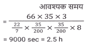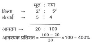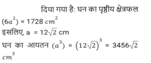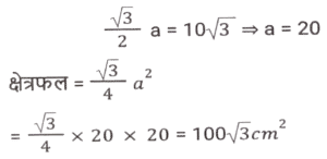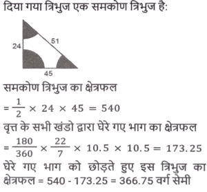 क्षेत्रमिति (Part-II)Total Questions: 5041. उस समकोण त्रिभुज का क्षेत्रफल (cm² में) क्या होगा जिसका आधार 24 cm और कर्ण (hypotenuse) 25 cm है: [SSC CPO 15/03/2019 (Evening)](a) 72(b) 108(c) 92(d) 84Correct Answer: (d) 84Solution:दिया गया है, एक समकोण त्रिभुज में कर्ण = 25, आधार = 24, फिर, ऊंचाई = 7क्षेत्रफल = 1/2 × 24 × 7 = 84 cm²42. 16 m लम्बे, 8 m चौड़े और 11m ऊंचे कमरे में कितना बड़े से बड़ा खम्बा रखा जा सकता है? [SSC CPO 15/03/2019 (Evening)](a) 21 m(b) 20 m(c) 18 m(d) 19 mCorrect Answer: (a) 21 mSolution:43. यदि किसी समबाहु त्रिभुज की ऊंचाई 10√3 सेमी है, तो क्षेत्रफल (cm² में) ज्ञात करें । [SSC CPO 15/03/2019 (Morning)](a) 124√3(b) 75√3(c) 80√3(d) 100√3Correct Answer: (d) 100√3Solution:44. एक स्विमिंग पूल के आयाम 66 मी x 35 मी x 3मी हैं। 35 सेमी व्यास वाले पाइप से इस स्विमिंग पूल को भरने में कितना समय लगेगा यदि जल प्रवाह की दर 8 मी/सेकंड है। [SSC CPO 15/03/2019 (Morning)](a) 2.75 h(b) 3.5 h(c) 2.5 h(d) 3.2 hCorrect Answer: (c) 2.5 hSolution:45. निम्नलिखित में से किस ठोस में सबसे अधिक शीर्ष होते है [SSC CPO 14/03/2019 (Evening)](a) घनाभ(b) त्रिकोणीय प्रिज्म(c) षट्कोणीय पिरामिड(d) चतुर्पाश्नीयCorrect Answer: (a) घनाभSolution:दिए गए ठोस आंकड़ों में। घनाभ की अधिकतम 8 शीर्ष संख्या होती है।46. किसी चतुर्भुज का एक विकर्ण 40 cm है। विपरीत सिरों से लम्ब की लम्बाई 7.5 cm और 8 .6 cm है। चतुर्भुज का क्षेत्रफल (cm² में) क्या है ? [SSC CPO 14/03/2019 (Evening)](a) 434(b) 322(c) 368(d) 28Correct Answer: (b) 322Solution:क्षेत्रफल= 20 × (7.5 + 8.6) = 322 cm²47. 64 वर्गों वाले एक शतरंज बोर्ड के प्रत्येक वर्ग का क्षेत्रफल 4 वर्ग सेमी है। यदि इस बोर्ड की सभी भुजाओं पर 2 सेमी का किनारा है, तो इस शतरंज बोर्ड का परिमाप ज्ञात करें। [SSC CPO 14/03/2019 (Morning)](a) 128cm(b) 80cm(c) 70cm(d) 256cmCorrect Answer: (b) 80cmSolution:चूंकि शतरंज की बिसात 2 सेमी भुजा वाले 64 वर्गों से बनी है और किनारे 2 सेमी मोटाई की है। इसलिए, शतरंज के प्रत्येक भुजा की लंबाई= 2 × 8 + 4 = 20परिमाप = 4 × 20 = 80cm48. एक त्रिभुज की भुजाएं 24 सेमी, 45 सेमी तथा 51 सेमी की हैं। इसके प्रत्येक शीर्ष पर 10.5 सेमी त्रिज्या वाले वृत्त खींचे जाते हैं। वृत्त के खंडो द्वारा घेरे गए भाग को छोड़ कर इस त्रिभुज का क्षेत्रफल ज्ञात करें ? [SSC CPO 13/03/2019 (Evening)](a) 244.75cm²(b) 366.75cm²(c) 464.75cm²(d) 327.75cm²Correct Answer: (b) 366.75cm²Solution:49. एक बेलन की त्रिज्या 150% बढ़ा दी जाती है तथा इसकी ऊंचाई 20% कम कर दी जाती है। इसके आयतन में कितने प्रतिशत की वृद्धि होगी ? [SSC CPO 12/03/2019 (Morning)](a) 400%(b) 600%(c) 500%(d) 80%Correct Answer: (a) 400%Solution:50. एक घन का पृष्ठीय क्षेत्रफल 1728 cm² है। इसका आयतन ज्ञात कीजिए। [SSC CHSL Tier II (18/11/2024)](a) 6453√2 cm³(b) 5436√2 cm³(c) 3456√2 cm³(d) 4356√2 cm³Correct Answer: (c) 3456√2 cm³Solution:Submit Quiz« Previous12345