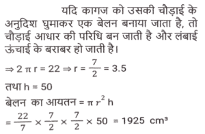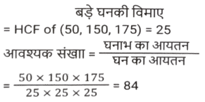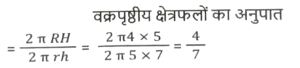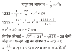 क्षेत्रमिति (Part-IV)Total Questions: 501. 10 cm त्रिज्या और 30° कोण वाले एक वृत्त के त्रिज्यखंड का परिमाप (cm में, एक दशमलव स्थान तक पूर्णांकित) कितना होगा? (π = 3.14 का उपयोग कीजिए) [SSC CGL 09/09/2024 (3rd Shift)](a) 20.4(b) 35.7(c) 82.8(d) 25.2Correct Answer: (d) 25.2Solution:2. यदि 24 cm ऊँचाई वाले एक लम्ब वृत्तीय शंकु का आयतन 1232 cm³ है, तो शंकु का संपूर्ण पृष्ठीय क्षेत्रफल क्या है (π = 22/7 का उपयोग कीजिए) [SSC CGL 10/09/2024 (1st Shift)](a) 806cm²(b) 704cm²(c) 904cm²(d) 608cm²Correct Answer: (b) 704cm²Solution:3. कागज का एक आयताकार टुकड़ा 50 cm लंबा और 22 cm चौड़ा है। यदि कागज को उसकी चौड़ाई के साथ लपेटकर एक बेलन बनाया जाता है, तो बेलन का आयतन कितना होगा ? [SSC CGL 11/09/2025 (3rd Shift)](a) 2,125cm³(b) 1,925cm³(c) 2,025cm³(d) 1,825cm³Correct Answer: (b) 1,925cm³Solution:4. एक आयताकार आंगन 4m 95cm लंबा और 16m 65cm चौड़ा है। इसे समान आकार की वर्गाकार टाइलों से पक्का किया जाना है। आयताकार आंगन को पक्का करने के लिए आवश्यक ऐसी वर्गाकार टाइलों की न्यूनतम संख्या ज्ञात कीजिए। [SSC CGL 11/09/2024 (1st Shift)](a) 877(b) 944(c) 388(d) 407Correct Answer: (d) 407Solution:5. एक वृत्ताकार पथ की आंतरिक और बाहरी त्रिज्याएँ क्रमशः 28m और 25 m हैं। ₹28 प्रति m² की दर से पथ को समतल करने की लागत (₹ में) कितनी है? (π = 22/7 का उपयोग कीजिए) [SSC CGL 11/09/2024 (1st Shift)](a) 15,421(b) 13,992(c) 11,229(d) 17,355Correct Answer: (b) 13,992Solution:6. यदि एक समबाहु त्रिभुज का परिमाप 36 इकाई है, तो इसका क्षेत्रफल (वर्ग इकाई में) है, कितना होगा? [SSC CGL 11/09/2024 (1st Shift)](a) 144√2(b) 36√2(c) 144√3(d) 36√3Correct Answer: (d) 36√3Solution:7. यदि दो समरूप त्रिभुजों के क्षेत्रफलों का अनुपात 25: 144 है, तो उनकी संगत भुजाओं का अनुपात क्या होगा? [SSC CGL 11/09/2024 (2nd Shift)](a) 5:12(b) 5:144(c) 25:12(d) 12:5Correct Answer: (a) 5:12Solution:8. 50 cm, 150 cm, 175 cm विमाओं वाले एक घनाभ को एक जैसे कितने विशालतम घनों में विभाजित किया जा सकता है? [SSC CGL 11/09/2024 (3rd Shift)](a) 75(b) 84(c) 85(d) 90Correct Answer: (b) 84Solution:9. एक बेलन की ऊँचाई 20 cm है। पार्श्व पृष्ठ का क्षेत्रफल 1760 cm² है। इसका आयतन क्या है ? [SSC CGL 12/09/2024 (1st Shift)](a) 12032 cm³(b) 12302 cm³(c) 12203 cm³(d) 12320 cm³Correct Answer: (d) 12320 cm³Solution:10. दो बेलनों के आधारों की त्रिज्याएँ 4 : 5 के अनुपात में हैं और उनकी ऊँचाइयाँ 5 : 7 के अनुपात में हैं। उनके वक्रपृष्ठीय क्षेत्रफलों का अनुपात ज्ञात कीजिए। [SSC CGL 12/09/2024 (2nd Shift)](a) 5:4(b) 4:7(c) 1:2(d) 4:5Correct Answer: (b) 4:7Solution:Submit Quiz12345Next »