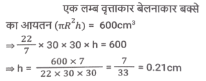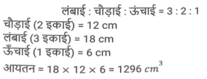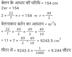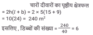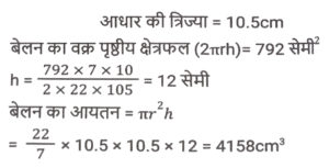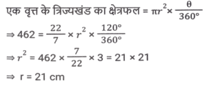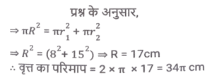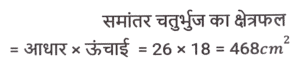 क्षेत्रमिति (Part-IV)Total Questions: 5031. 26 cm आधार और 18 cm ऊंचाई वाले समांतर चतुर्भुज का क्षेत्रफल क्या होगा ? [SSC CGL 19/09/2024 (1st Shift)](a) 234 cm²(b) 936 cm²(c) 932 cm²(d) 468 cm²Correct Answer: (d) 468 cm²Solution:32. एक वृत्ताकार बेलन की आधार त्रिज्या 10.5 cm है। यदि इसके वक्र पृष्ठ का क्षेत्रफल 792 cm² है, तो बेलन का आयतन क्या है? [SSC CGL 19/09/2024 (2nd Shift)](a) 4185 cm³(b) 4518 cm³(c) 4152 cm³(d) 4158 cm³Correct Answer: (d) 4158 cm³Solution:33. एक आयताकार मैदान की लंबाई और चौड़ाई का योग 9 cm और क्षेत्रफल 18 cm² है। यदि लंबाई 'a' है और चौड़ाई 'b' है, तो (a² - ab + b²) का मान ज्ञात कीजिए। [SSC CGL 19/09/2024 (3rd Shift)](a) 36(b) 24(c) 18(d) 27Correct Answer: (d) 27Solution:34. यदि किसी वृत्त के त्रिज्यखंड का क्षेत्रफल 462 cm² है और केंद्रीय कोण (central angle) 120° है, तो इसकी त्रिज्या _________ होगी। [SSC CGL 19/09/2024 (3rd Shift)](a) 18 cm(b) 17 cm(c) 21 cm(d) 14 cmCorrect Answer: (c) 21 cmSolution:35. एक बंद घन का संपूर्ण पृष्ठीय क्षेत्रफल 1152 cm² दिया गया है। घन की प्रत्येक भुजा की लंबाई (cm में) क्या है? [SSC CGL 19/09/2024 (3rd Shift)](a) 9√2(b) 4√13(c) 8√3(d) 8√2Correct Answer: (c) 8√3Solution:36. एक कमरे की लंबाई, चौड़ाई और ऊँचाई क्रमशः 15 m, 9 m और 5 m है। पेंट के एक डिब्बे से 40 वर्ग मीटर क्षेत्रफल को पेंट किया जा सकता है। केवल कमरे की दीवारों को पेंट करने के लिए पेंट के कितने डिब्बों की आवश्यकता होगी ? [SSC CGL 23/09/2024 (2nd Shift)](a) 12(b) 6(c) 4(d) 8Correct Answer: (b) 6Solution:37. 30 cm त्रिज्या वाले एक लम्ब वृत्तीय बेलनाकार बॉक्स का आयतन 600 cm³ है। बॉक्स की ऊंचाई ज्ञात करें। [SSC CGL 24/09/2024 (1st Shift)](a) 0.61cm(b) 0.31cm(c) 0.51cm(d) 0.21cmCorrect Answer: (d) 0.21cmSolution:38. दो वृत्तों की त्रिज्याएं 8 cm और 15 cm हैं। उस वृत्त की परिधि (perimeter) ज्ञात कीजिए (cm में), जिसका क्षेत्रफल दोनों वृत्तों के क्षेत्रफलों के योगफल के बराबर है। [SSC CGL 24/09/2024 (2nd Shift)](a) 32π(b) 30π(c) 28π(d) 34πCorrect Answer: (d) 34πSolution:39. एक ठोस घनाभ की लंबाई, चौड़ाई और ऊंचाई का अनुपात 3 : 2 :1 दिया गया है और इस घनाभ की चौड़ाई 12cm दी गई है। घनाभका आयतन (cm³ में) ज्ञात कीजिए। [SSC CGL 24/09/2024 (3rd Shift)](a) 1250(b) 1296(c) 1200(d) 1500Correct Answer: (b) 1296Solution:40. किसी बेलनाकार बर्तन के आधार की परिधि 154 cm है और इसकी ऊँचाई 49 mm है। इसमें कितने लीटर पानी आ सकता है? (दशमलव के तीन स्थानों तक शुद्ध, π = 22/7 का उपयोग कीजिए) [SSC CGL 25/09/2024 (1st Shift)](a) 9.244(b) 2.439(c) 3.924(d) 4.329Correct Answer: (a) 9.244Solution:Submit Quiz« Previous12345Next »