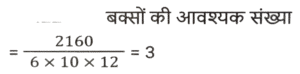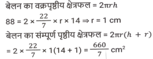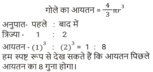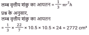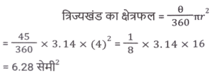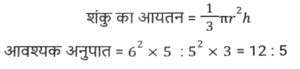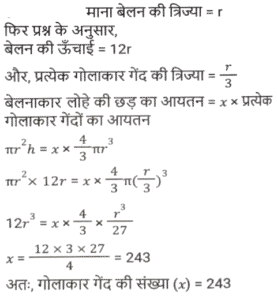 क्षेत्रमिति (Part-V)Total Questions: 5021. एक गत्ते के डिब्बे की आंतरिक लंबाई, चौड़ाई और ऊंचाई क्रमशः 6 cm, 10cm और 12 cm है। ऐसे कितने डिब्बों की आवश्यकता होगी जिनमें 2160 cm³ आयतन वाले घनों को पैक किया जा सके? [SSC CHSL 03/07/2024 (1st Shift)](a) 6(b) 5(c) 3(d) 4Correct Answer: (c) 3Solution:22. दो शंकुओं की ऊँचाइयों का अनुपात 5: 3 है और उनकी त्रिज्याएँ 6:5 के अनुपात में हैं। उनके आयतनों का अनुपात ज्ञात कीजिए। [SSC CHSL 03/07/2024 (1st Shift)](a) 10 : 5(b) 13 : 5(c) 12 : 5(d) 11 : 5Correct Answer: (c) 12 : 5Solution:23. यदि किसी गोले की त्रिज्या दोगुनी कर दी जाए, तो गोले का आयतन पिछले आयतन का ___________ गुना हो जाता है। [SSC CHSL 03/07/2024 (1st Shift)](a) दो(b) एक(c) आठ(d) चारCorrect Answer: (c) आठSolution:24. 14 cm ऊँचाई वाले एक लम्ब वृत्तीय बेलन का वक्र पृष्ठीय 88 cm² है। बेलन का कुल पृष्ठीय क्षेत्रफल ज्ञात करें। [SSC CHSL 03/07/2024 (2nd Shift)](a)(b)(c)(d)Correct Answer: (b)Solution:25. एक आयताकार मैदान का क्षेत्रफल 3600 m² है। यदि मैदान 45m लंबा है, तो इसका परिमाप क्या है? [SSC CHSL 03/07/2024 (2nd Shift)](a) 255 m(b) 260 m(c) 250 m(d) 265 mCorrect Answer: (c) 250 mSolution:26. यदि एक घनाभ का पृष्ठीय क्षेत्रफल 108 m² है, तो घनाभ की ऊंचाई ज्ञात कीजिए, जिसकी लंबाई 6 m और चौड़ाई 3 m है। [SSC CHSL 03/07/2024 (2nd Shift)](a) 5.5 m(b) 5m(c) 4.5m(d) 4 mCorrect Answer: (d) 4 mSolution:27. 4 इकाई त्रिज्या वाले किसी दिए गए वृत्त के लिए, इसके त्रिज्यखंड का कोण 45° है। त्रिज्यखंड का क्षेत्रफल (cm² में) ज्ञात कीजिए। ( π = 3.14 का प्रयोग कीजिए।) [SSC CHSL 03/07/2024 (3rd Shift)](a) 7.28(b) 6.28(c) 6.18(d) 7.18Correct Answer: (b) 6.28Solution:28. यदि एक लंब वृत्तीय शंकु की ऊँचाई 24 cm है और उसके आधार की त्रिज्या 10.5 cm है, तो लंब वृत्तीय शंकु का आयतन (cm³ में) है। (π = 22/7 का प्रयोग करें)) [SSC CHSL 03/07/2024 (3rd Shift)](a) 2727(b) 2772(c) 2277(d) 2237Correct Answer: (b) 2772Solution:29. यदि किसी गोले की त्रिज्या में 12 प्रतिशत की वृद्धि की जाती है, तो आयतन में लगभग कितनी वृद्धि होगी? [SSC CHSL 03/07/2024 (3rd Shift)](a) 41.49 प्रतिशत(b) 45.49 प्रतिशत(c) 40.49 प्रतिशत(d) 42.5 प्रतिशतCorrect Answer: (c) 40.49 प्रतिशतSolution:30. लोहे की एक बेलनाकार छड़ जिसकी ऊंचाई इसकी त्रिज्या से बारह गुना है, को पिघलाकर गोलाकार गेंदों में ढाला जाता है, जिनमें से प्रत्येक की त्रिज्या, बेलन की त्रिज्या की एक तिहाई है। गोलाकार गेंदों की संख्या ज्ञात कीजिए। [SSC CHSL 03/07/2024 (4th Shift)](a) 243(b) 198(c) 224(d) 212Correct Answer: (a) 243Solution:Submit Quiz« Previous12345Next »