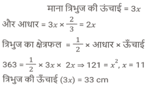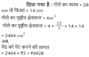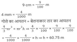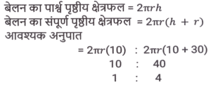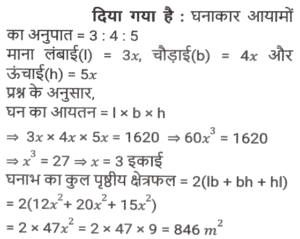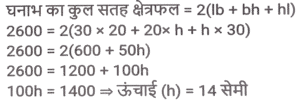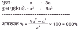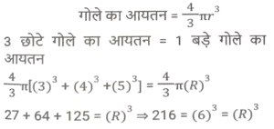 क्षेत्रमिति (Part-V)Total Questions: 5041. यदि एक ठोस लम्बवृत्तीय बेलन की ऊंचाई 27 cm है और इसके आधार का व्यास 30 cm है. तो लम्बवृत्तीय बेलन का कुल पृष्ठीय क्षेत्रफल (cm² में) कितना है? (π = 22/7 का प्रयोग करें) [SSC CHSL 04/07/2024 (4th Shift)](a) 3978(b) 3960(c) 3976(d) 3964Correct Answer: (b) 3960Solution:42. 6 cm, 8 cm और 10 cm व्यास वाले 3 ठोस गोलों को एक साथ पिघलाकर एक ठोस गोला बनाया जाता है। इसकी त्रिज्या ज्ञात कीजिए। [SSC CHSL 04/07/2024 (4th Shift)](a) 3 cm(b) 12 cm(c) 9 cm(d) 6 cmCorrect Answer: (d) 6 cmSolution:43. 60 cm आधार व्यास और 10 cm ऊंचाई वाले एक बेलन के पार्श्व पृष्ठीय क्षेत्रफल और संपूर्ण पृष्ठीय क्षेत्रफल का अनुपात क्या होगा ? [SSC CHSL 04/07/2024 (4th Shift)](a) 1:9(b) 1:3(c) 1:7(d) 1:4Correct Answer: (d) 1:4Solution:44. एक घनाभ की लंबाई, चौड़ाई और ऊँचाई का अनुपात 3 : 4 : 5 है। यदि घनाभ का आयतन 1620 m³ है, तो घनाभ का संपूर्णपृष्ठीय क्षेत्रफल ज्ञात कीजिए। [SSC CHSL 05/07/2024 (1st Shift)](a) 646 m²(b) 846 m²(c) 423 m²(d) 712 m²Correct Answer: (b) 846 m²Solution:45. एक बेलनाकार तेल की टंकी की त्रिज्या 5m और उसका कुल पृष्ठीय क्षेत्रफल 628 m² है। इसका वक्र पृष्ठीय क्षेत्रफल क्या होगा? (दशमलव के 2 स्थानों तक सन्निकटित) [SSC CHSL 05/07/2024 (1st Shift)](a) 401.43 m²(b) 371.83 m²(c) 470.8 m²(d) 481.43 m²Correct Answer: (c) 470.8 m²Solution:46. राजेश एक फुटबॉल से खेल रहा है जिसका व्यास 28 cm है। वह इस पूरी बॉल पर अपने पसंदीदा खिलाड़ी की तस्वीर पेंट कराना चाहता है। पेंटर ₹2/cm² का शुल्क लेता है। बॉल को पेंट करने की लागत (₹ में) क्या होगी? (π = 22/7) [SSC CHSL 05/07/2024 (1st Shift)](a) 4,928(b) 2,414(c) 4,828(d) 2,464Correct Answer: (a) 4,928Solution:47. 9 cm की त्रिज्या वाले तांबे के एक ठोस गोले को 4 mm की त्रिज्या के एक तार में ढाला जाता है। तार की लंबाई ज्ञात कीजिए। [SSC CHSL 05/07/2024 (2nd Shift)](a) 70.25 m(b) 60.75 m(c) 20.75 m(d) 65.25 mCorrect Answer: (b) 60.75 mSolution:48. उस त्रिभुज की ऊँचाई ज्ञात कीजिए जिसका आधार उसकी ऊँचाई का दो-तिहाई है और जिसका क्षेत्रफल 363 cm² है। [SSC CHSL 05/07/2024 (2nd Shift)](a) 33 cm(b) 27 cm(c) 29 cm(d) 31 cmCorrect Answer: (a) 33 cmSolution:49. यदि किसी घन की भुजा को तिगुना कर दिया जाए तो, उस घन के पृष्ठीय क्षेत्रफल में प्रतिशत वृद्धि ज्ञात कीजिए। [SSC CHSL 05/07/2024 (3rd Shift)](a) 700%(b) 800%(c) 650%(d) 500%Correct Answer: (b) 800%Solution:50. यदि किसी घनाभ की लंबाई, चौड़ाई और कुल पृष्ठीय क्षेत्रफल क्रमशः 30 cm, 20 cm और 2600 cm² है, तो इसकी ऊंचाई ज्ञात कीजिए। [SSC CHSL 05/07/2024 (3rd Shift)](a) 50 cm(b) 30 cm(c) 14 cm(d) 15 cmCorrect Answer: (c) 14 cmSolution:Submit Quiz« Previous12345